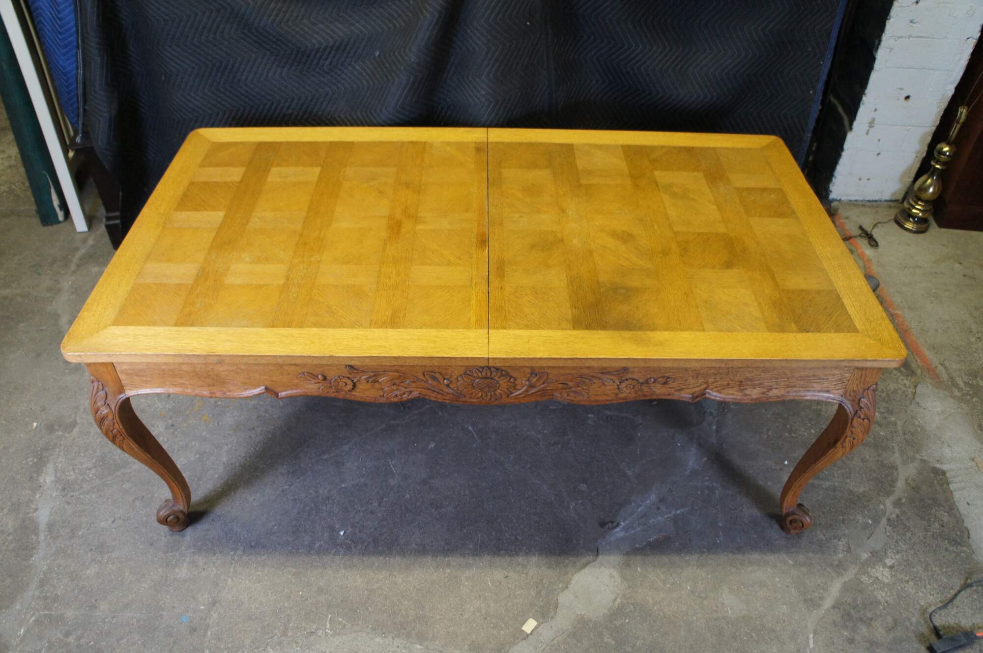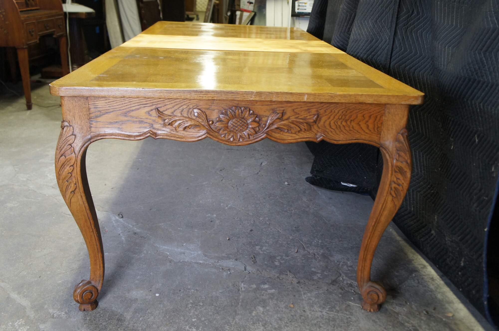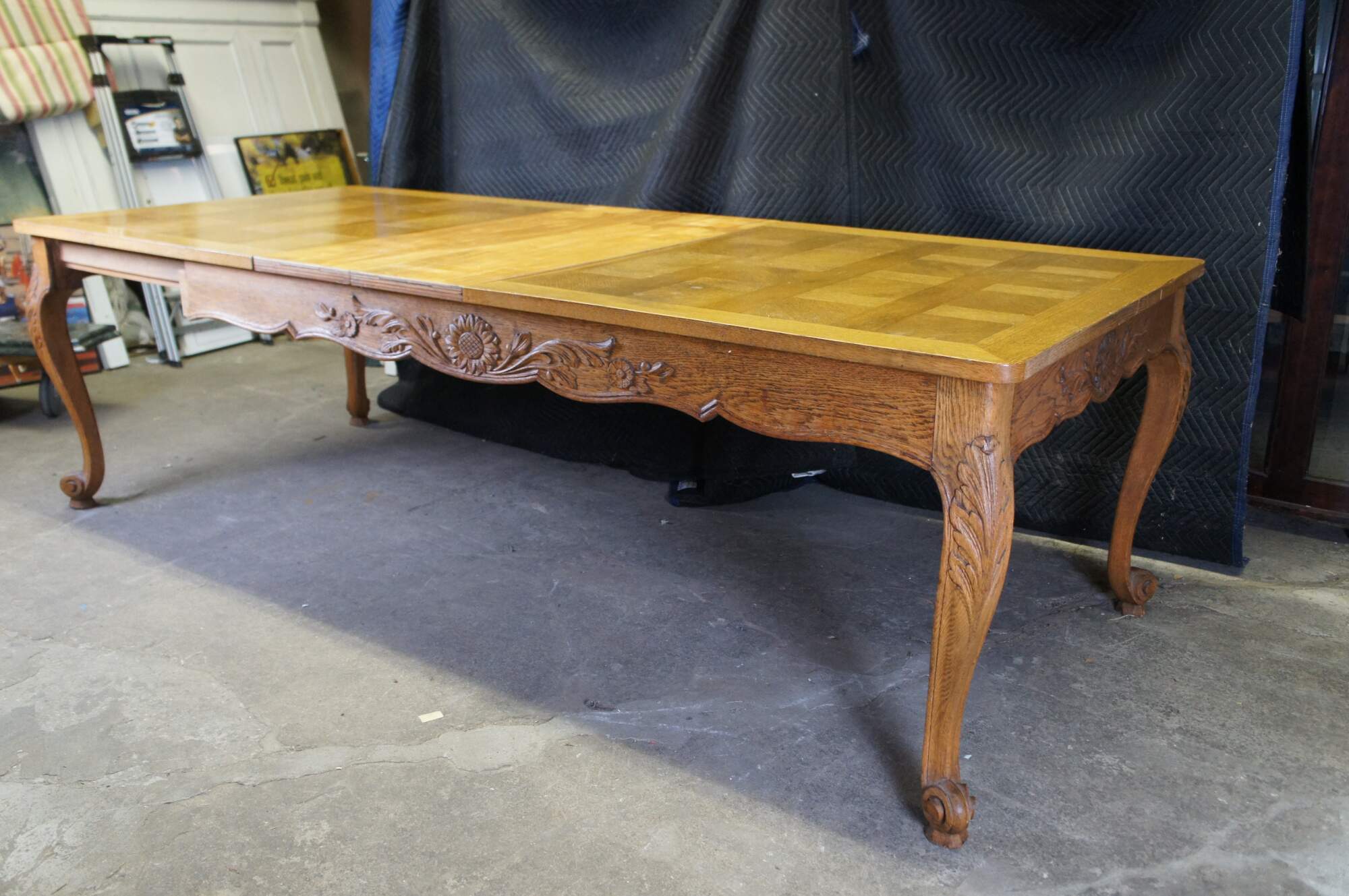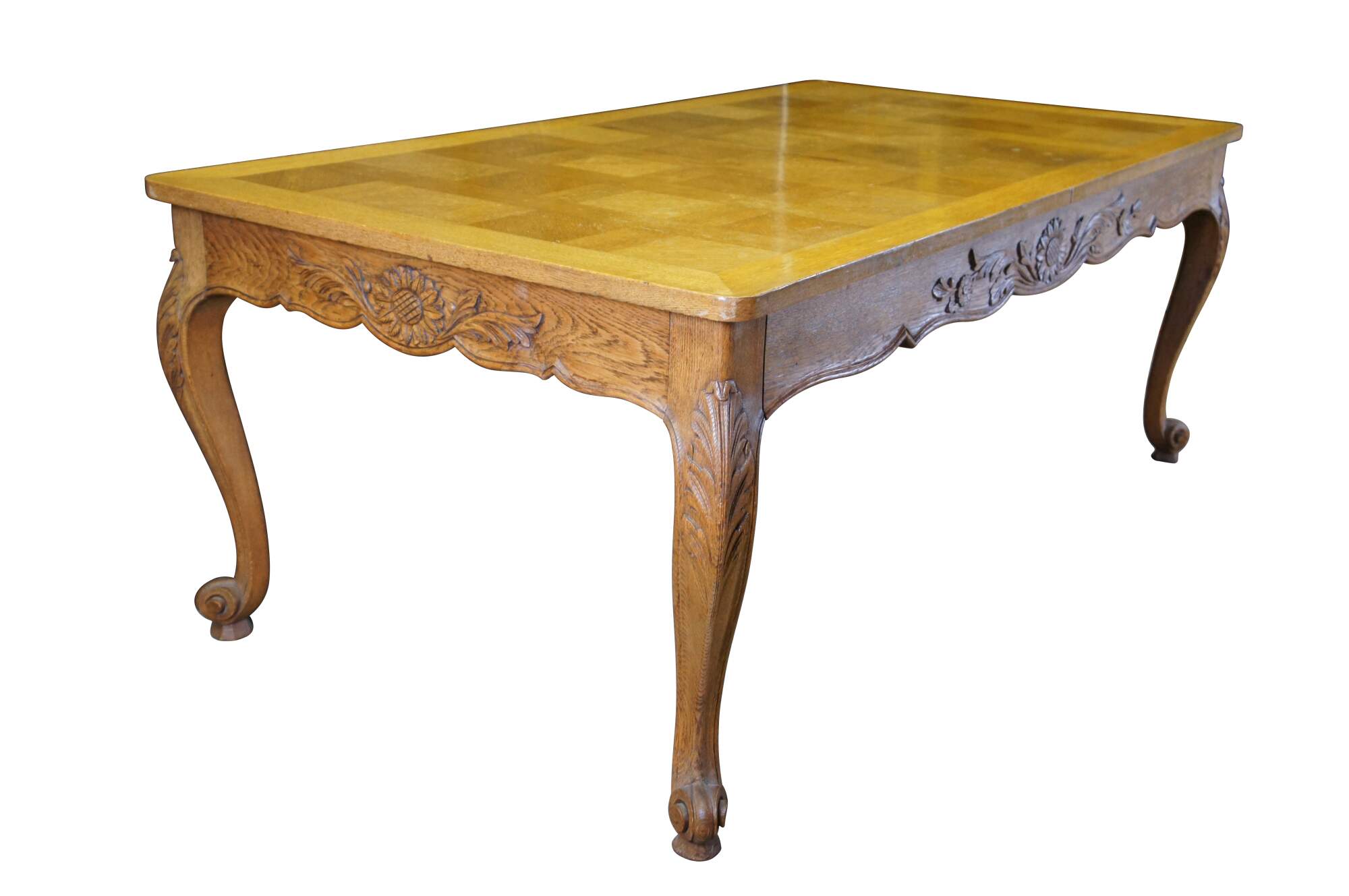 Antique French country / louis xv / farmhouse dining table. Made of oak featuring a geometric parquetry top with serpentine skirt carved with floral sunflower and acanthus design, supported by thick scrolled cabriole legs.