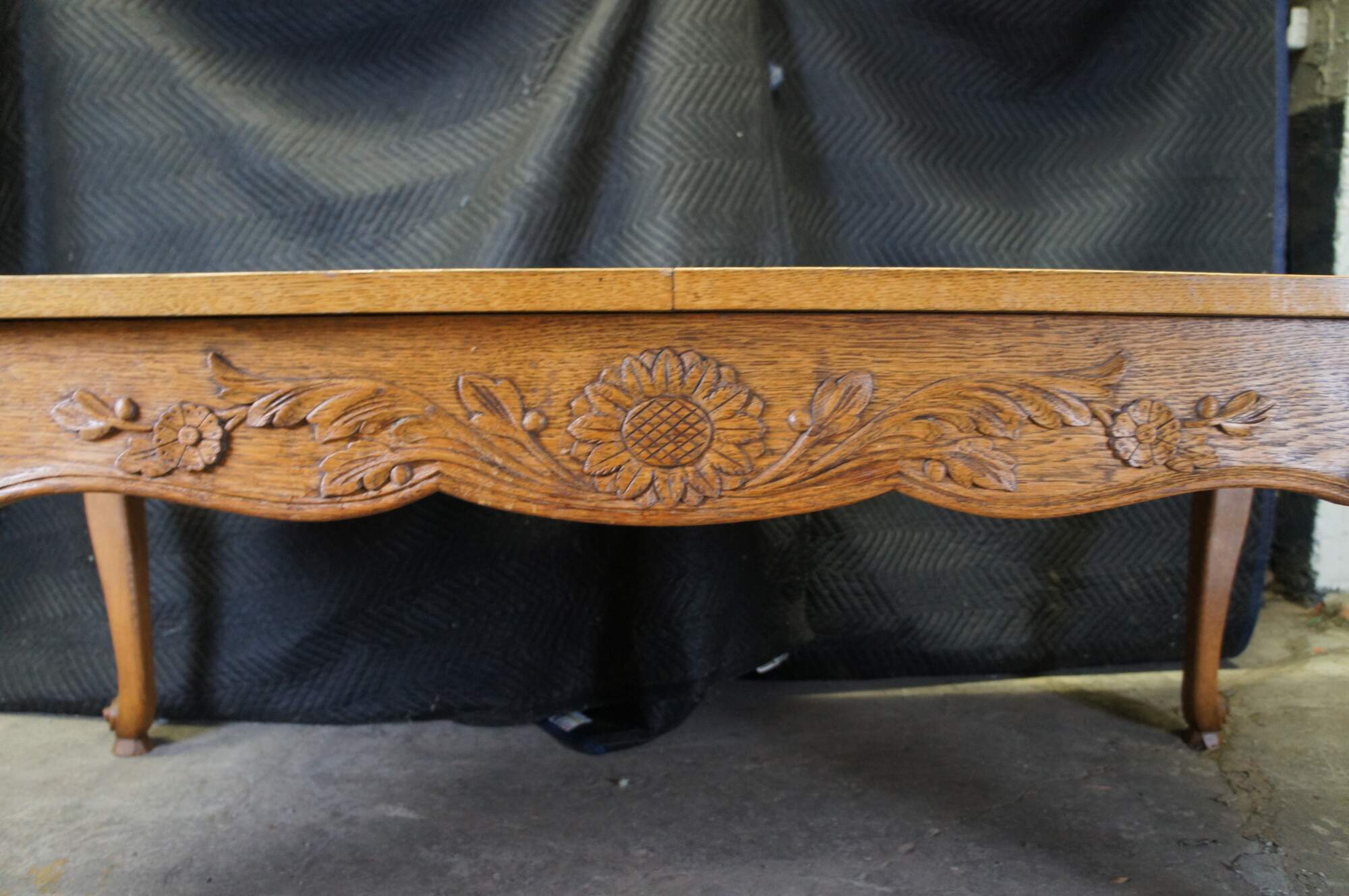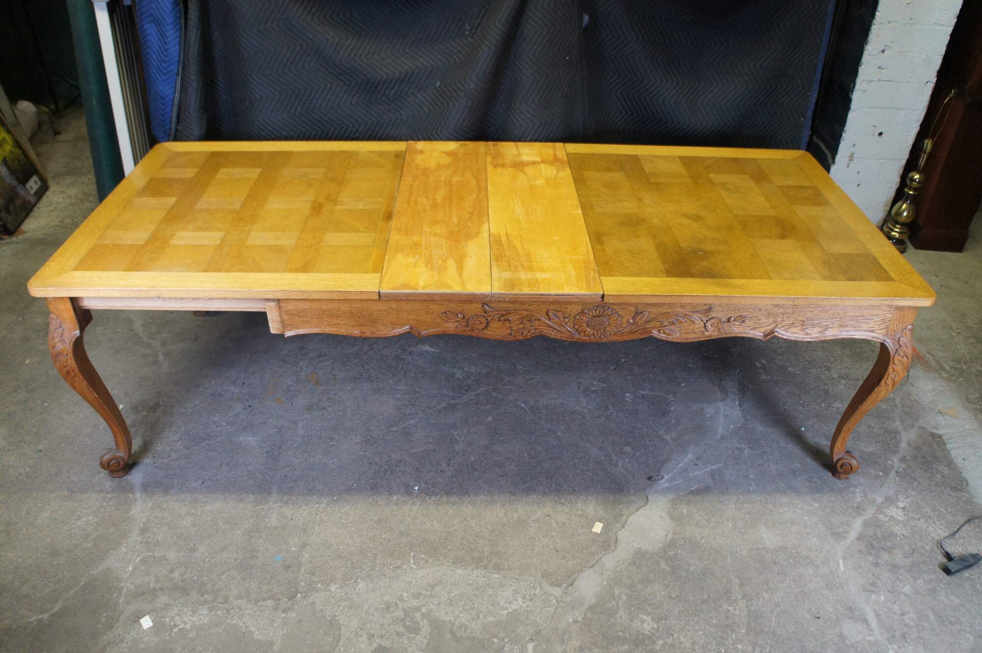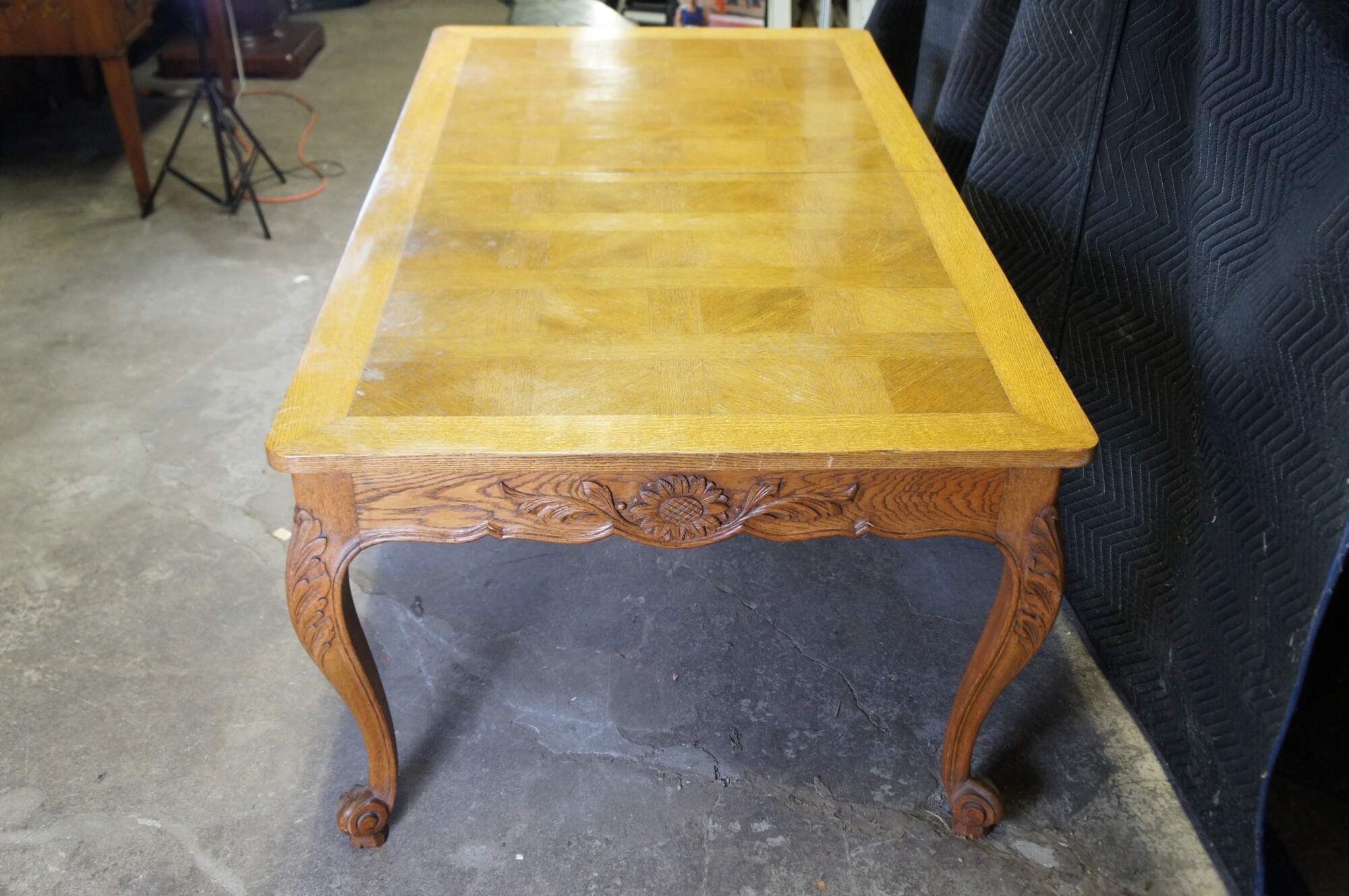 Antique French country / louis xv / farmhouse dining table. Made of oak featuring a geometric parquetry top with serpentine skirt carved with floral sunflower and acanthus design, supported by thick scrolled cabriole legs.