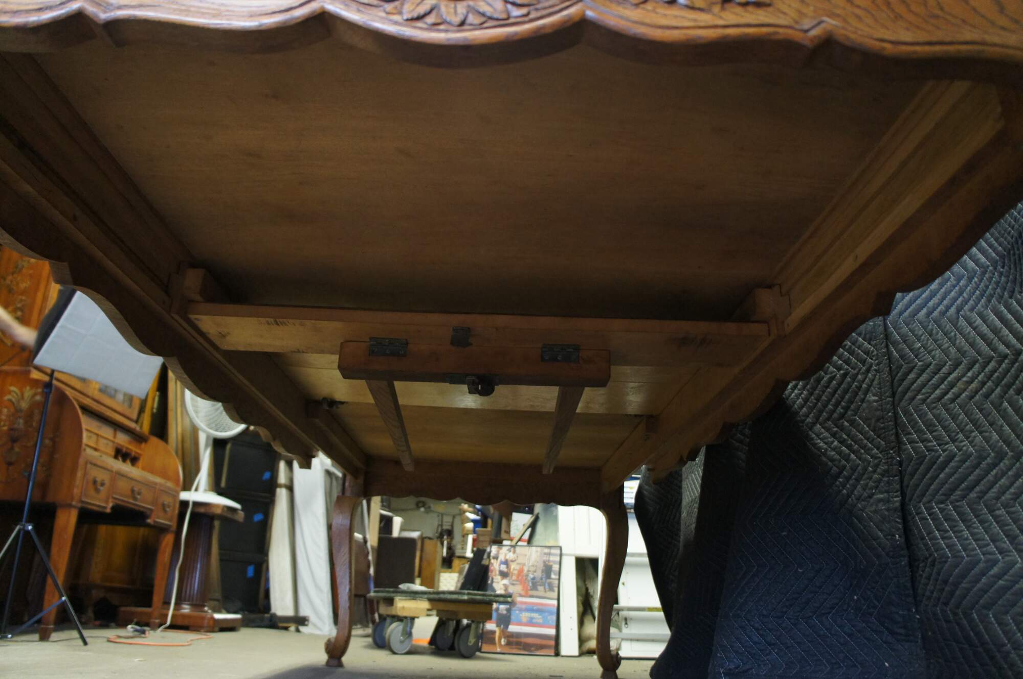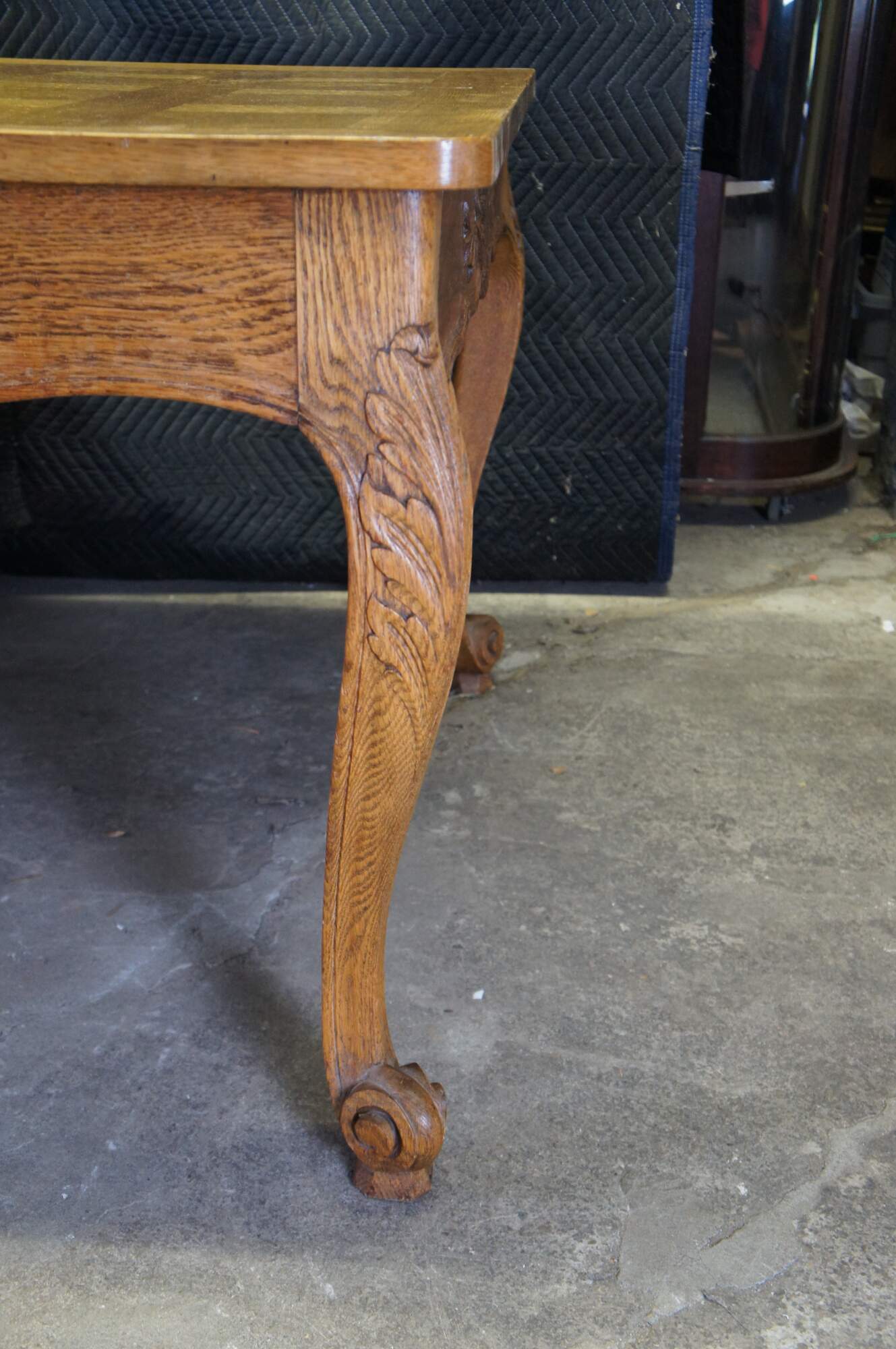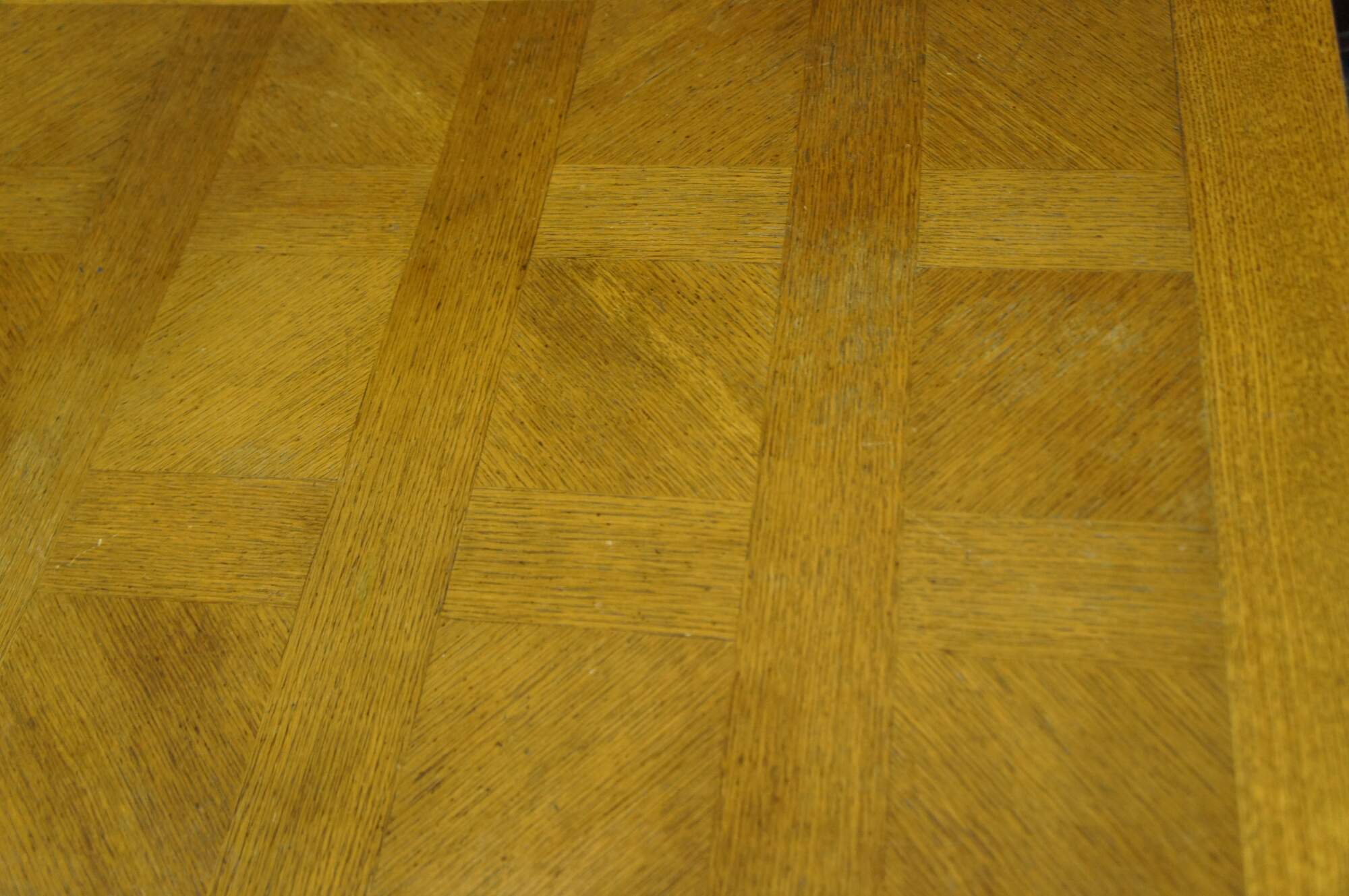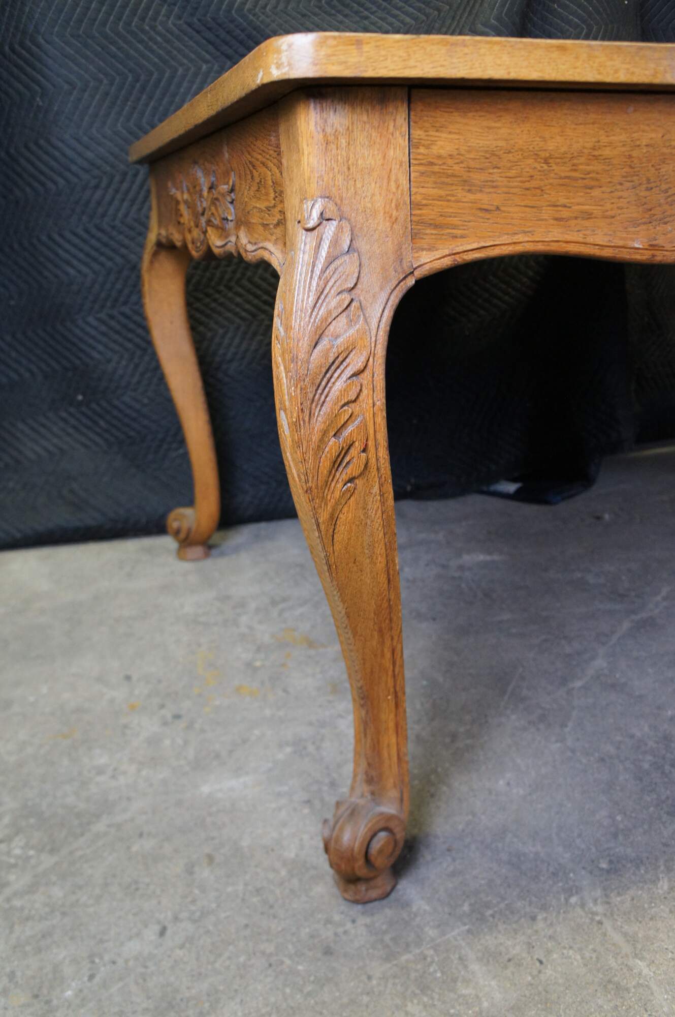 Antique French country / louis xv / farmhouse dining table. Made of oak featuring a geometric parquetry top with serpentine skirt carved with floral sunflower and acanthus design, supported by thick scrolled cabriole legs.