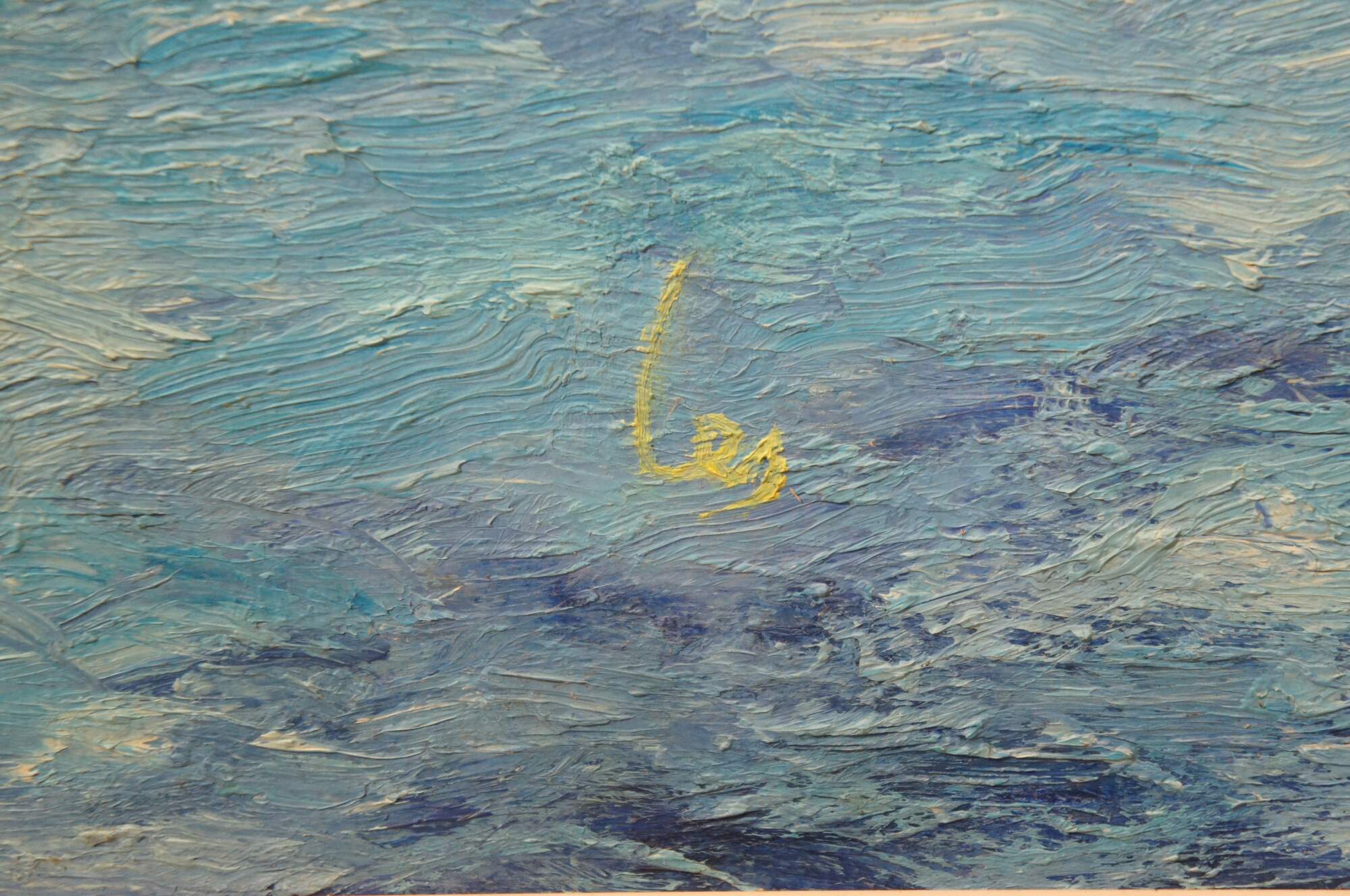 Mid to late 20th century impressionist oil painting on board depicting large pink and white water lilies / blossoms and lily pads on blue water. Signed Les in lower right corner. Pink rounded plastic frame.