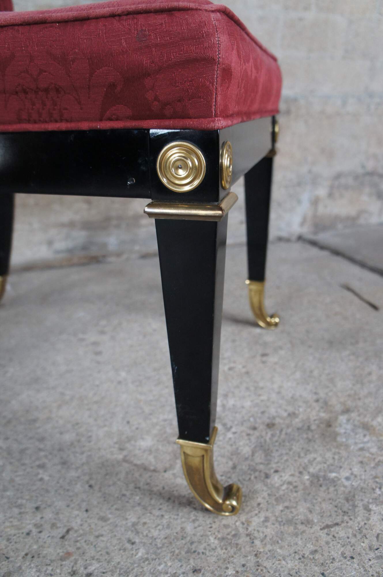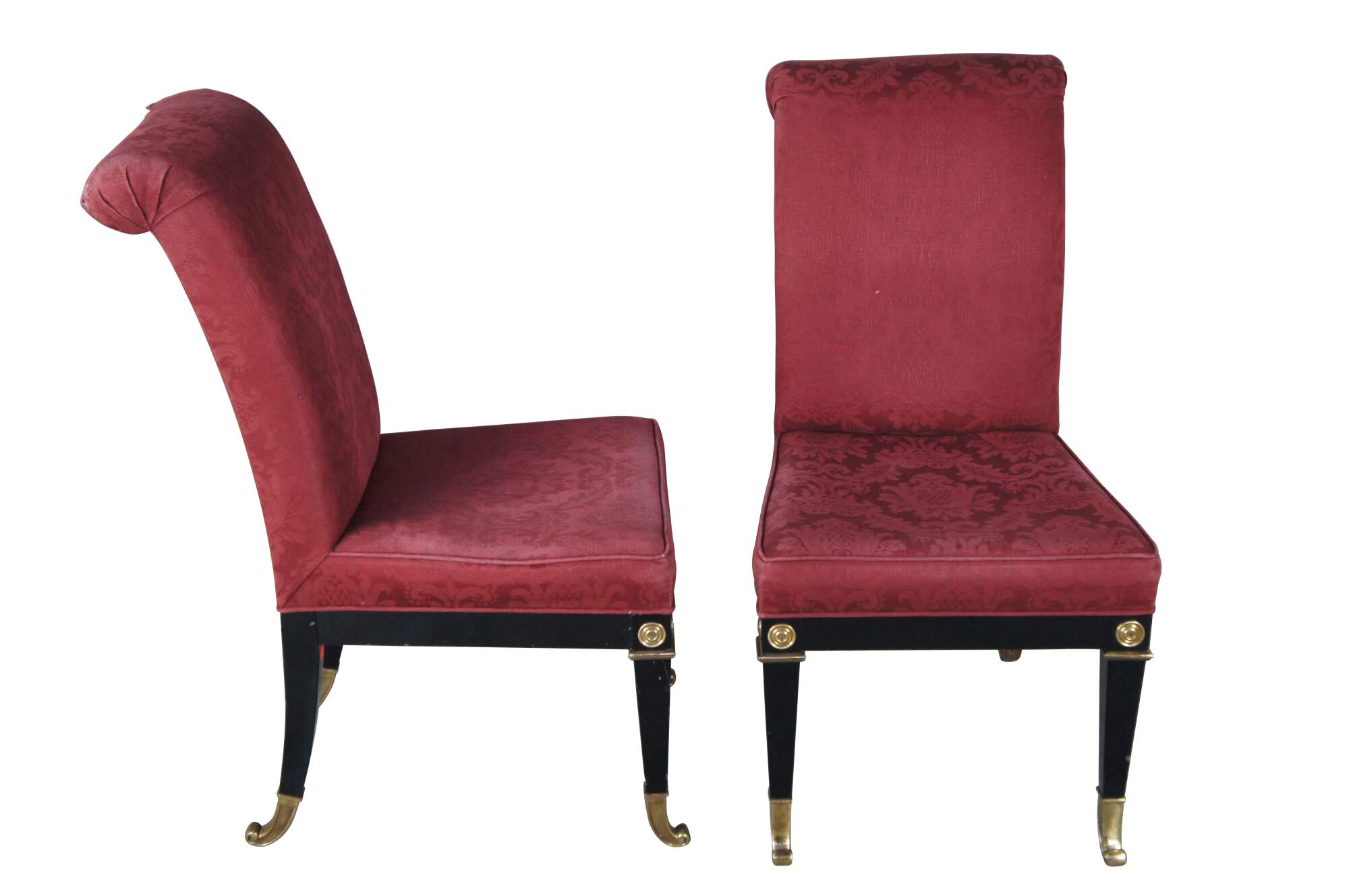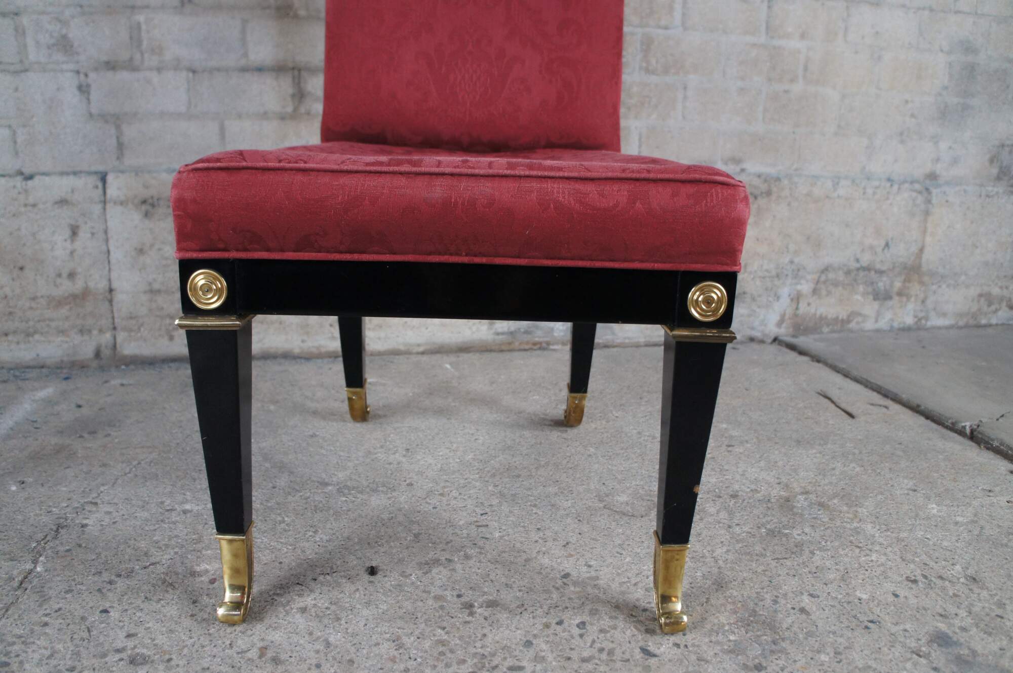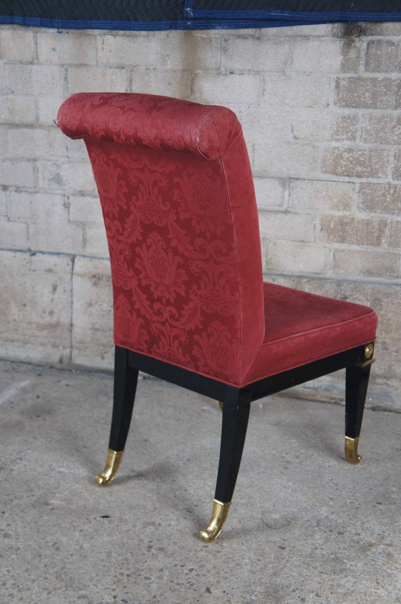 Four mid century Mastercraft Empire / Regency style side dining chairs featuring rolled back with black lacquered base and brass capped feet.