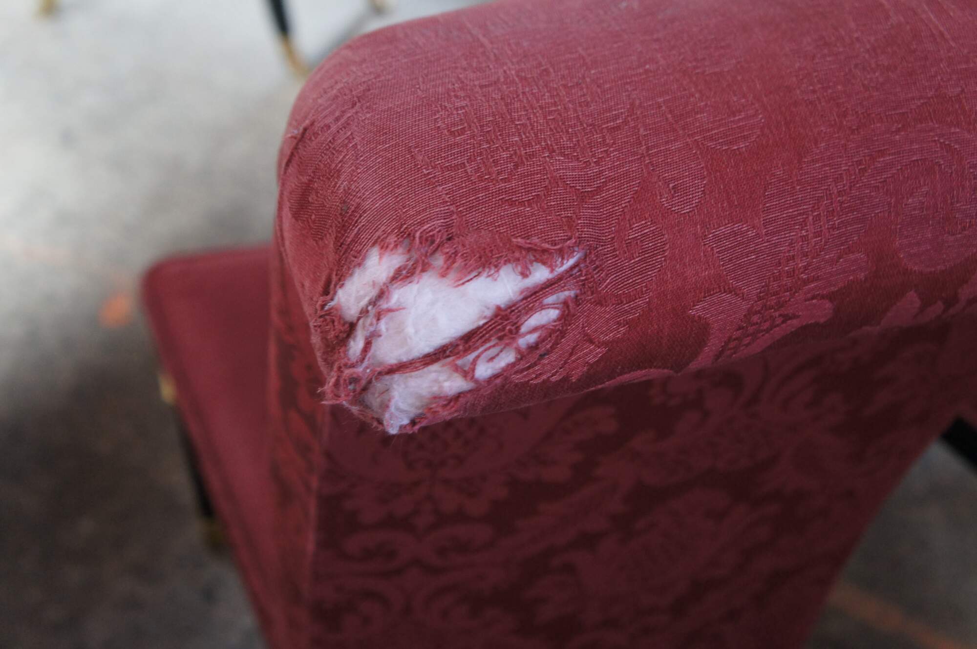 Fair condition, wear and distressing commensurate with age and use, distressing to cushions and fabric/fading, scuffing, finish loss to base.