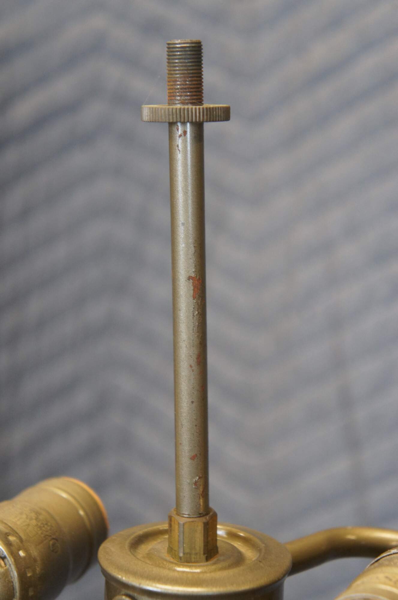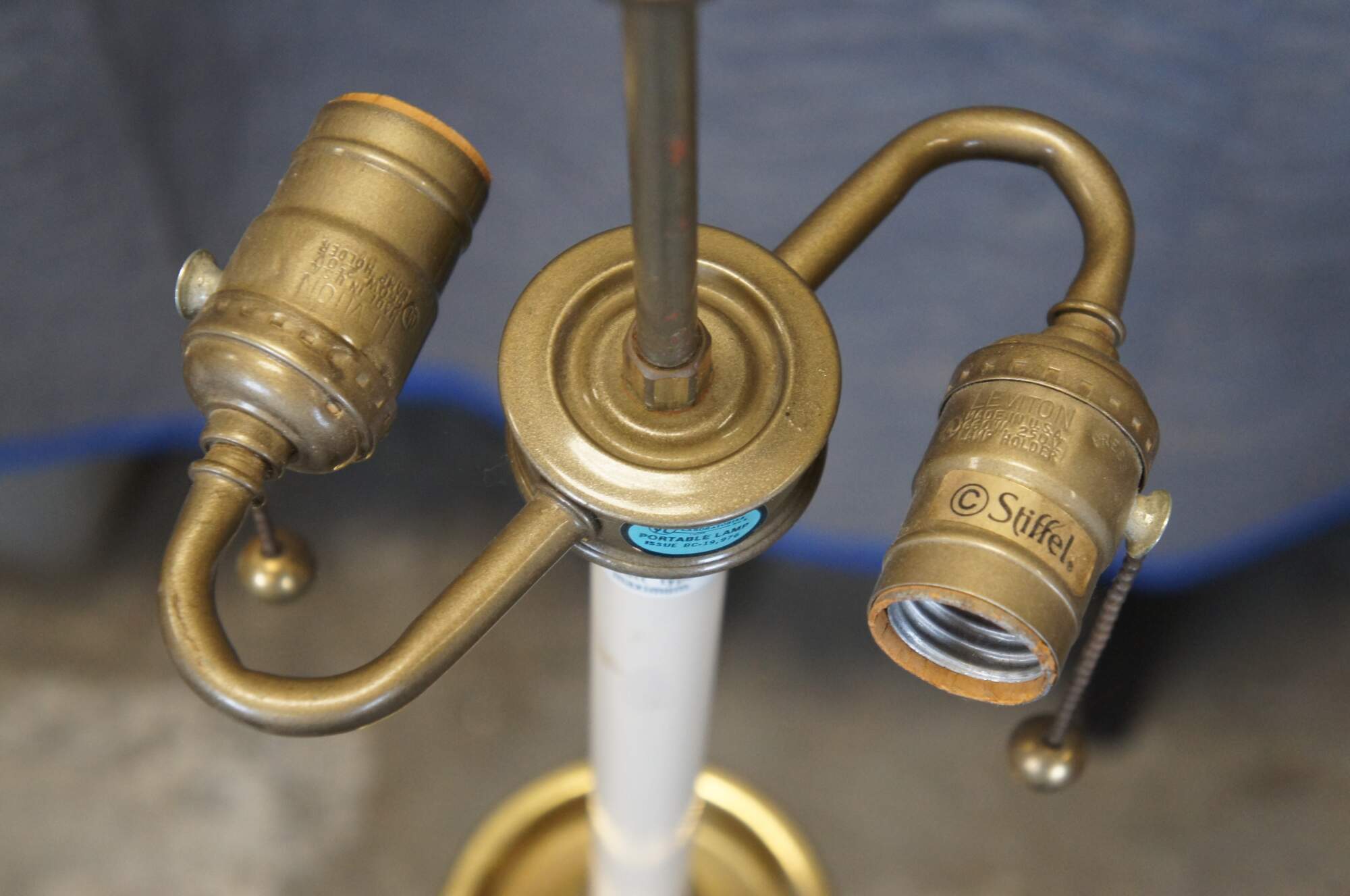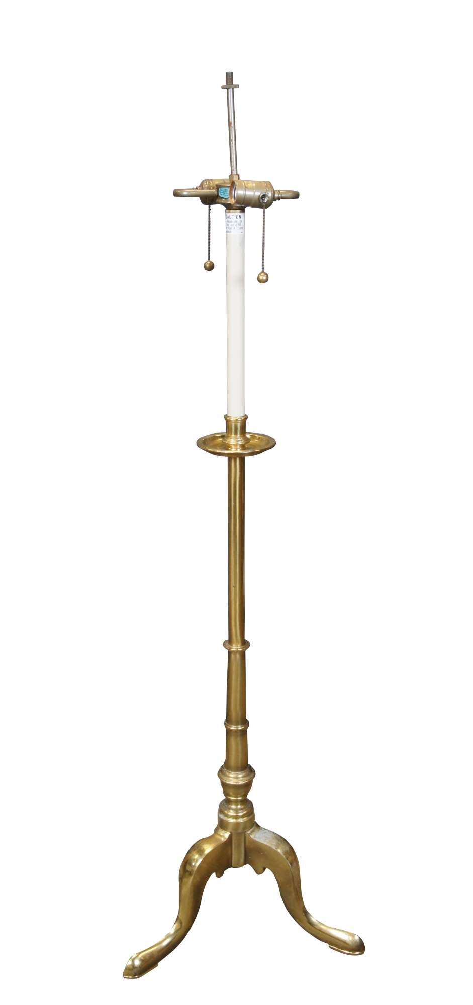 Late 20th century Stiffel two light altar floor lamp featuring a brass tripod / cabriole leg base with faux candlestick top.