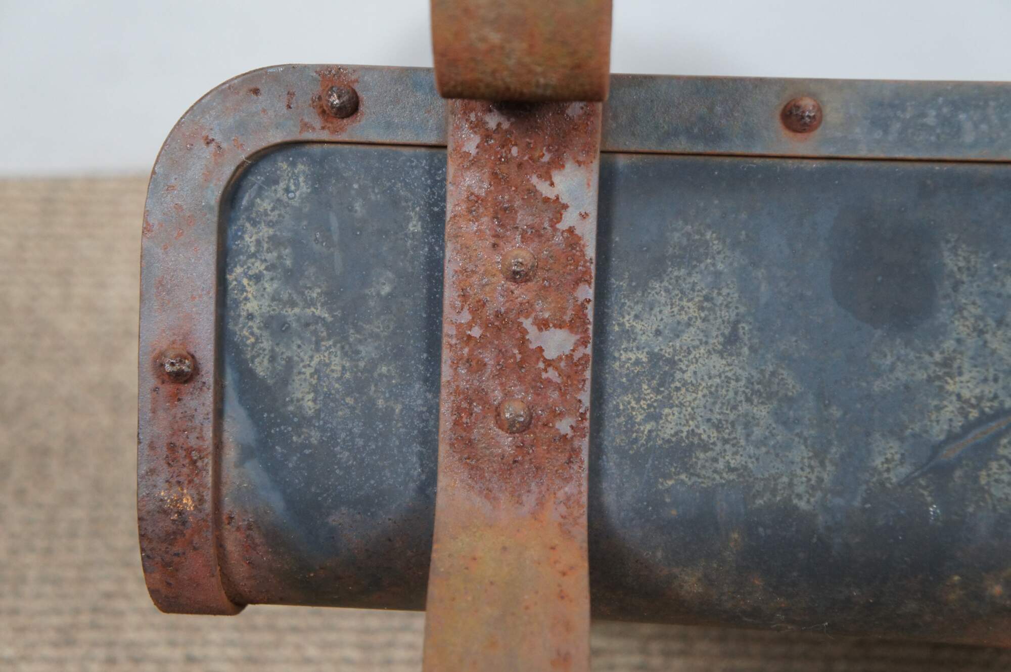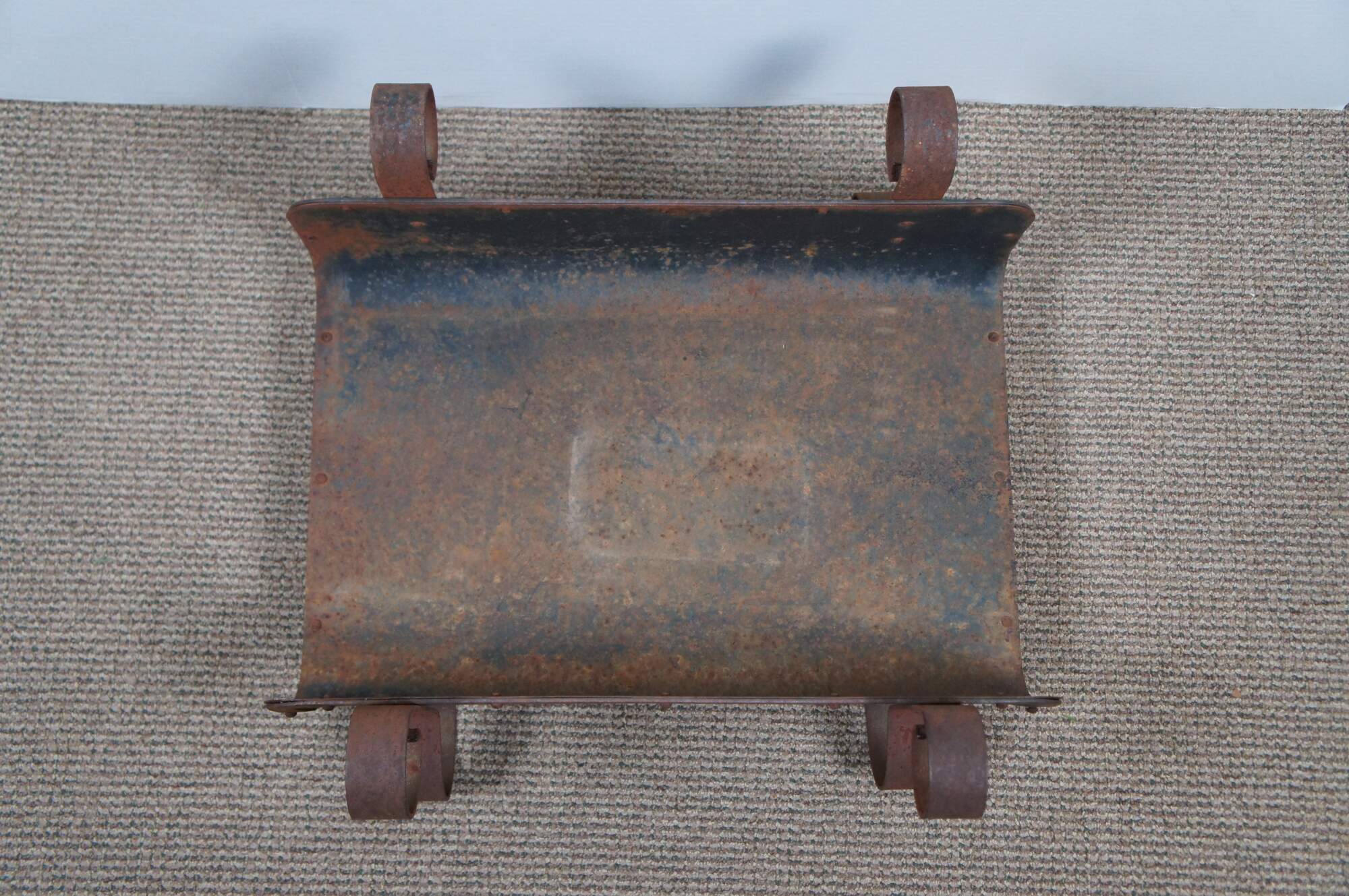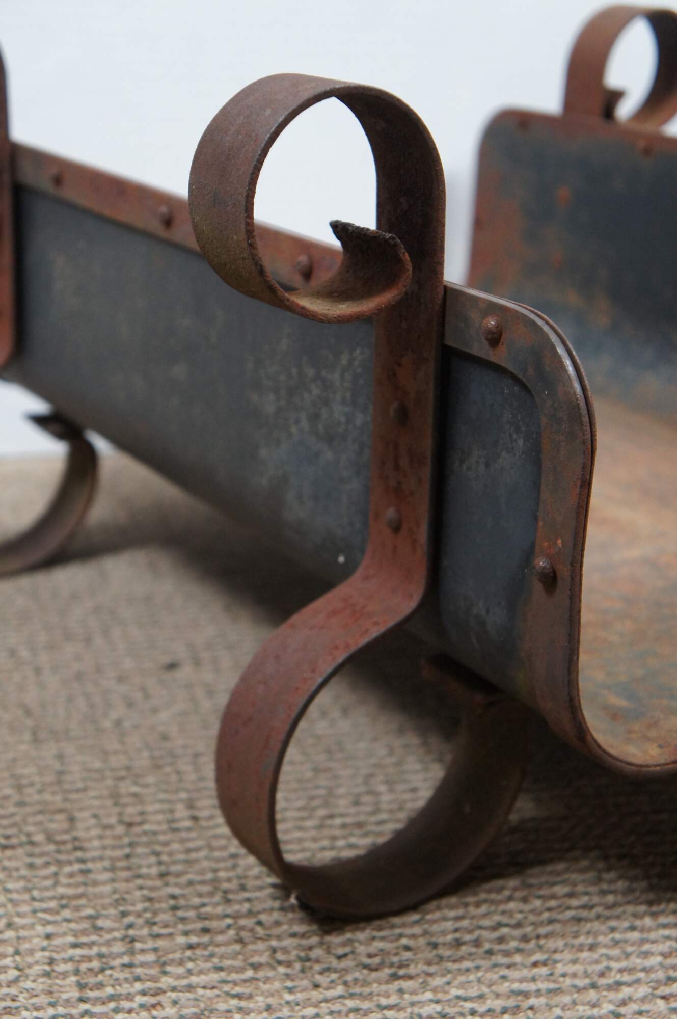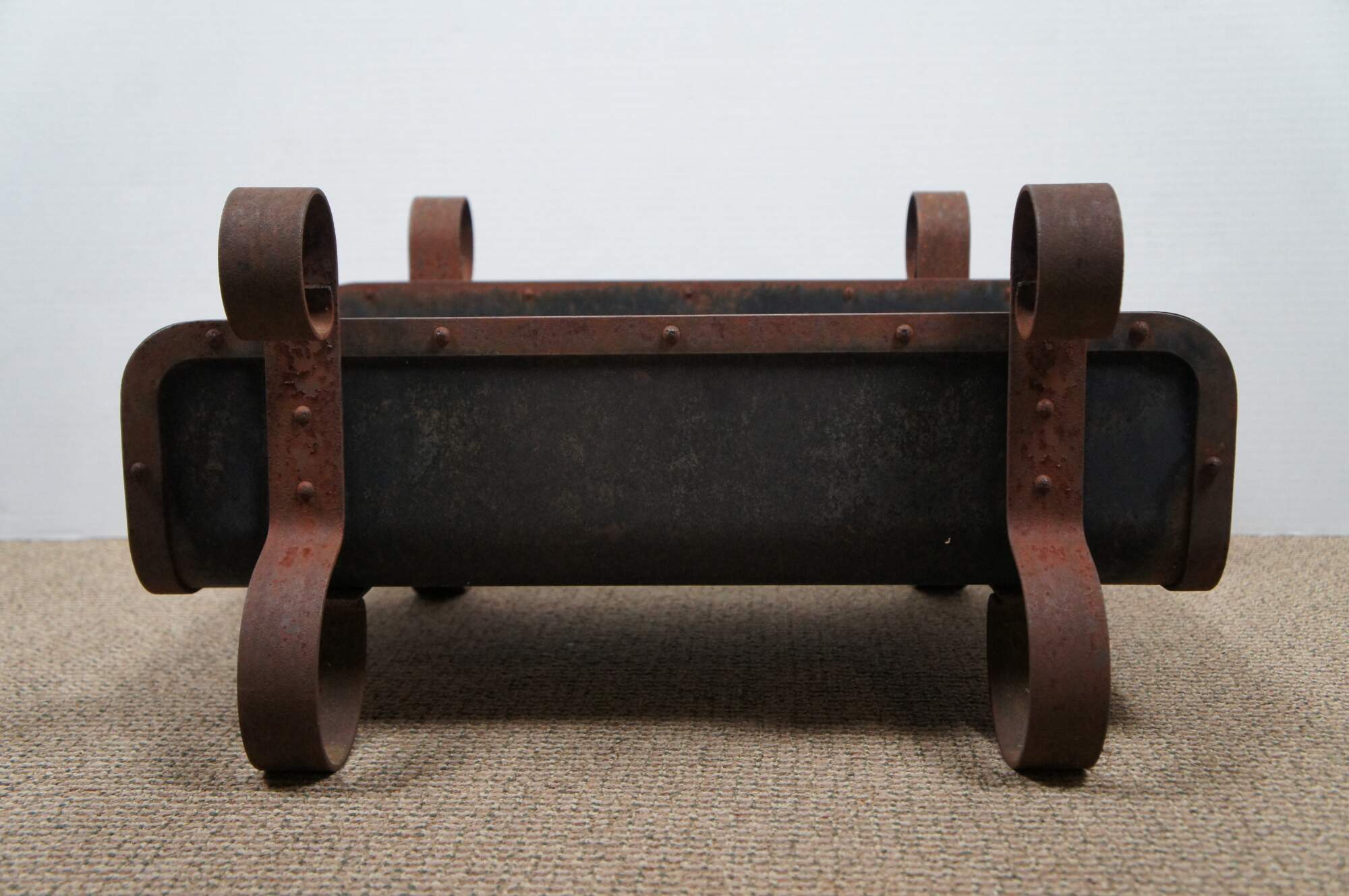 Circa 1970s brutalist / Spanish Revival style wrought iron firewood / log holder with squared off log basket and scrolled / curlique legs.