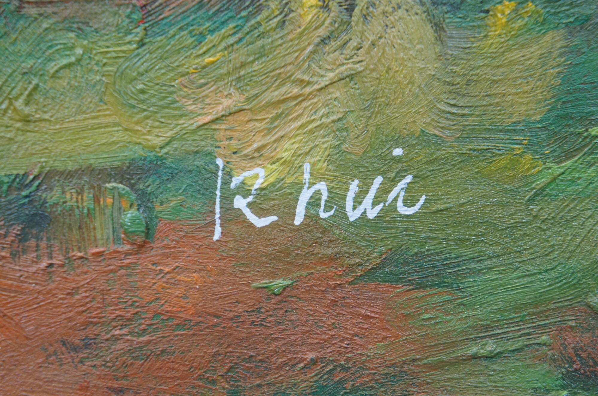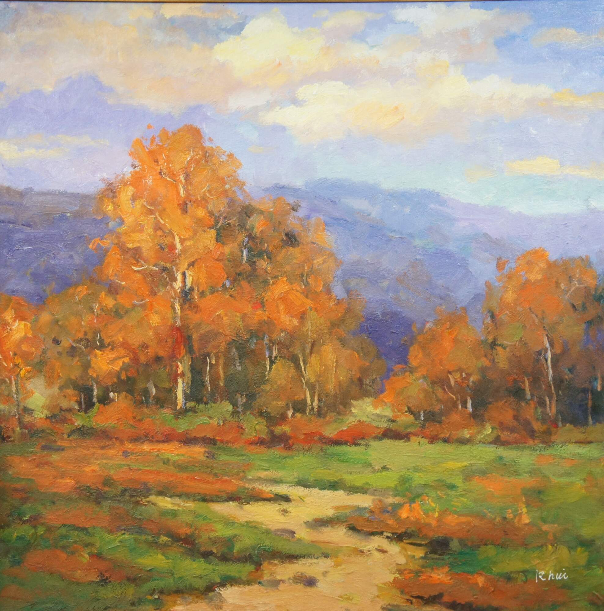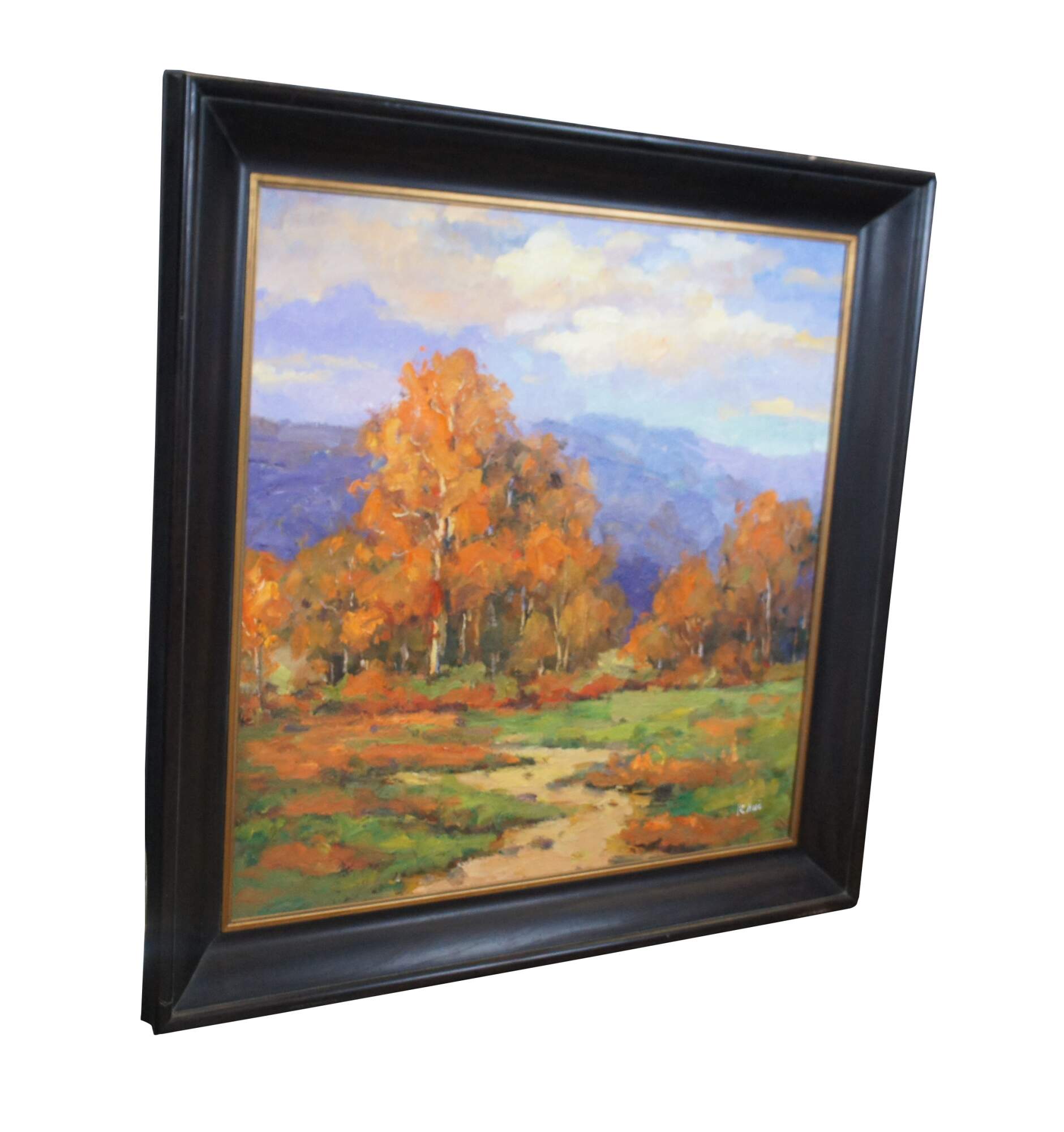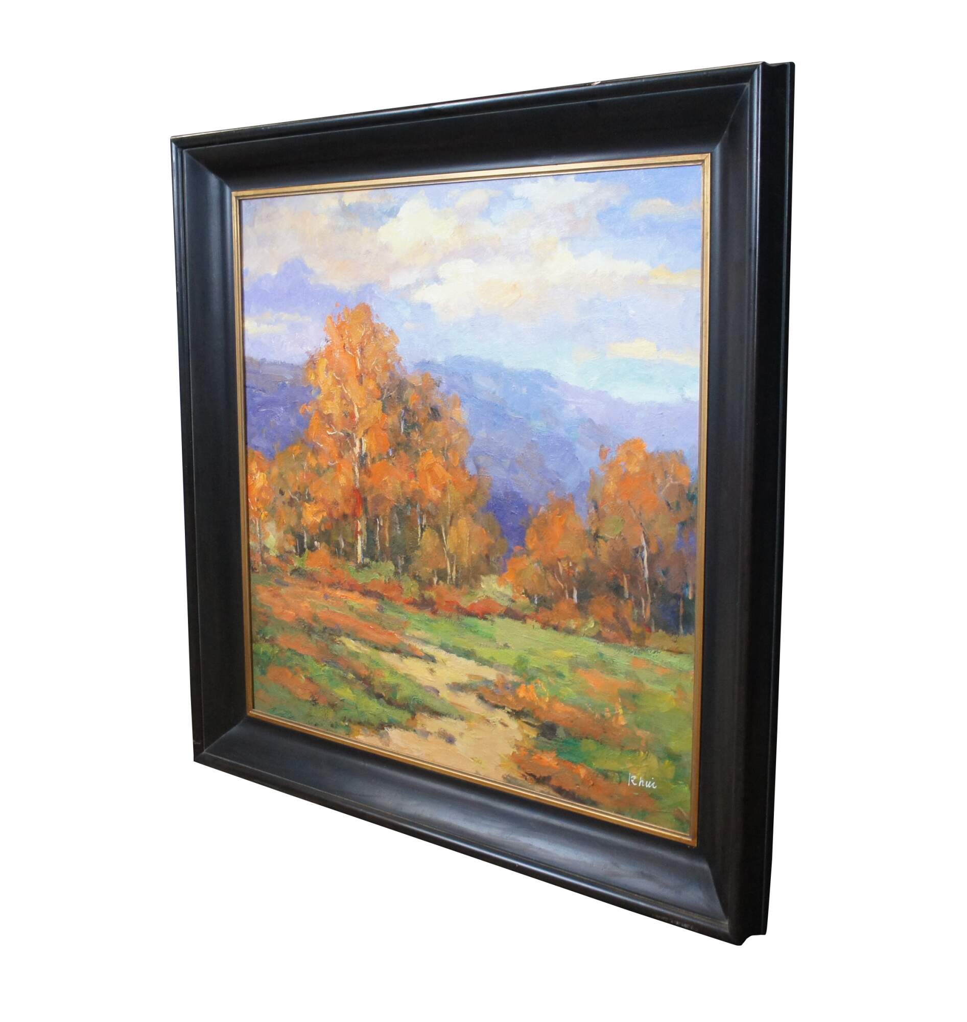 Very large and impressive oil on linen landscape painting depicting a scene of orange autumn trees before a backdrop of hazy mountains under a soft blue sky. Signed Rhui in lower right corner. Ru Hui. Black beveled wood frame with gilded border.