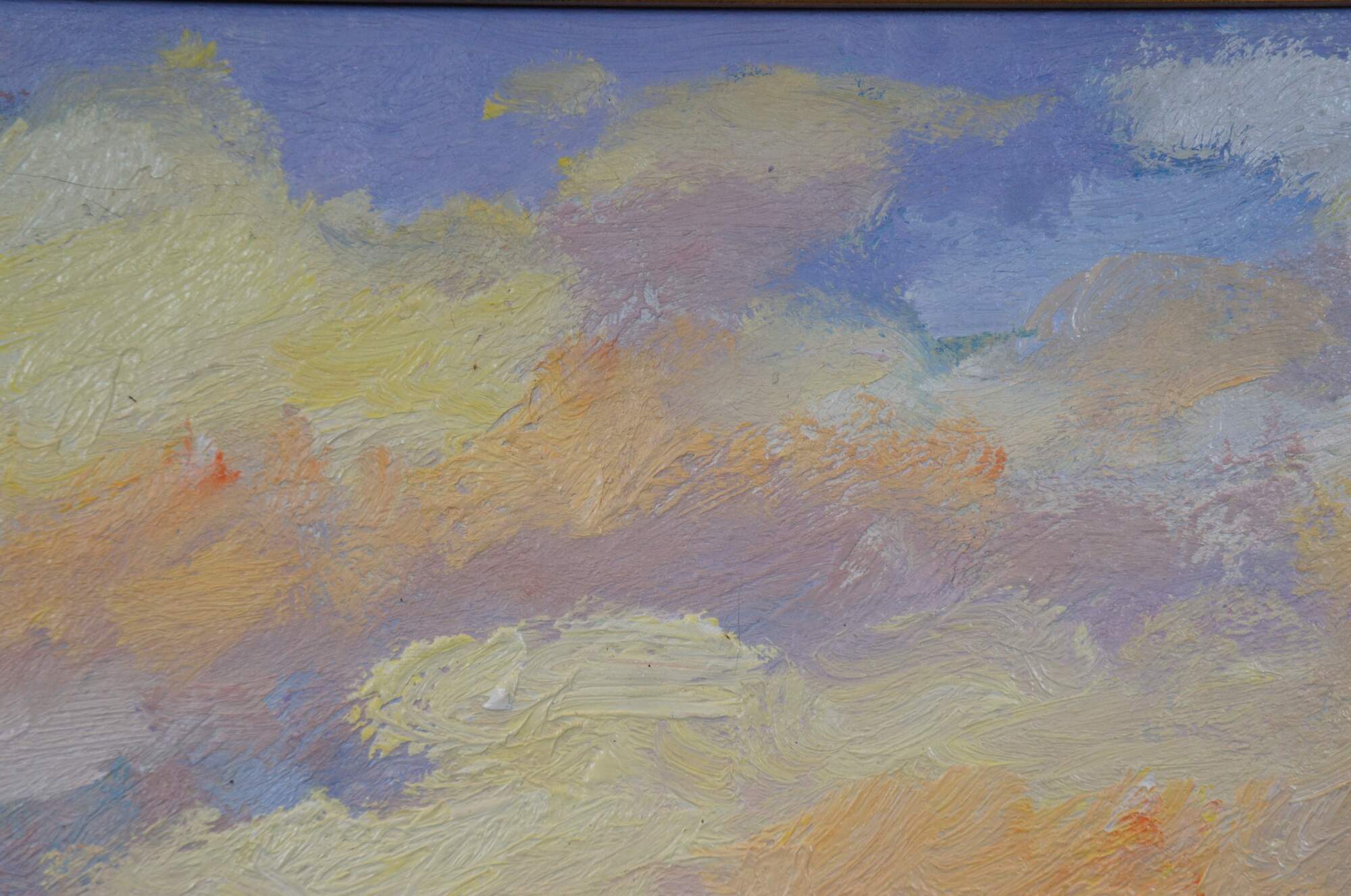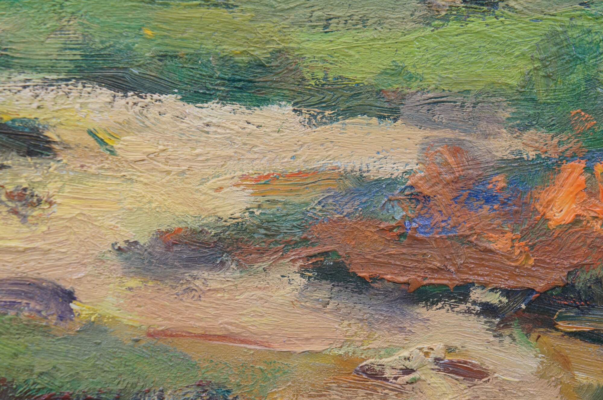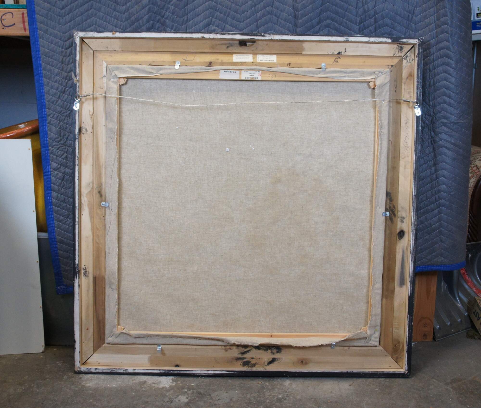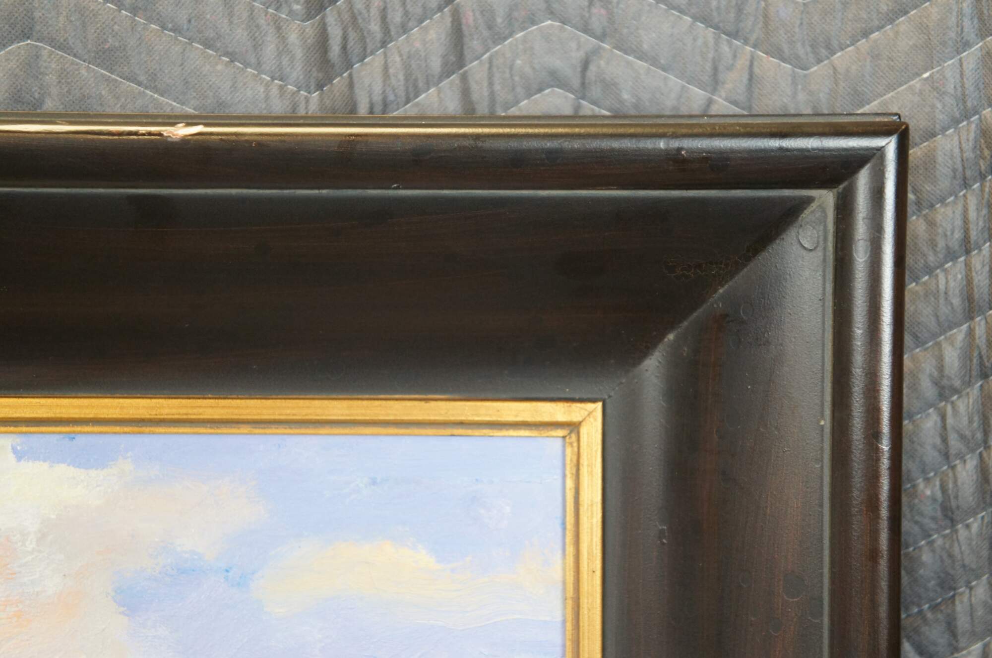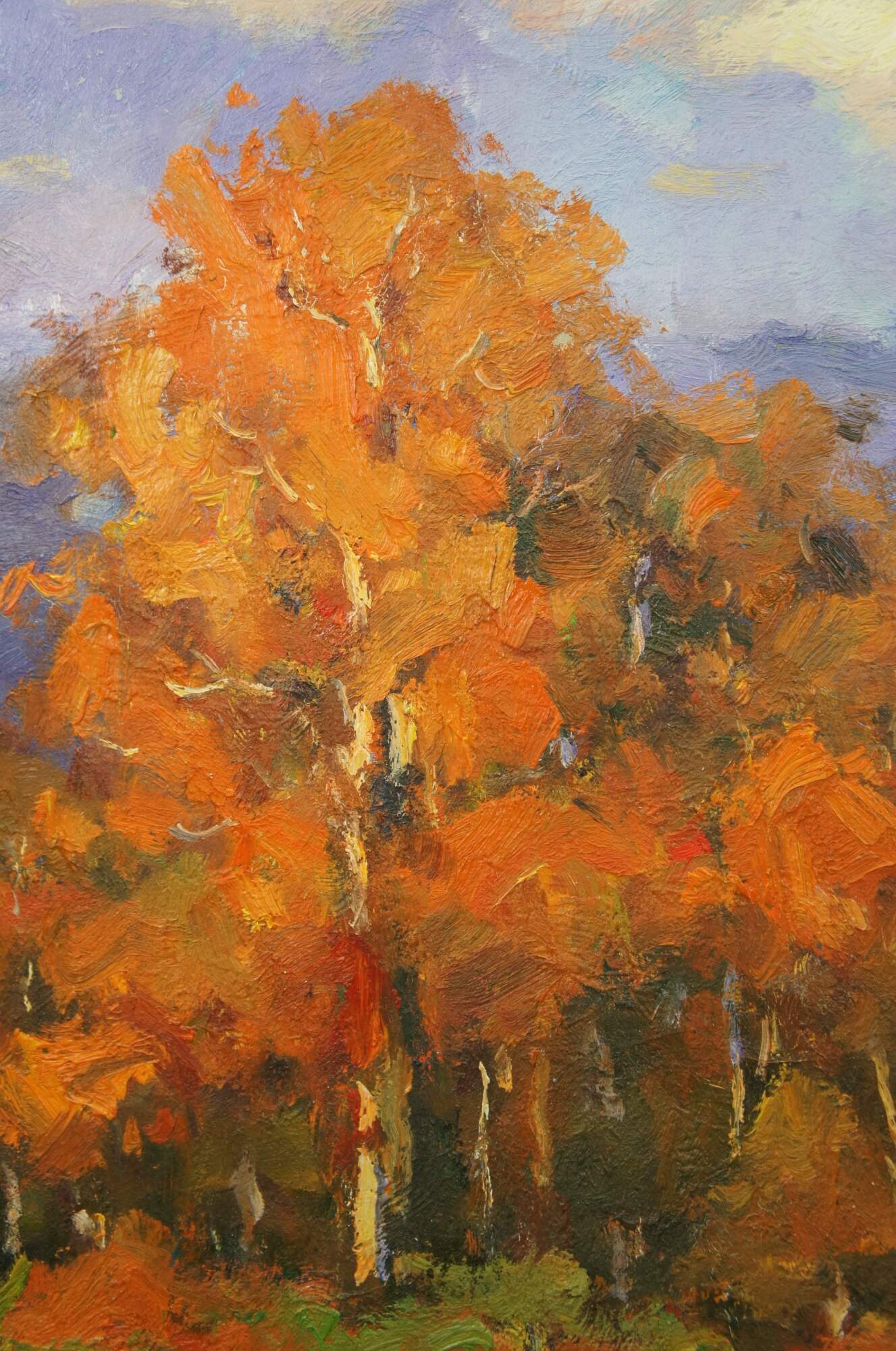 Very large and impressive oil on linen landscape painting depicting a scene of orange autumn trees before a backdrop of hazy mountains under a soft blue sky. Signed Rhui in lower right corner. Ru Hui. Black beveled wood frame with gilded border.