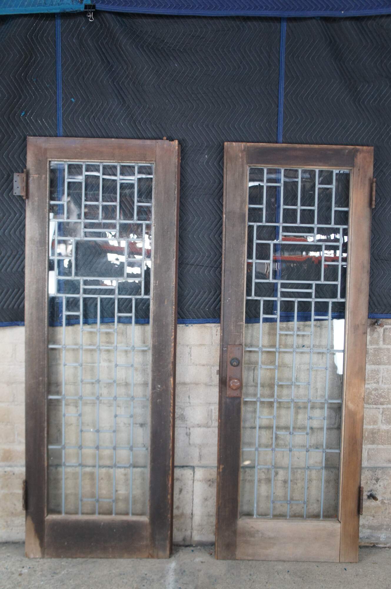 Pair of early 20th century architectural salvage antique leaded glass entry doors. Features an oak frame with geometric leaded glass panels. Procured from a historic 1922 waterfront estate on Orcas Island, Washington. Known for a Hollywood history, once home to Theda Bara and Silent Film producers with John Wayne and others regularly frequenting. A pair of matching side panels are available that can be combined to make a 4 piece entry.