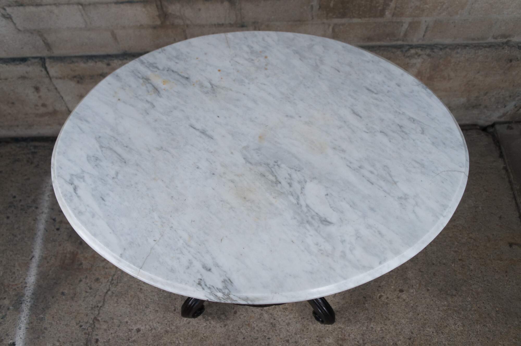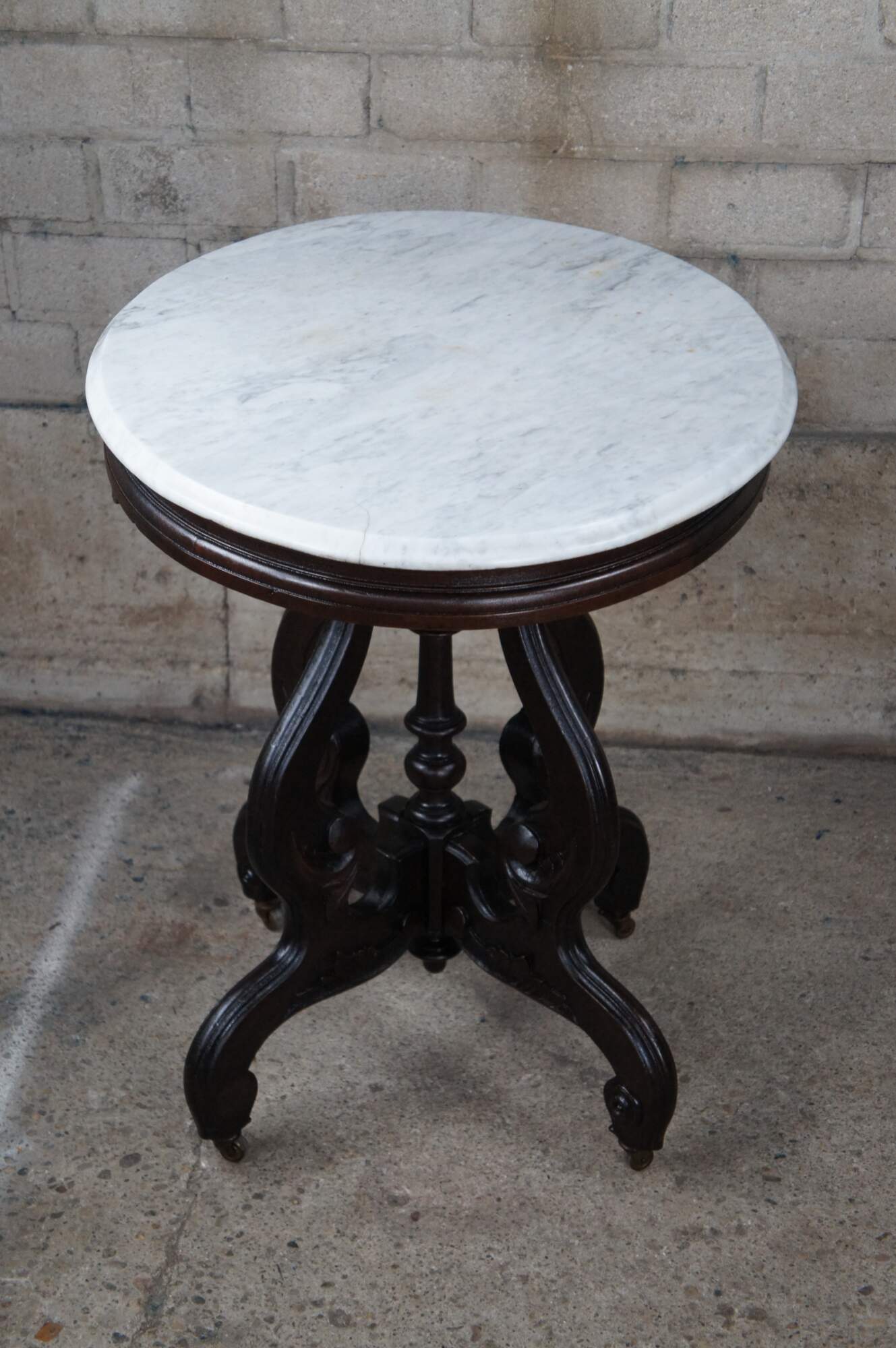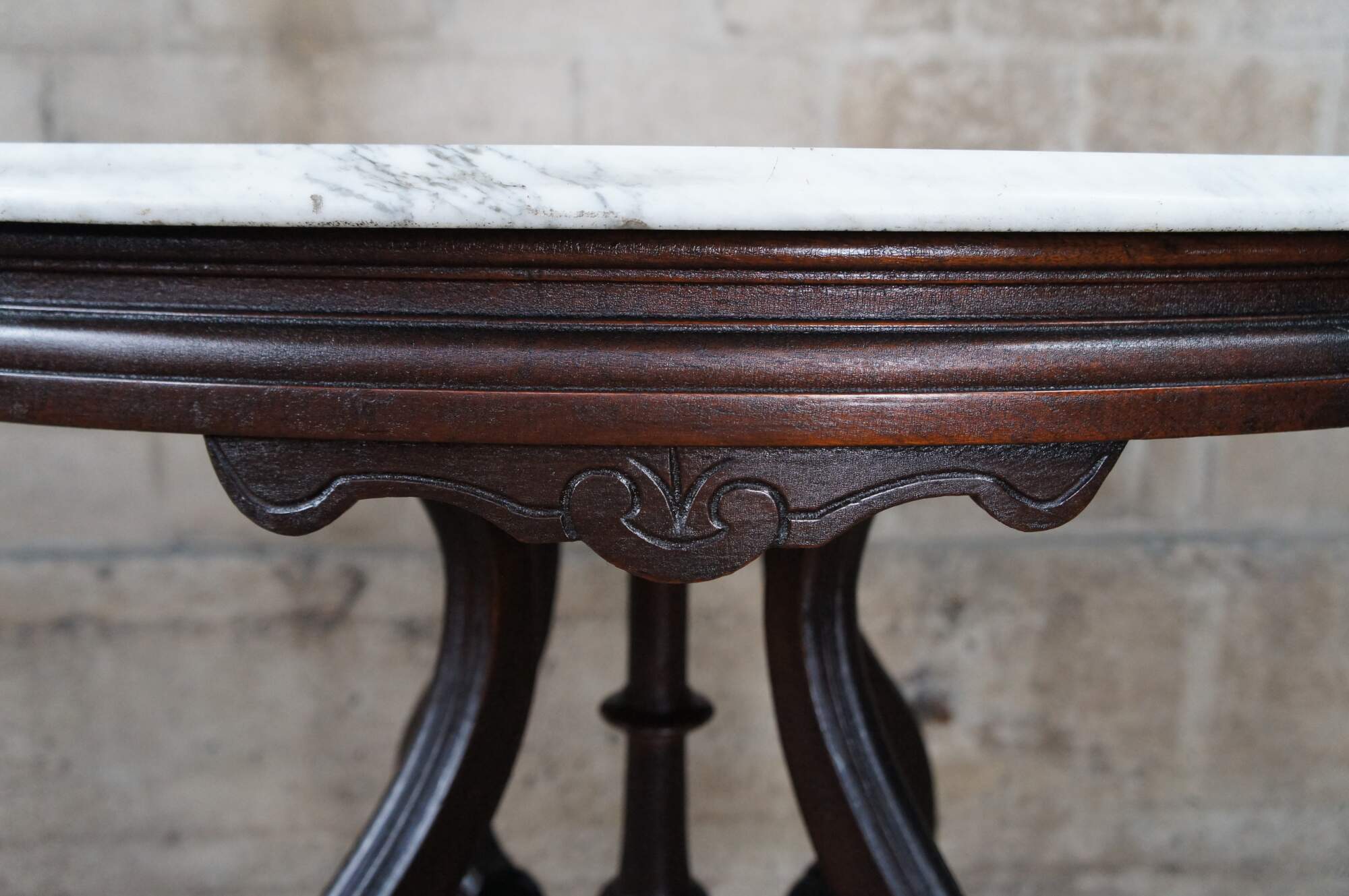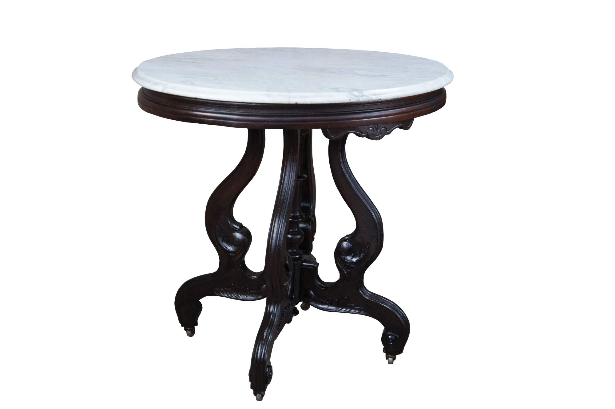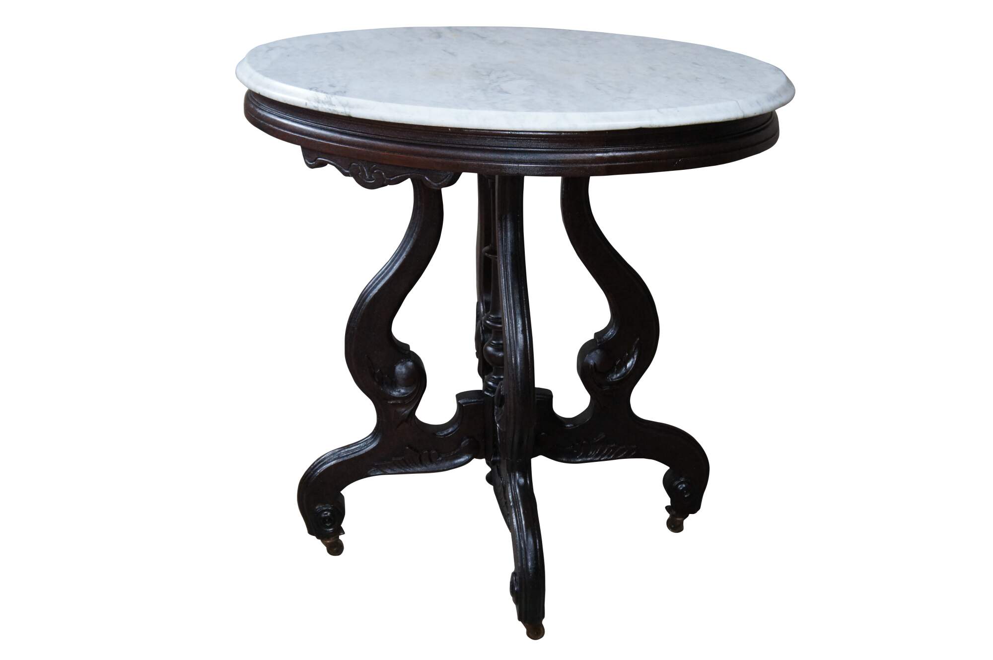 A late Victorian parlor side table. Features an oval form with white marble top over a serpentine base with carved and scrolled accents. The table is on casters for ease of movement.