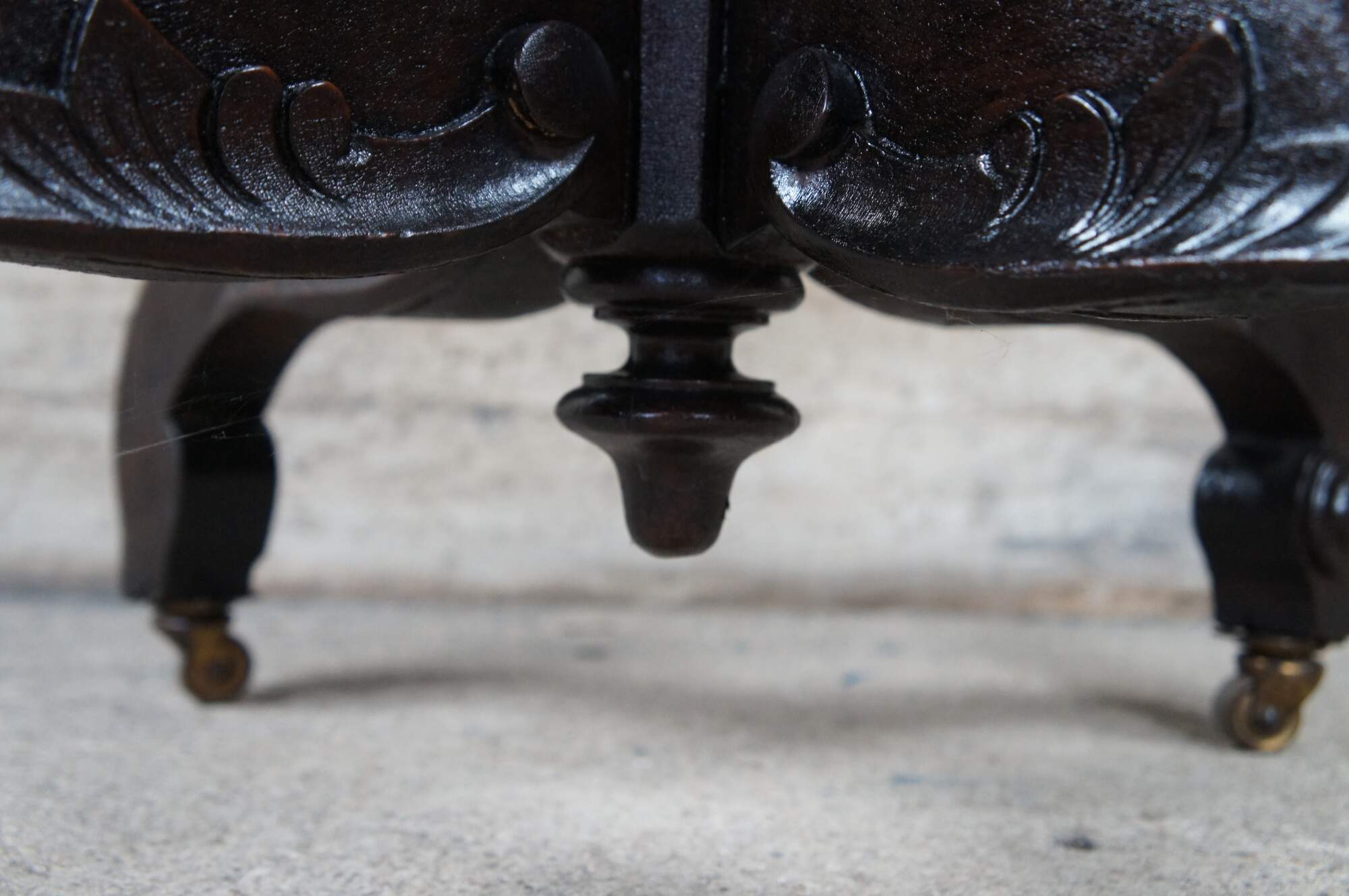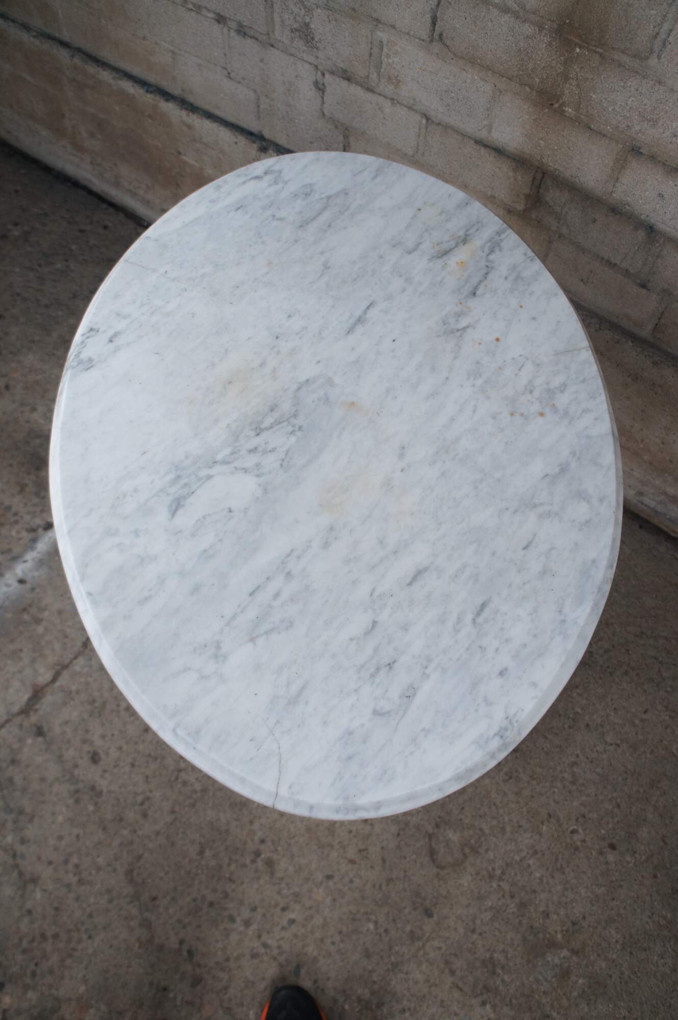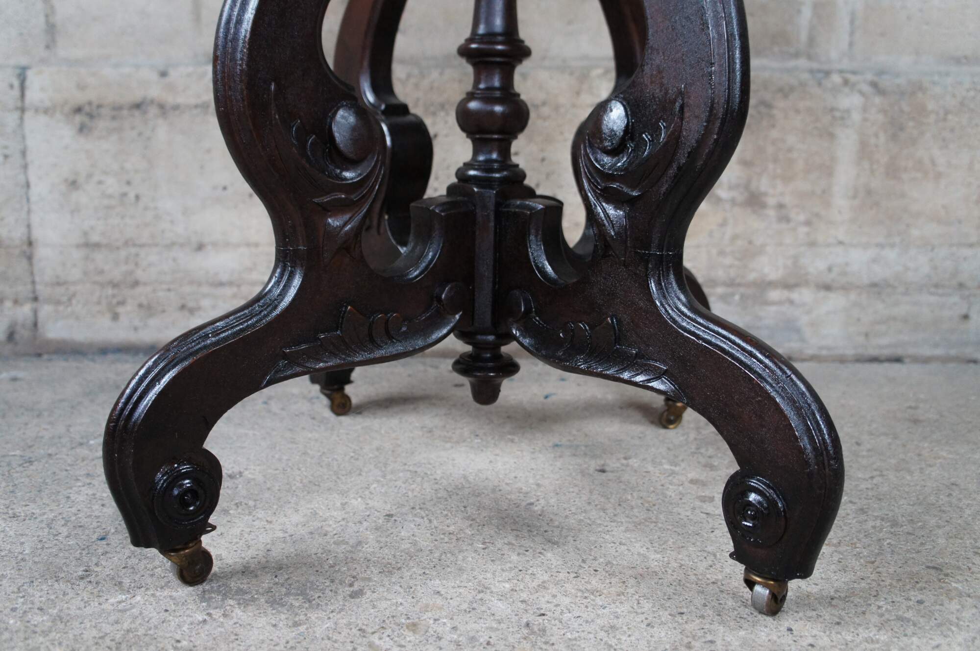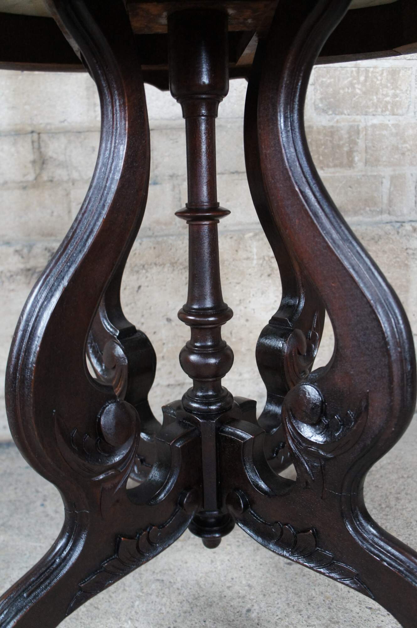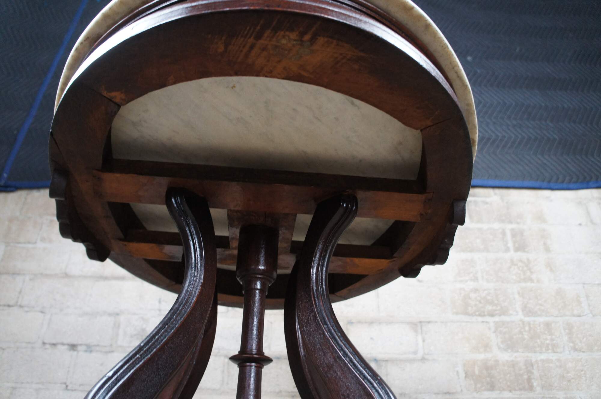 A late Victorian parlor side table. Features an oval form with white marble top over a serpentine base with carved and scrolled accents. The table is on casters for ease of movement.