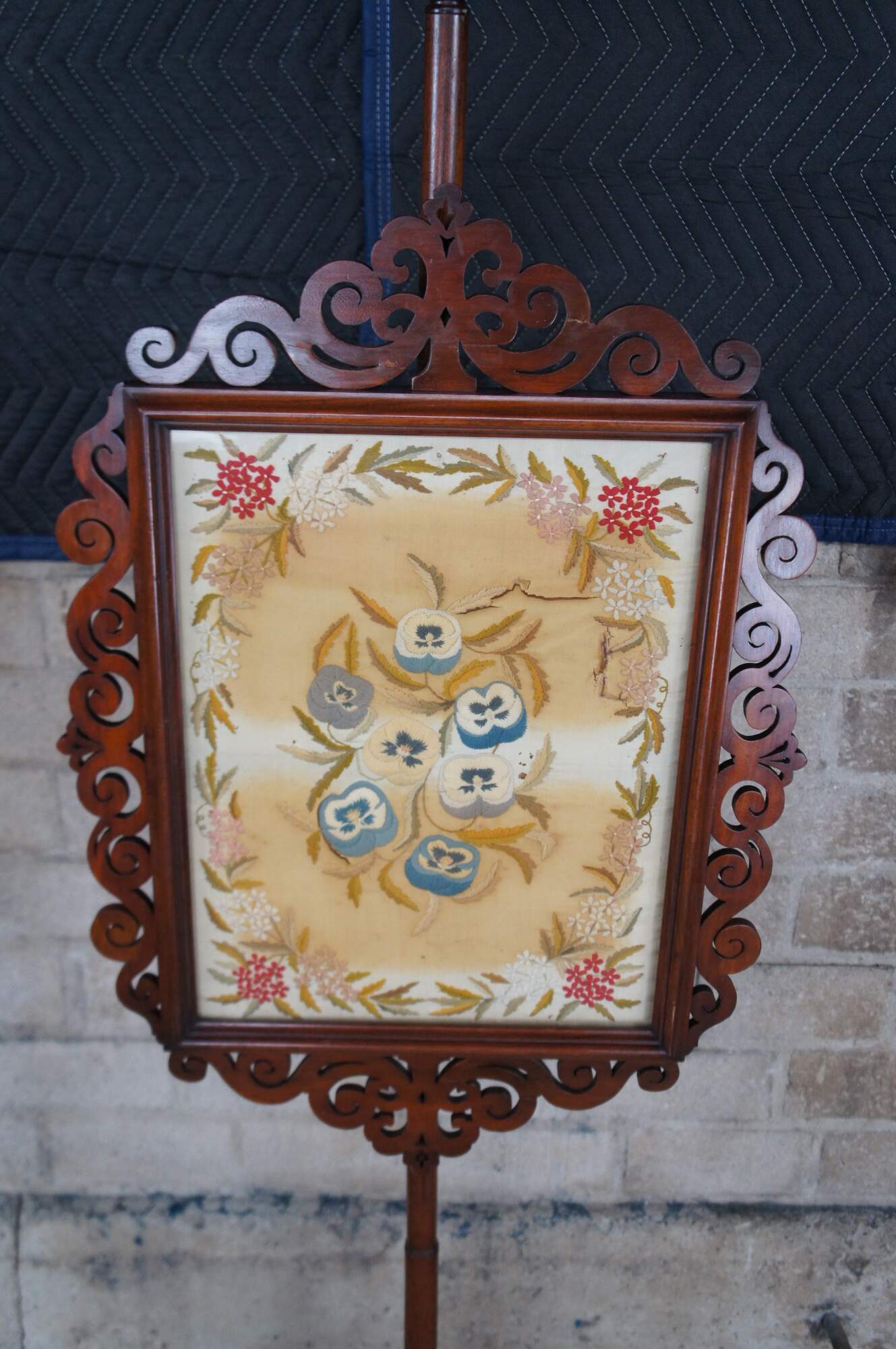 Good antique condition, wear and distressing commensurate with age and use, fading / distressing / tear / holes to tapestry, splitting to fret / fading.