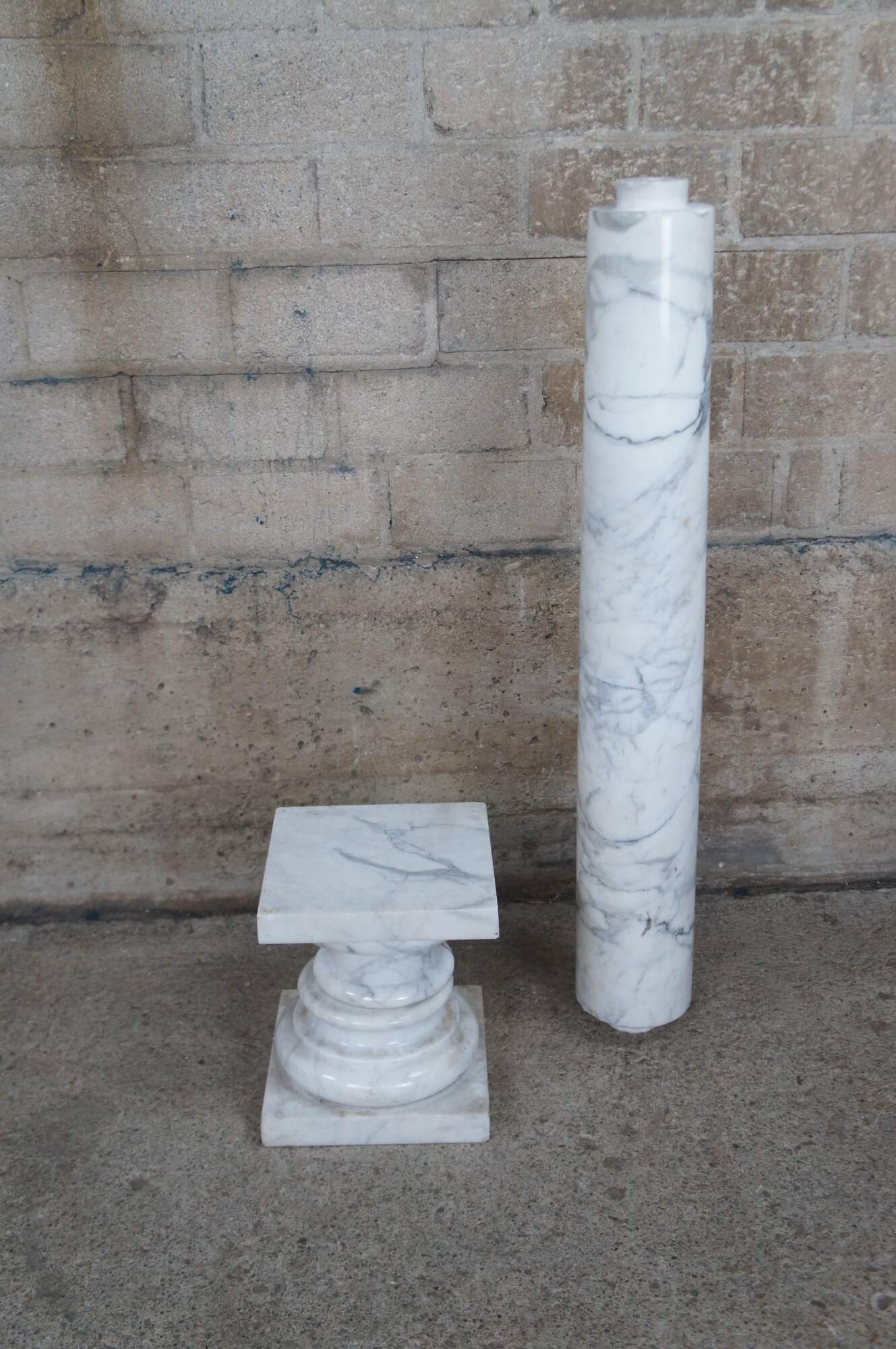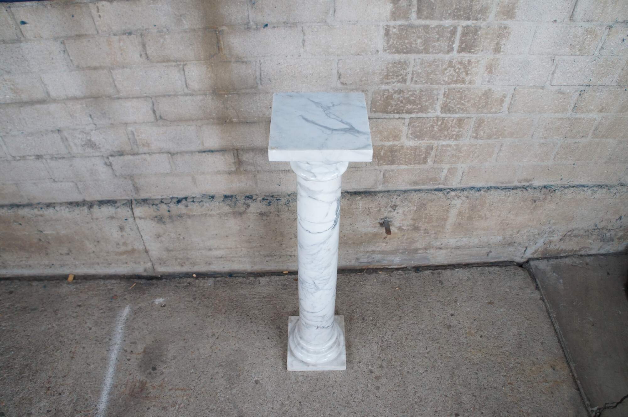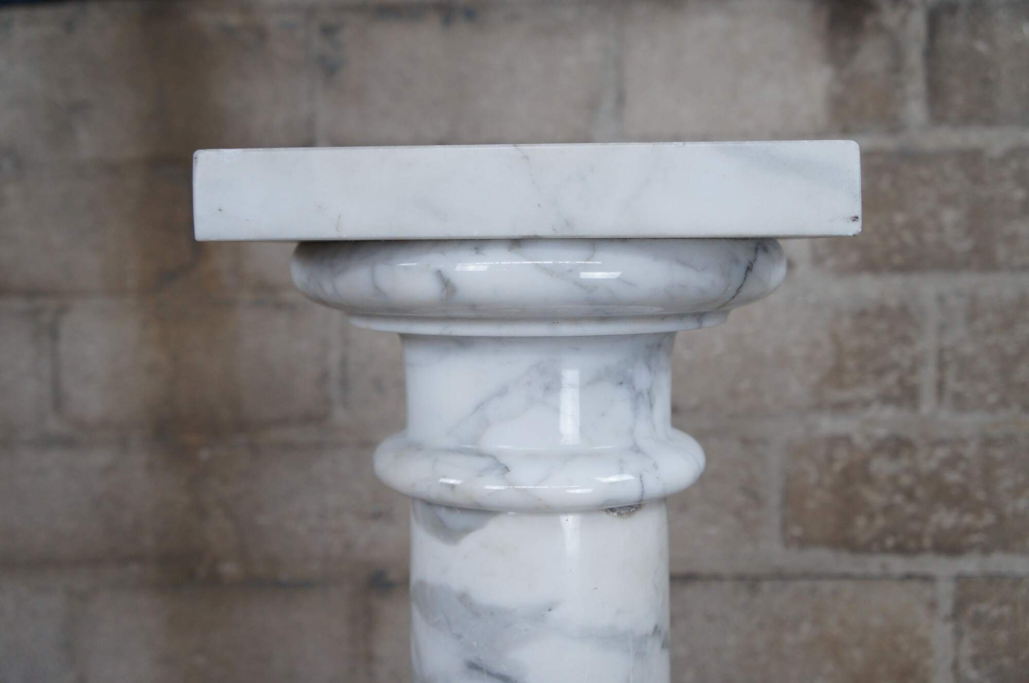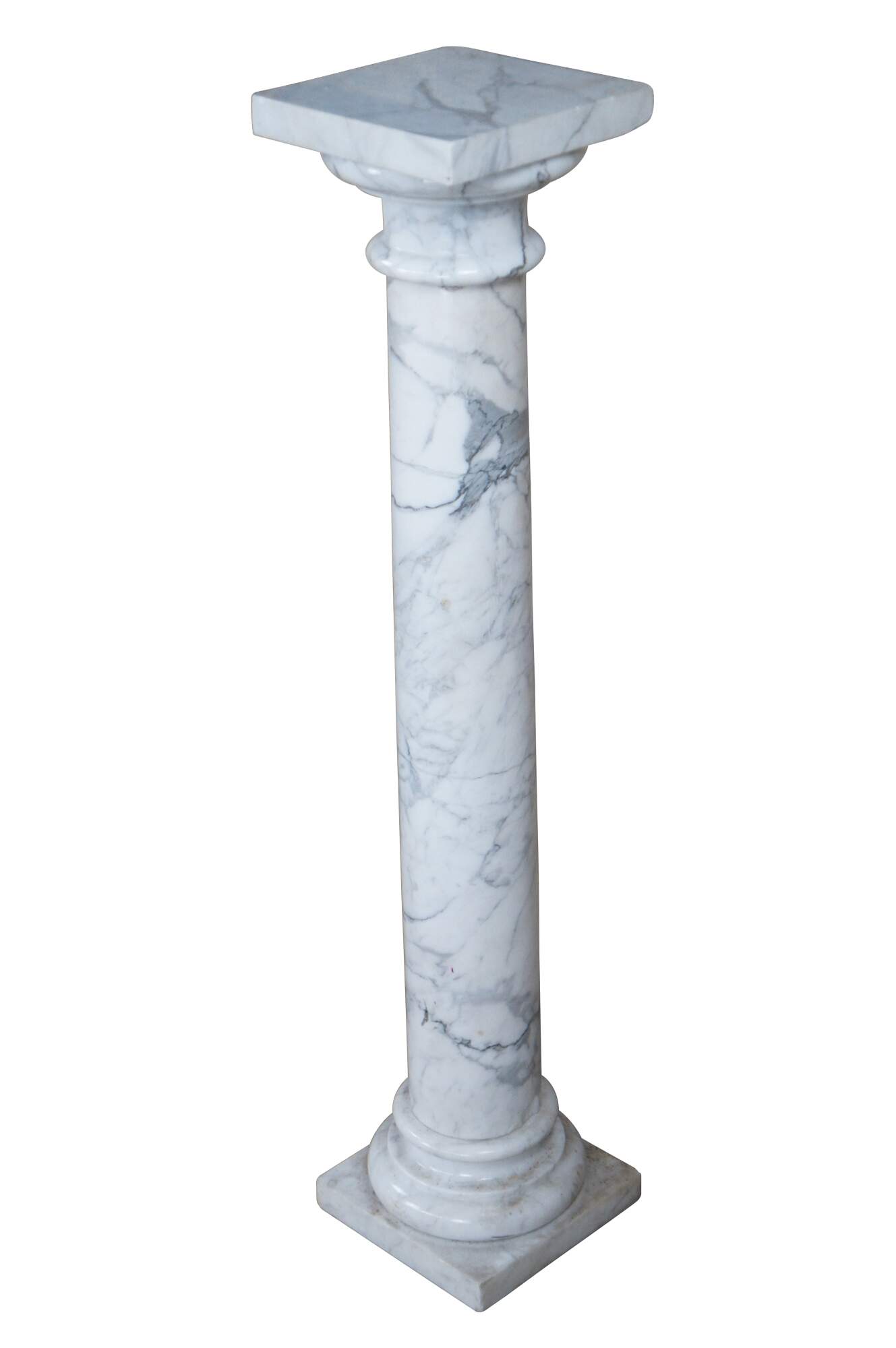 Antique white Carrara marble column or pedestal featuring a three piece design with square base and capital, and round cylindrical body.