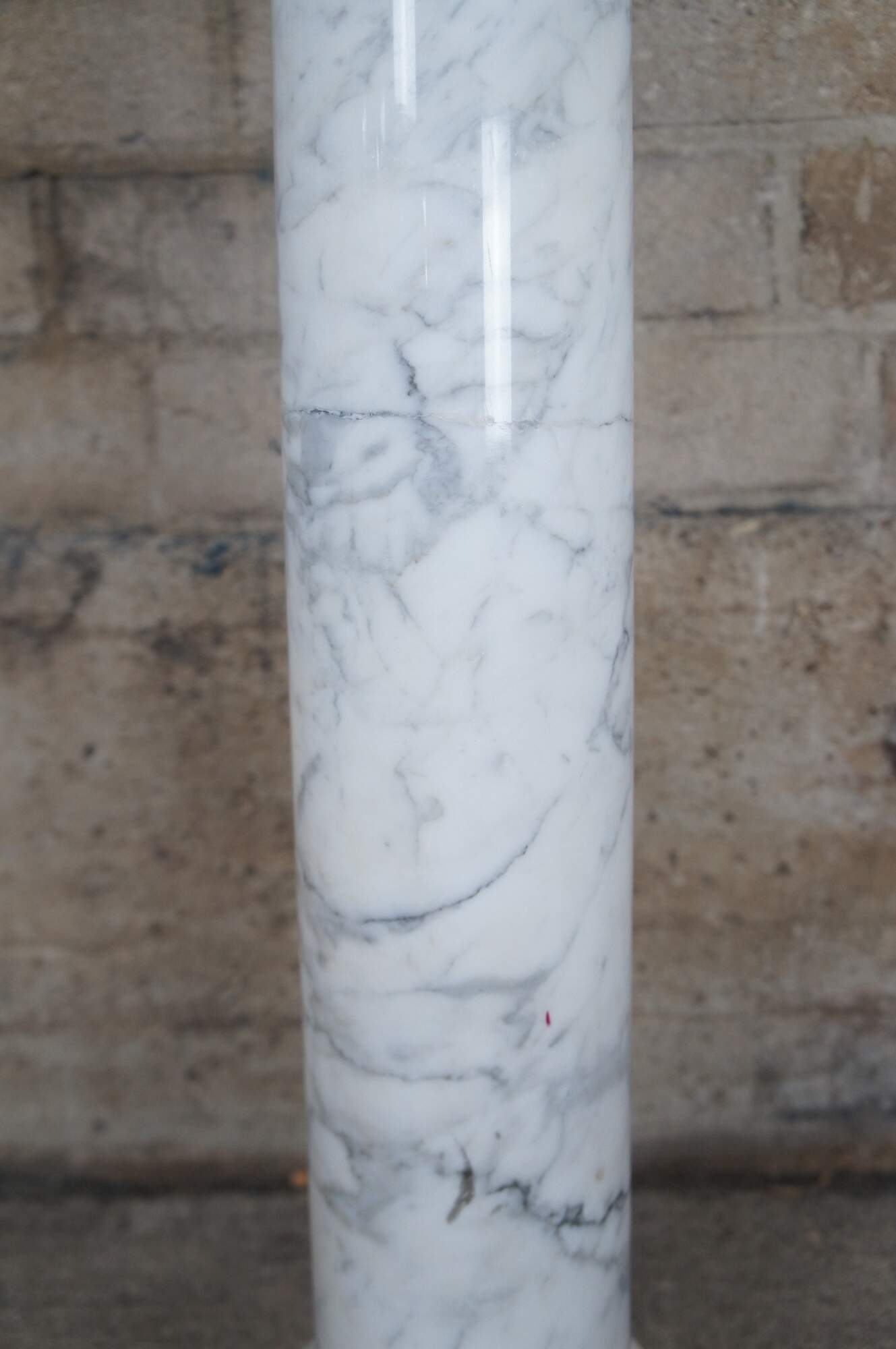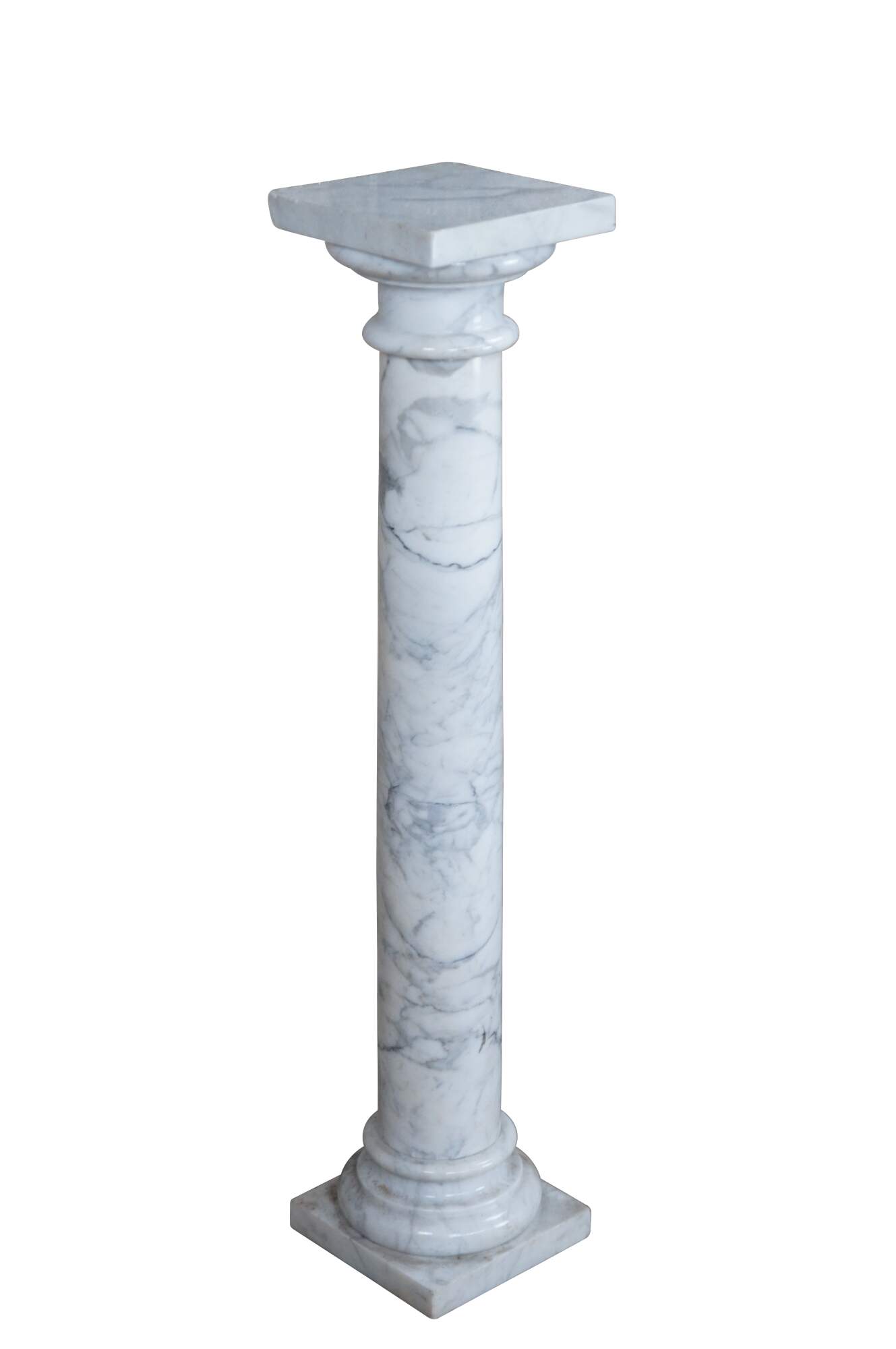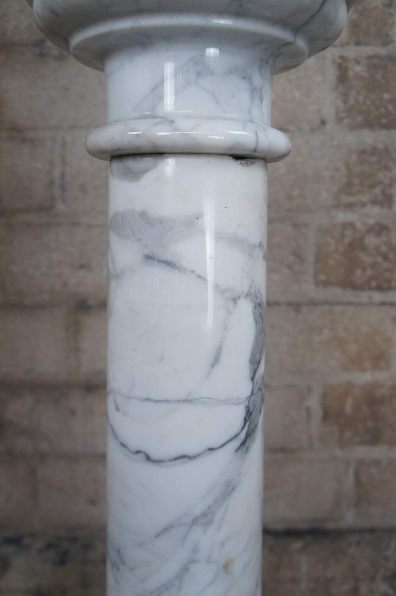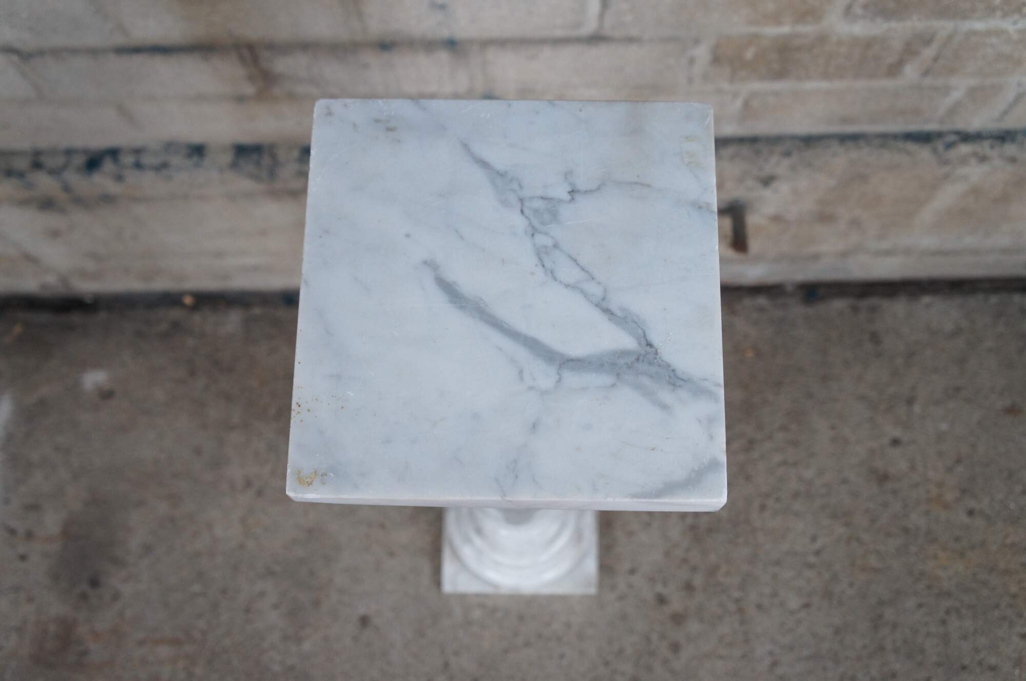 Antique white Carrara marble column or pedestal featuring a three piece design with square base and capital, and round cylindrical body.