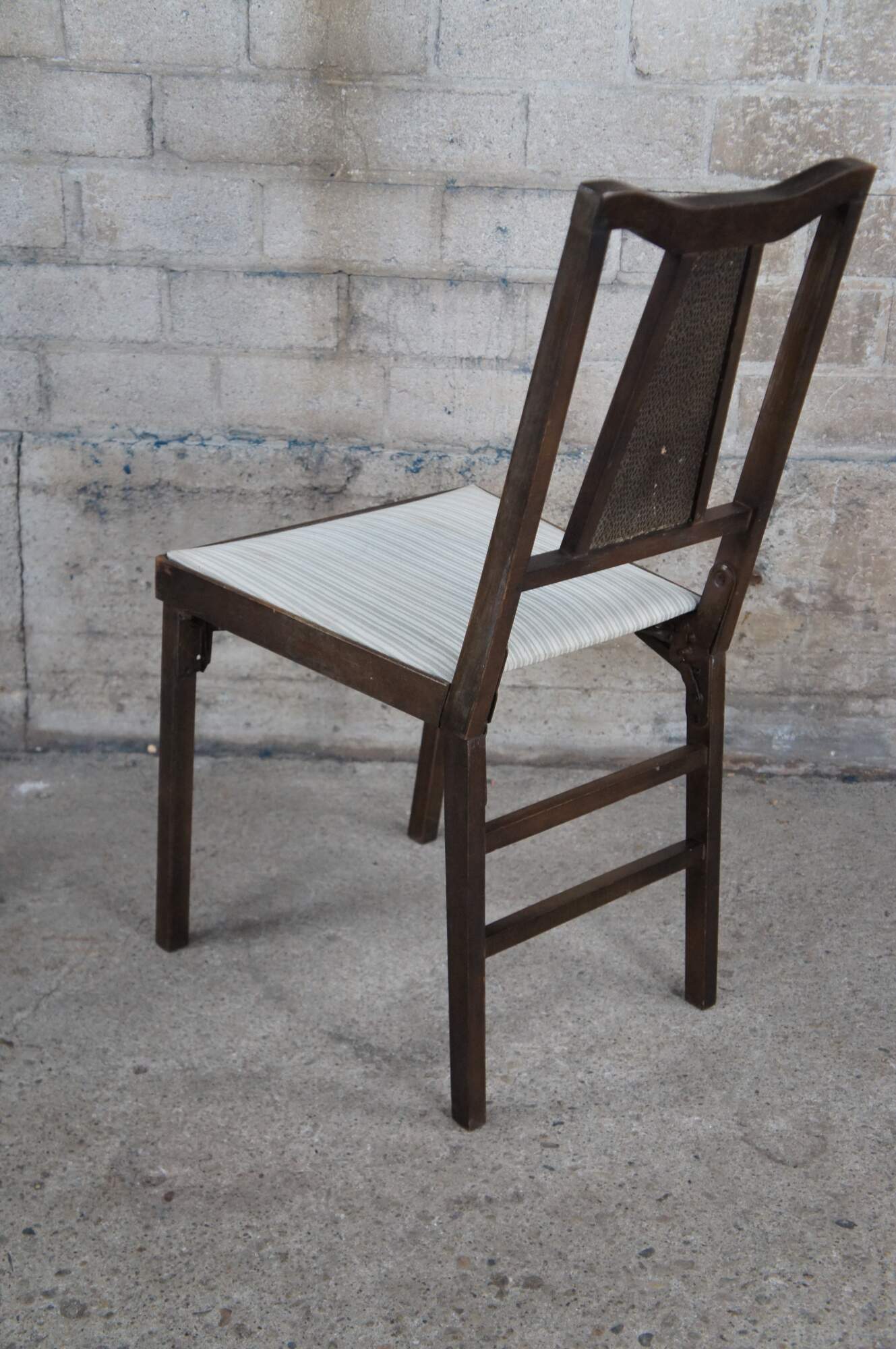Two mid century Leg o matic folding side chairs. Made of walnut featuring woven wicker rattan backs with vinyl seat and metal hinges.