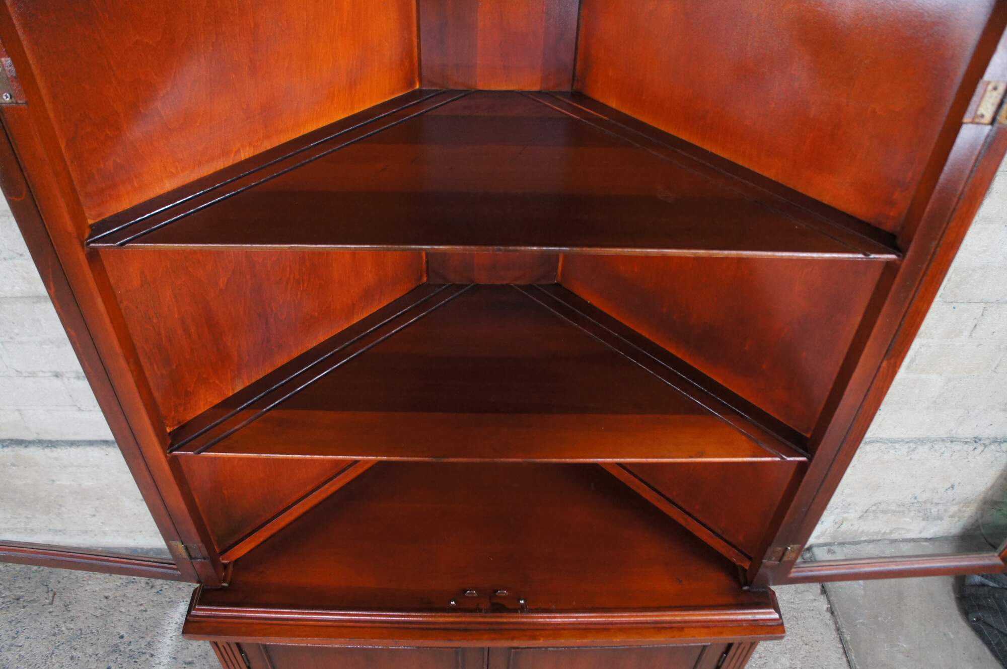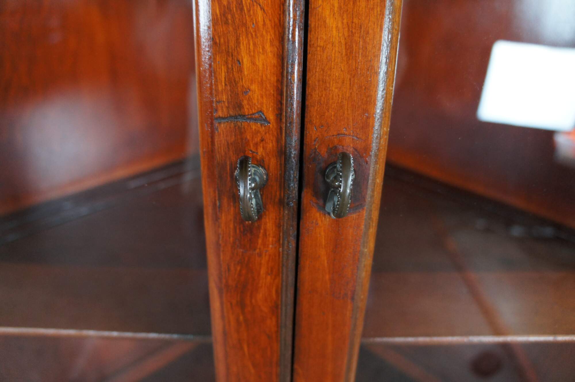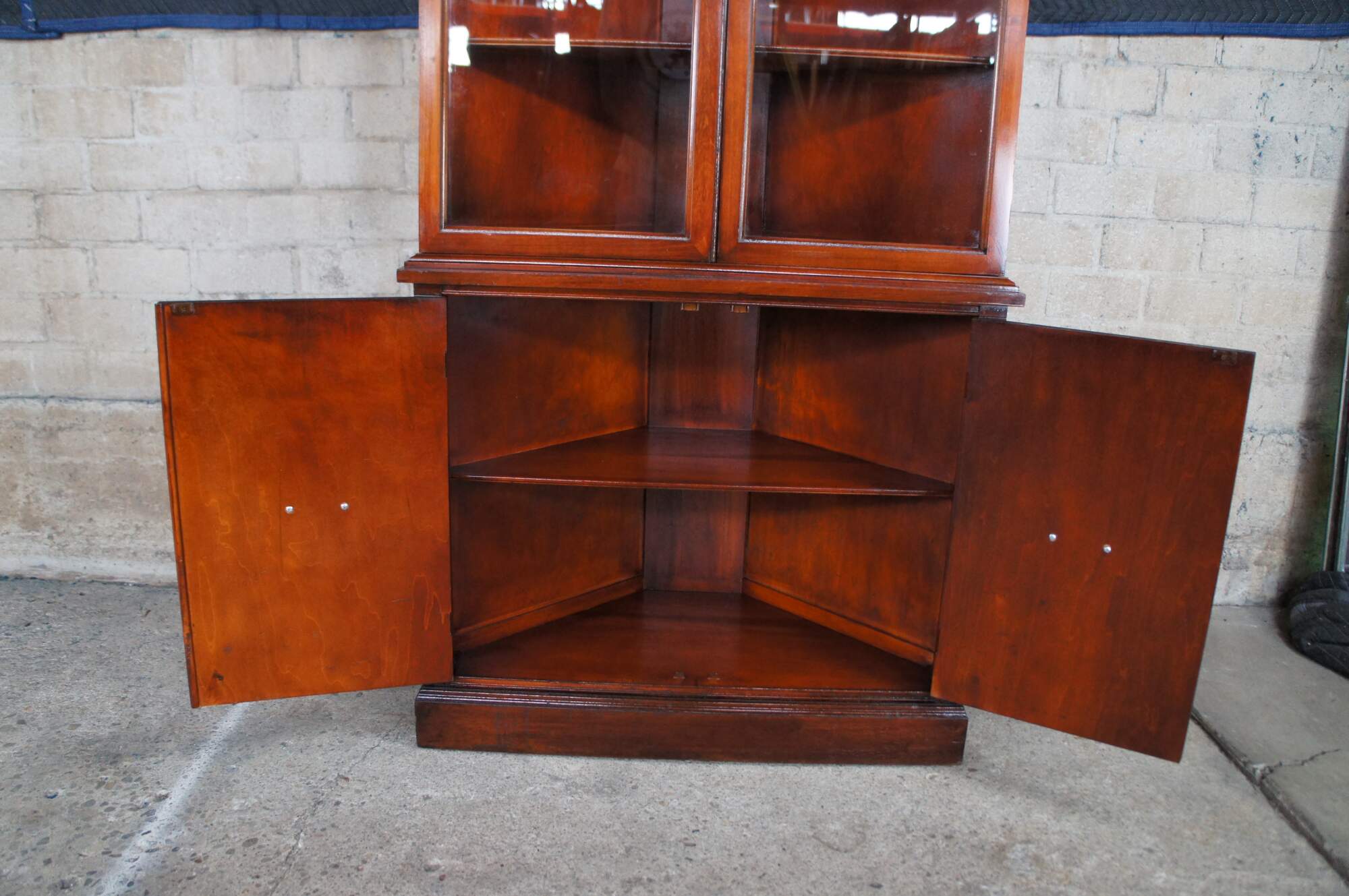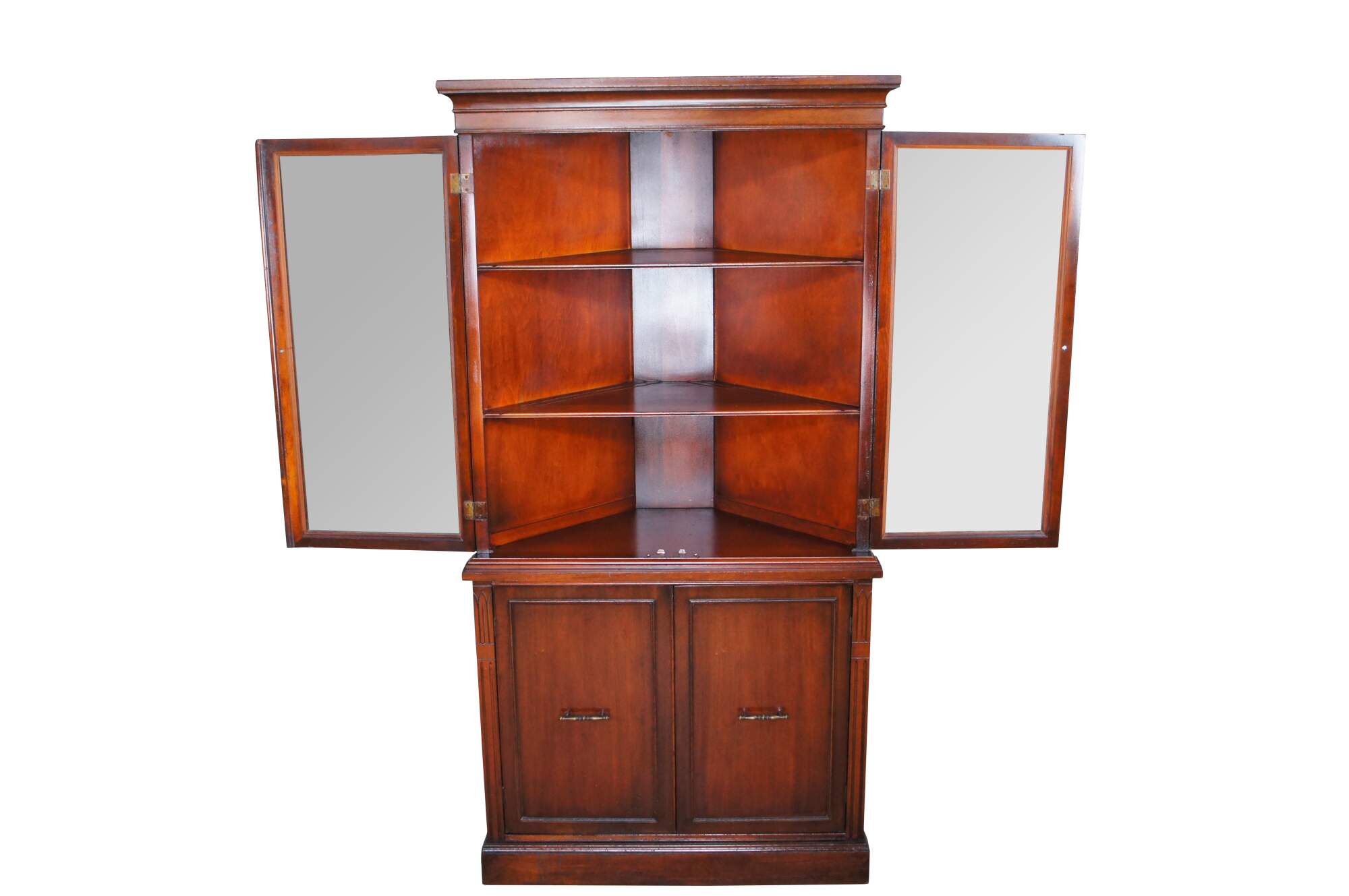 Traditional glass front corner cabinet, c. 1940s. Features a mahogany case with two glass covered doors along the front. The cabinet opens to two shelves with plate grooves along the top over a lower cabinet with shelf for accessory storage.
