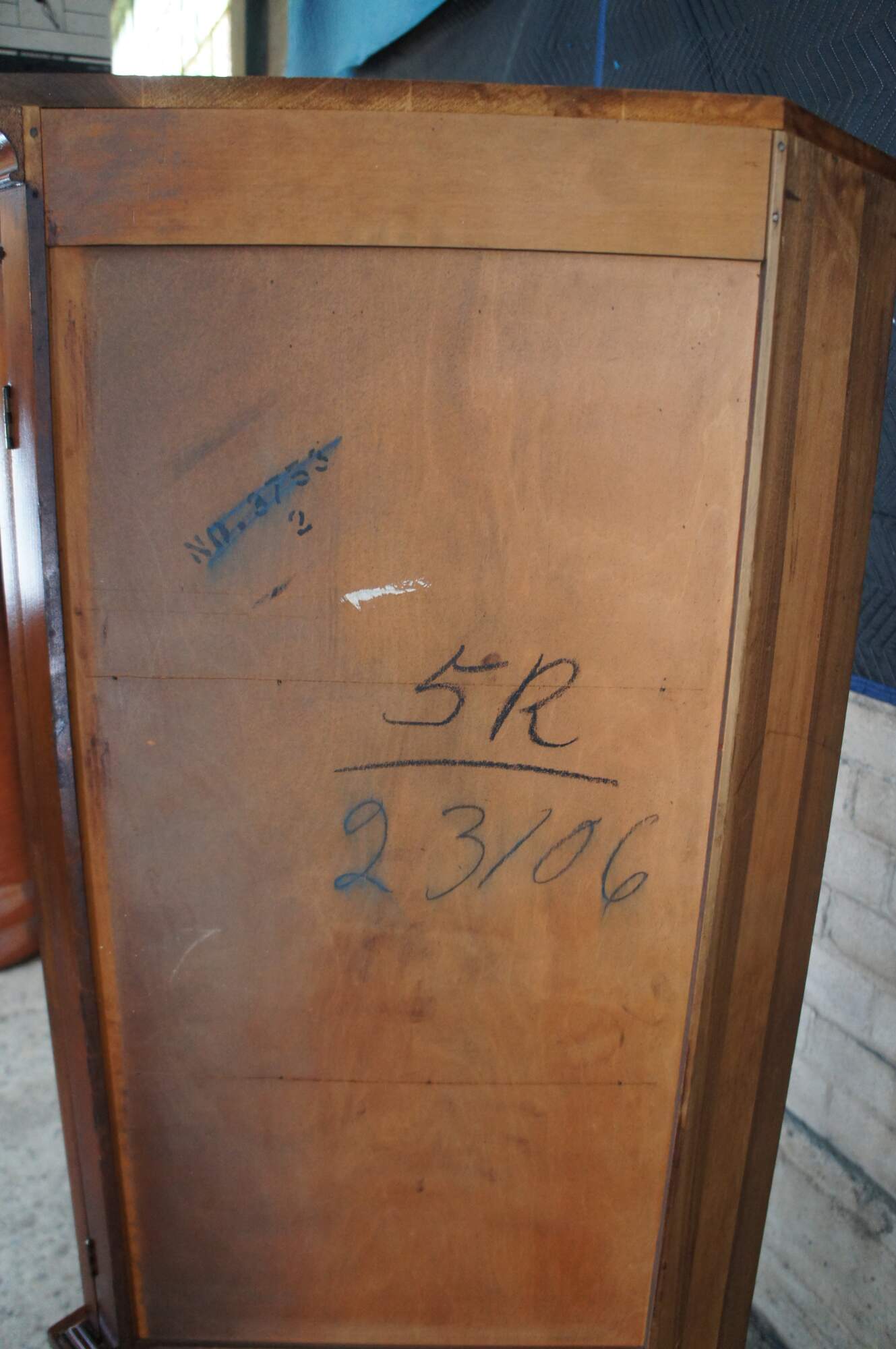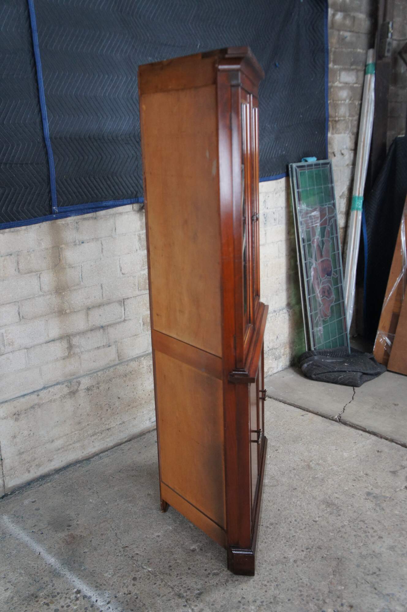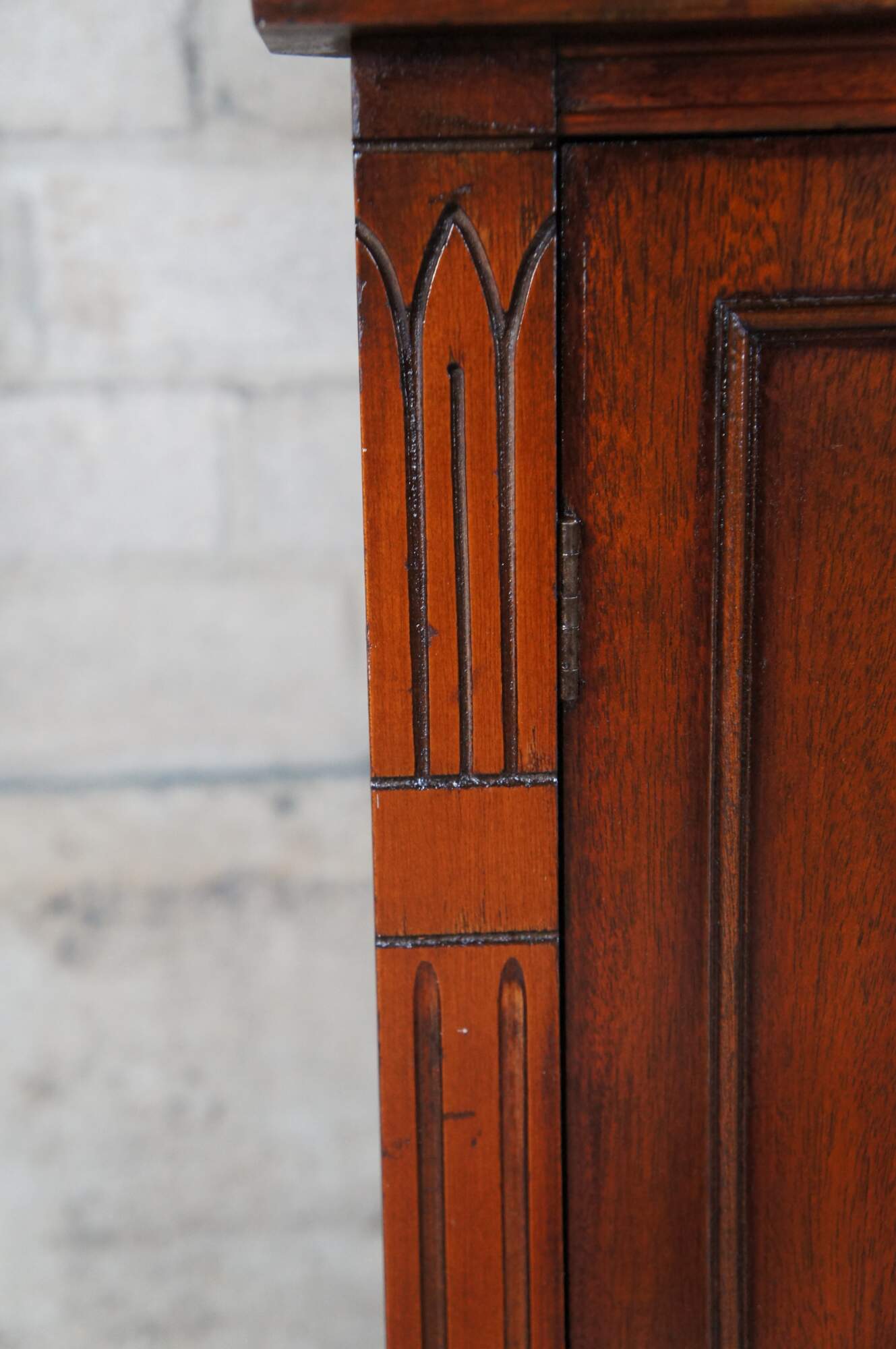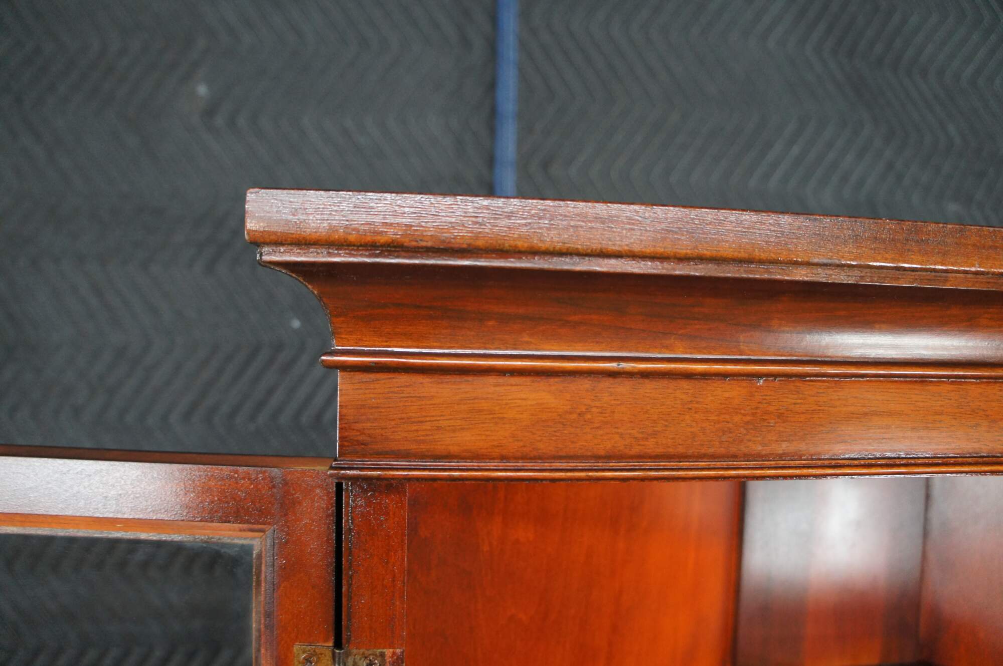 Traditional glass front corner cabinet, c. 1940s. Features a mahogany case with two glass covered doors along the front. The cabinet opens to two shelves with plate grooves along the top over a lower cabinet with shelf for accessory storage.