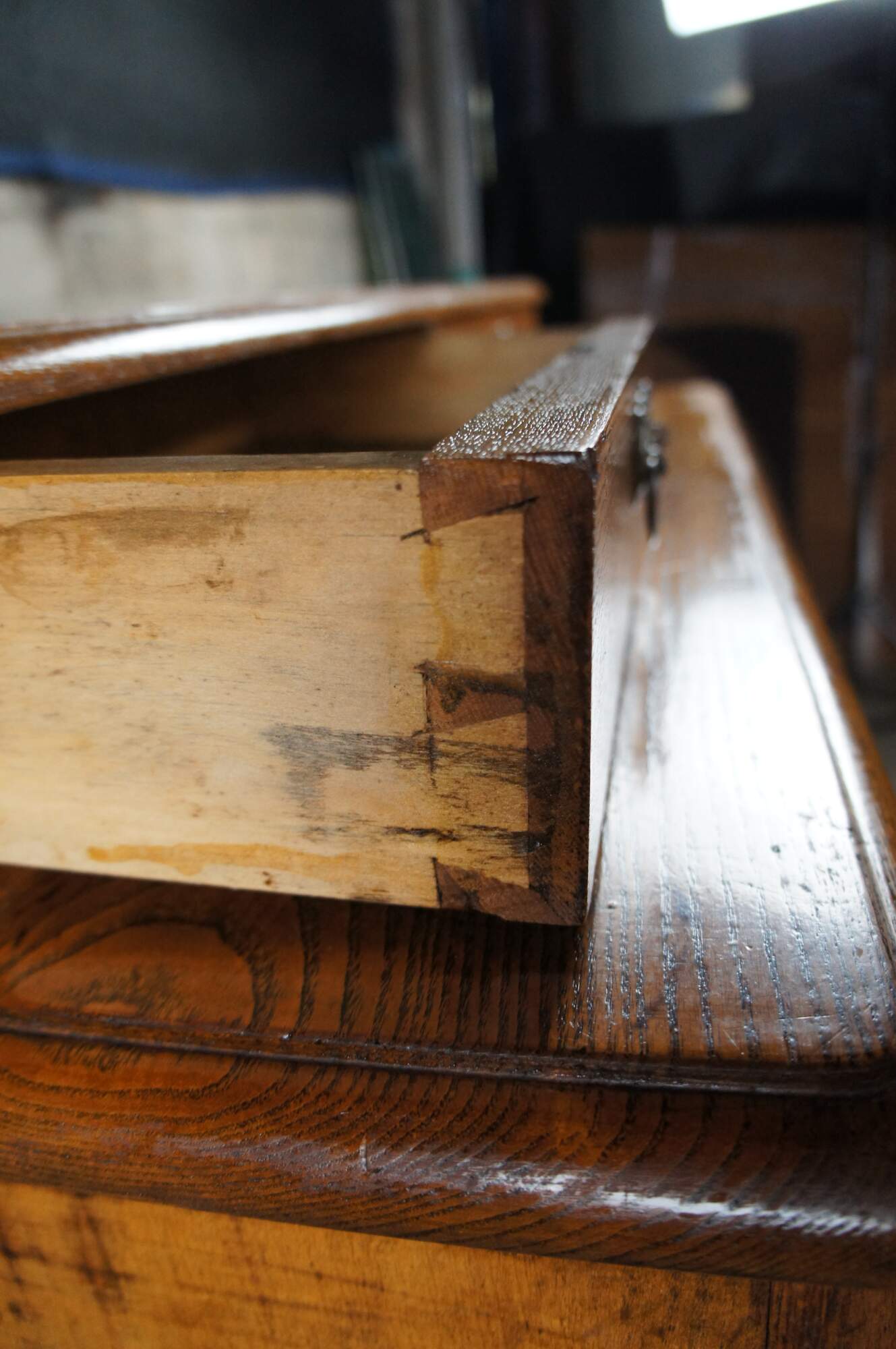Good Overall; Staining, marking and rings to top surfaces. Hardware updated. Hardware covering the key escutcheons along the top. Missing two locks as well as a chip to the trim around one escutcheon. Missing chamfered side panel along right side of glovebox. Structurally solid