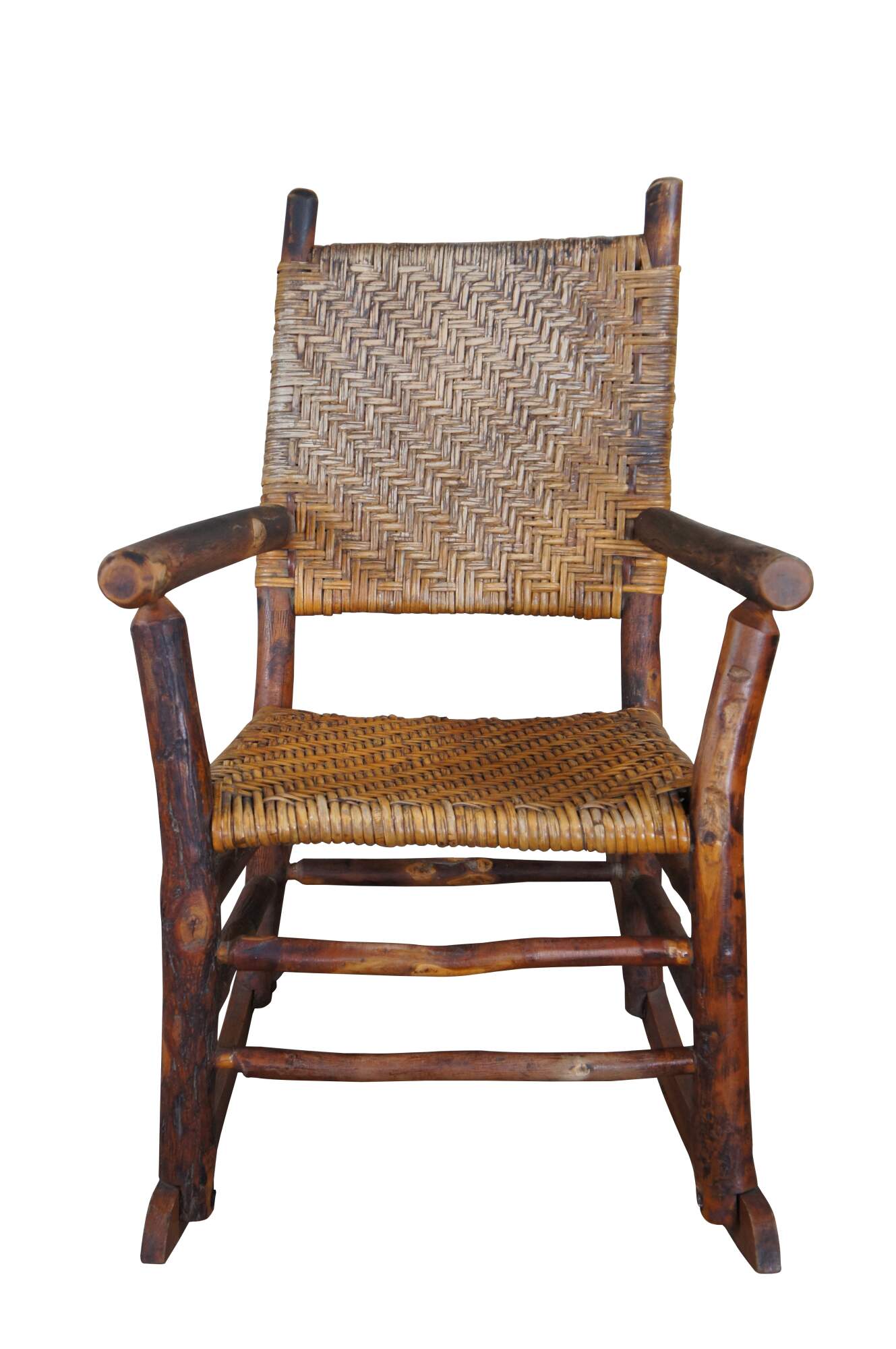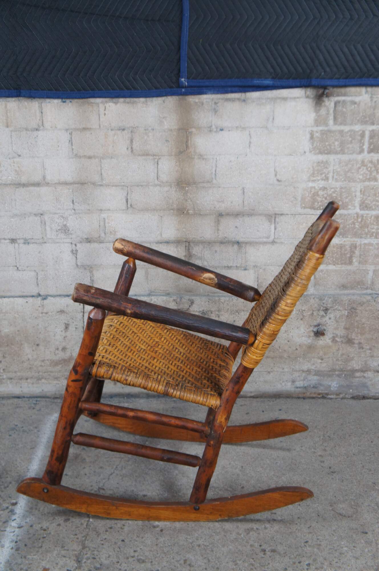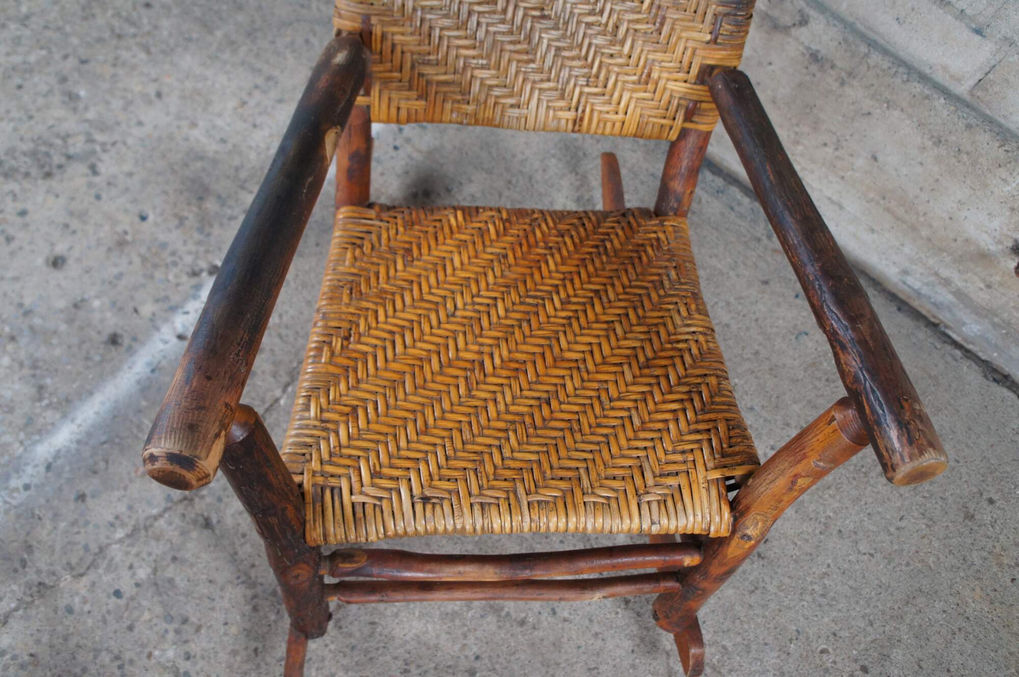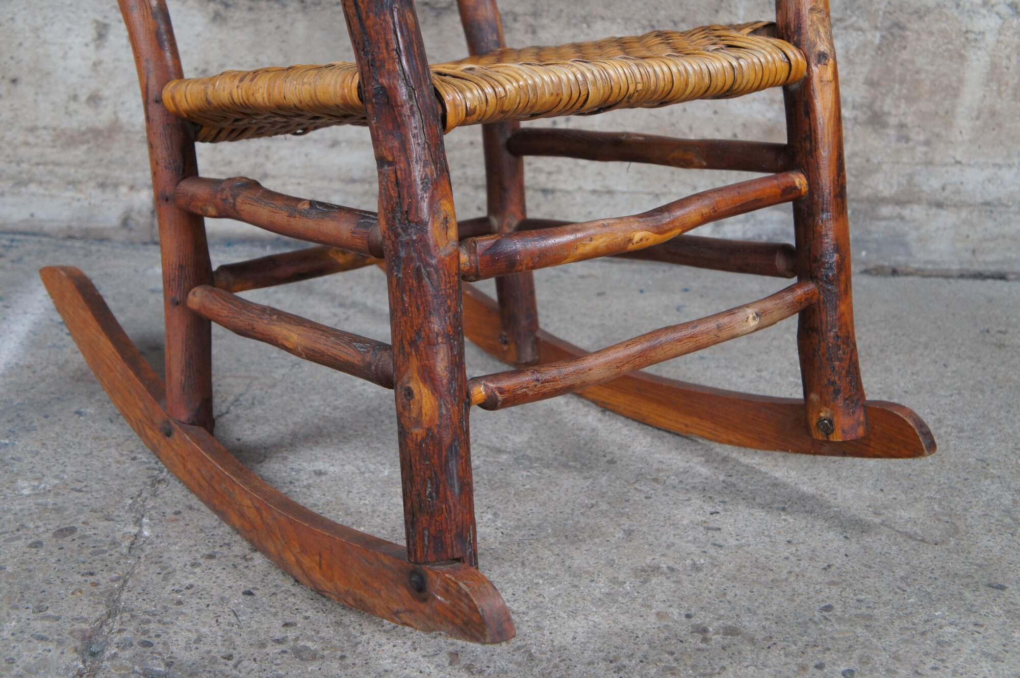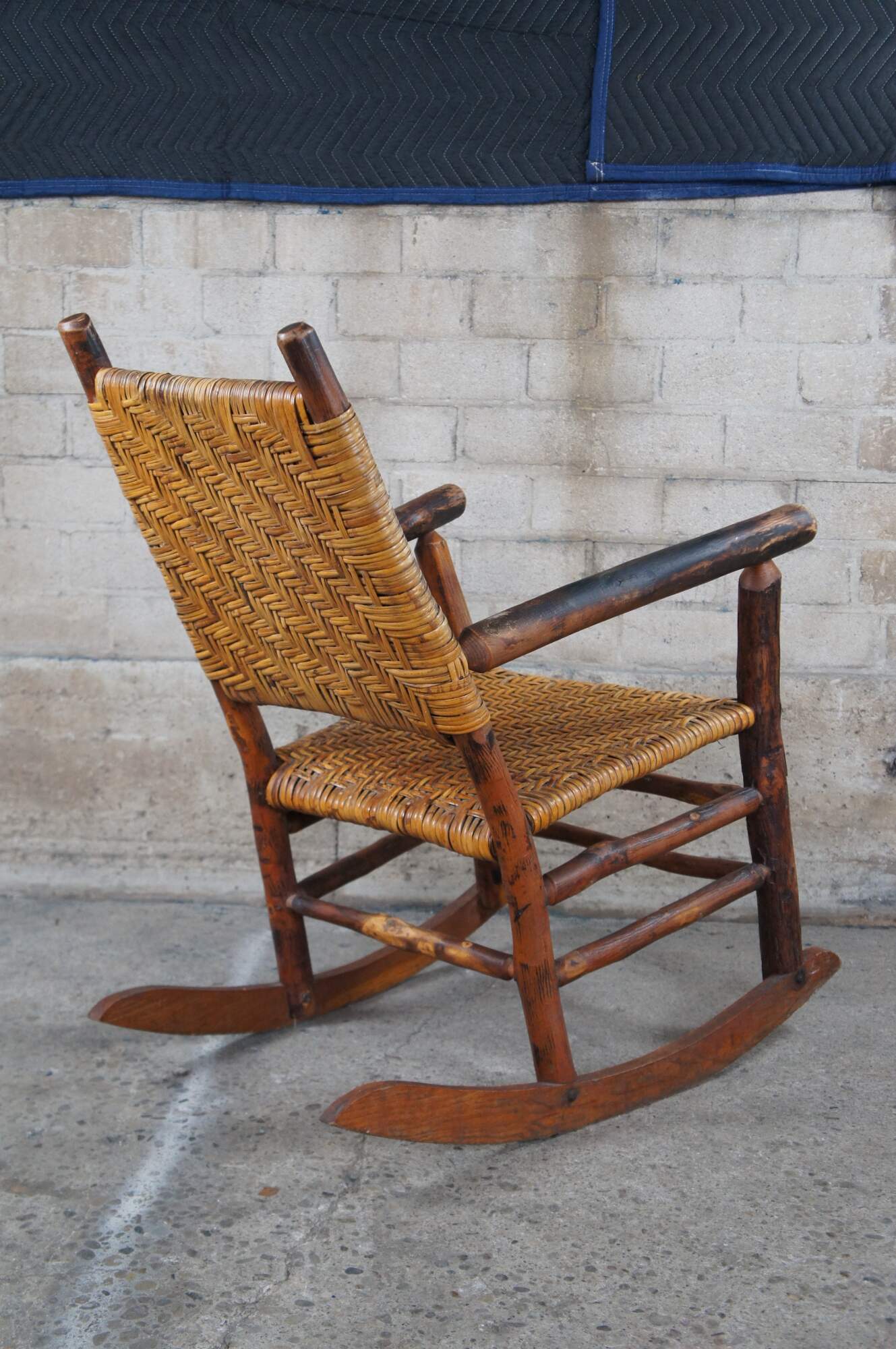 Mid 20th Century Hickory Adirondack rocking chair designed in the manner of Old Hickory Furniture. The chair is in the form of #21 an important and popular chair that was made by the company since the first part of the 20th century. Features a rustic design made from natural hickory logs with rattan woven seat and back.