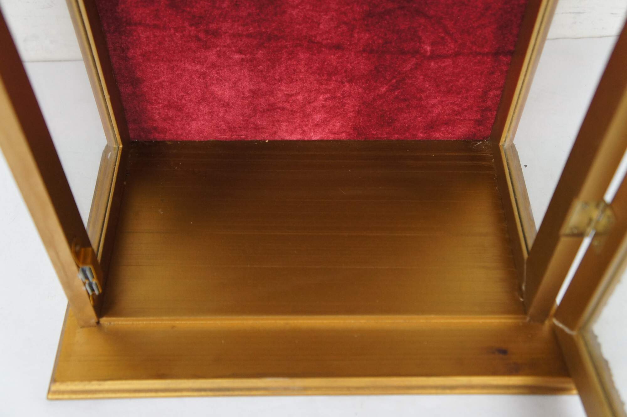20th century vintage display case / tabletop vitrine / cabinet. Made of gilt wood with glass front / sides, backed with burgndy velvet. Pedimaent and door are decorated with carved foliate / acanthus / beaded details. Handle pull adorned with globe / world charm.