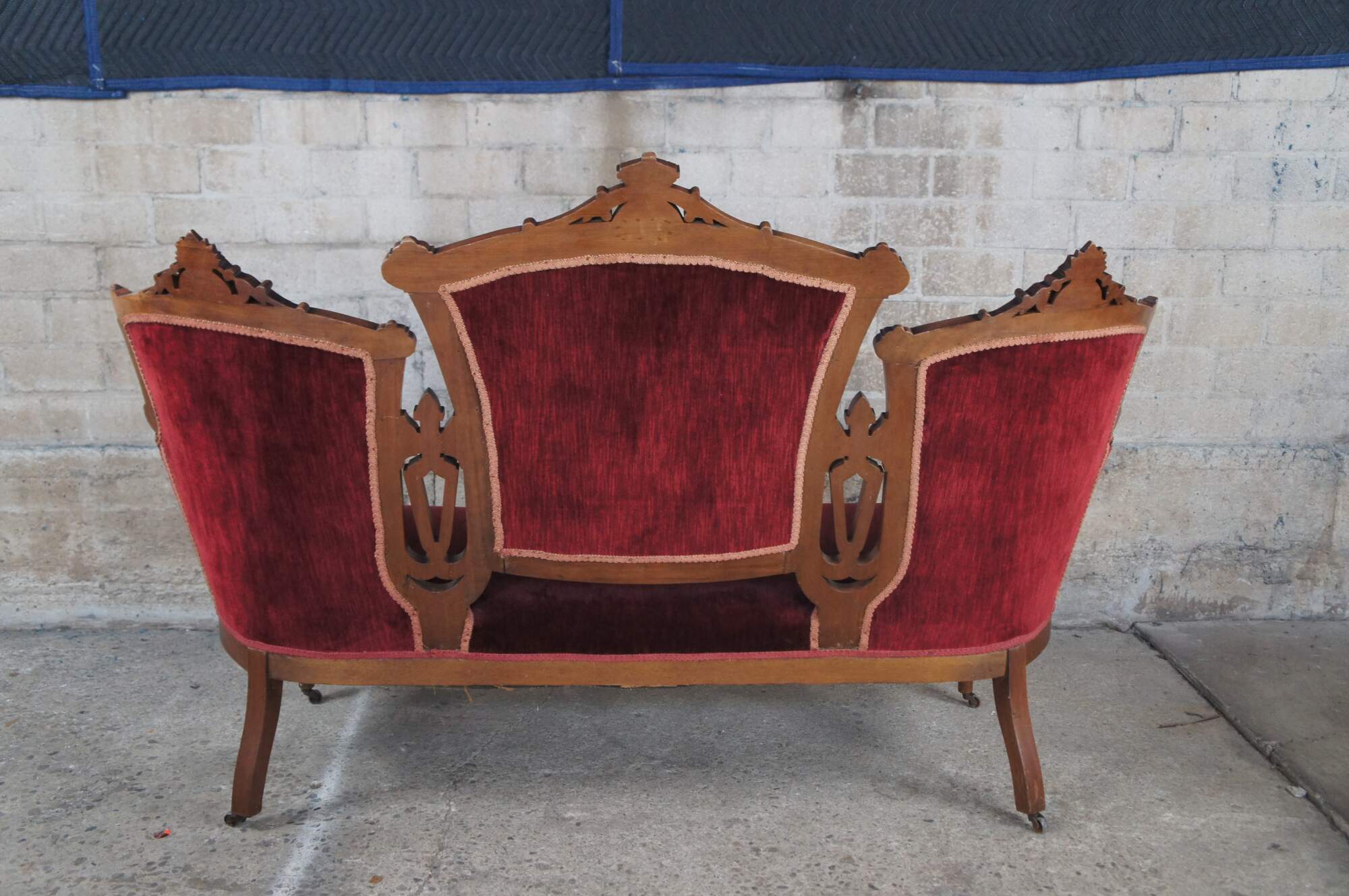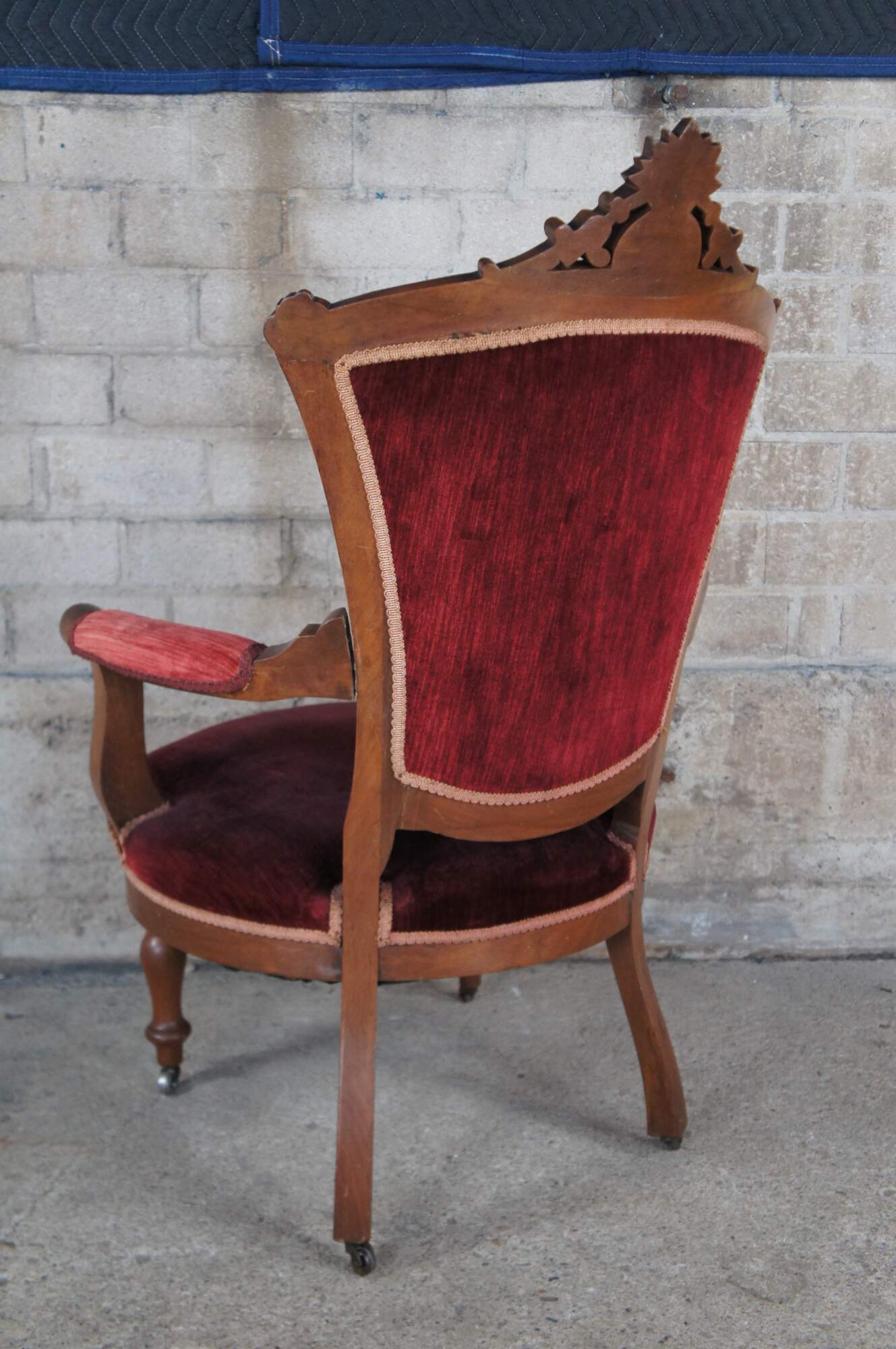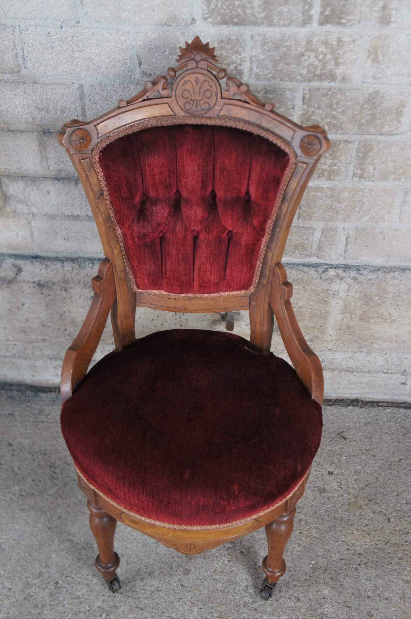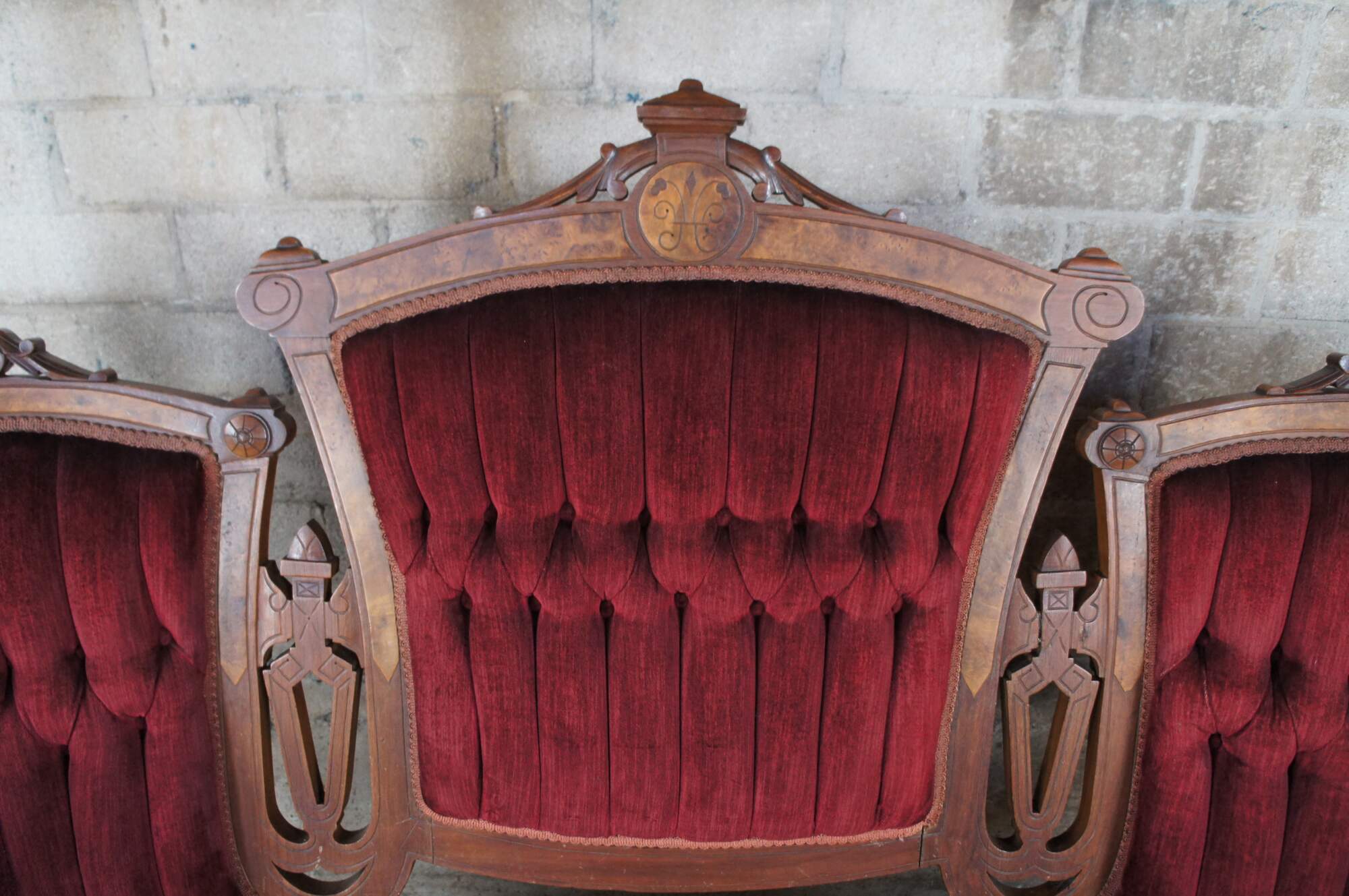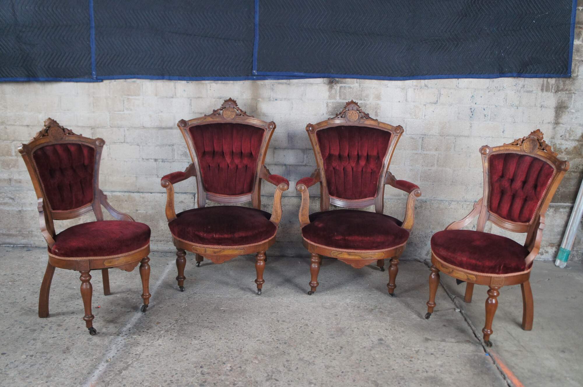 Antique Victorian parlor suite. Made of walnut featuring Eastlake styling with carved reticulated floral crowns and tufted velvet upholstery supported by turned legs on castors. Set includes settee bench seat / loveseat, two armchairs with padded arms, and two side chairs.
