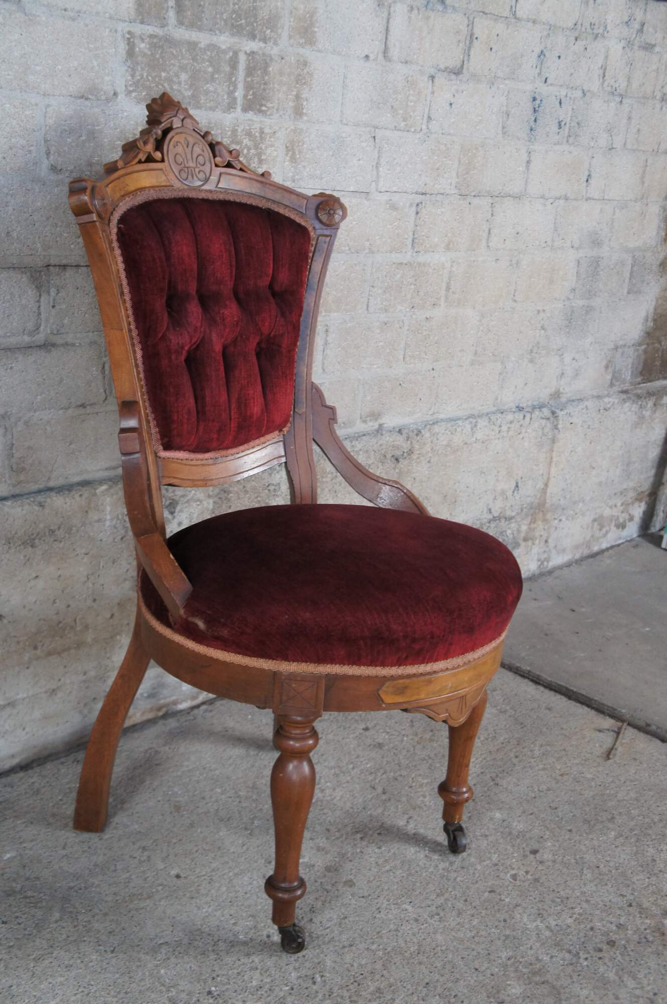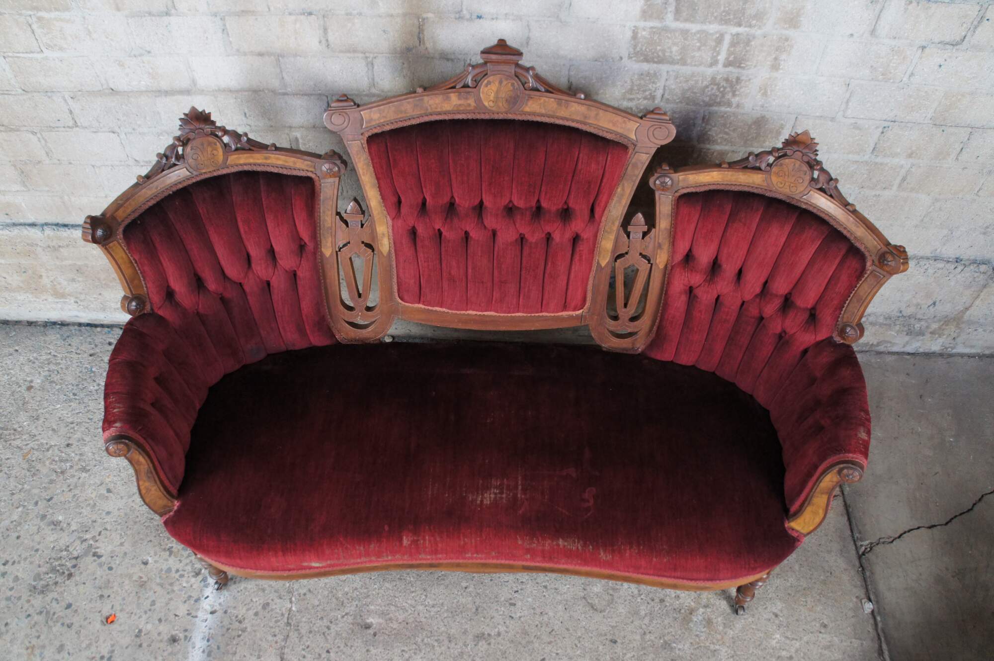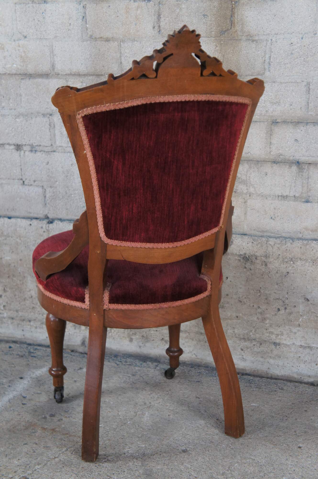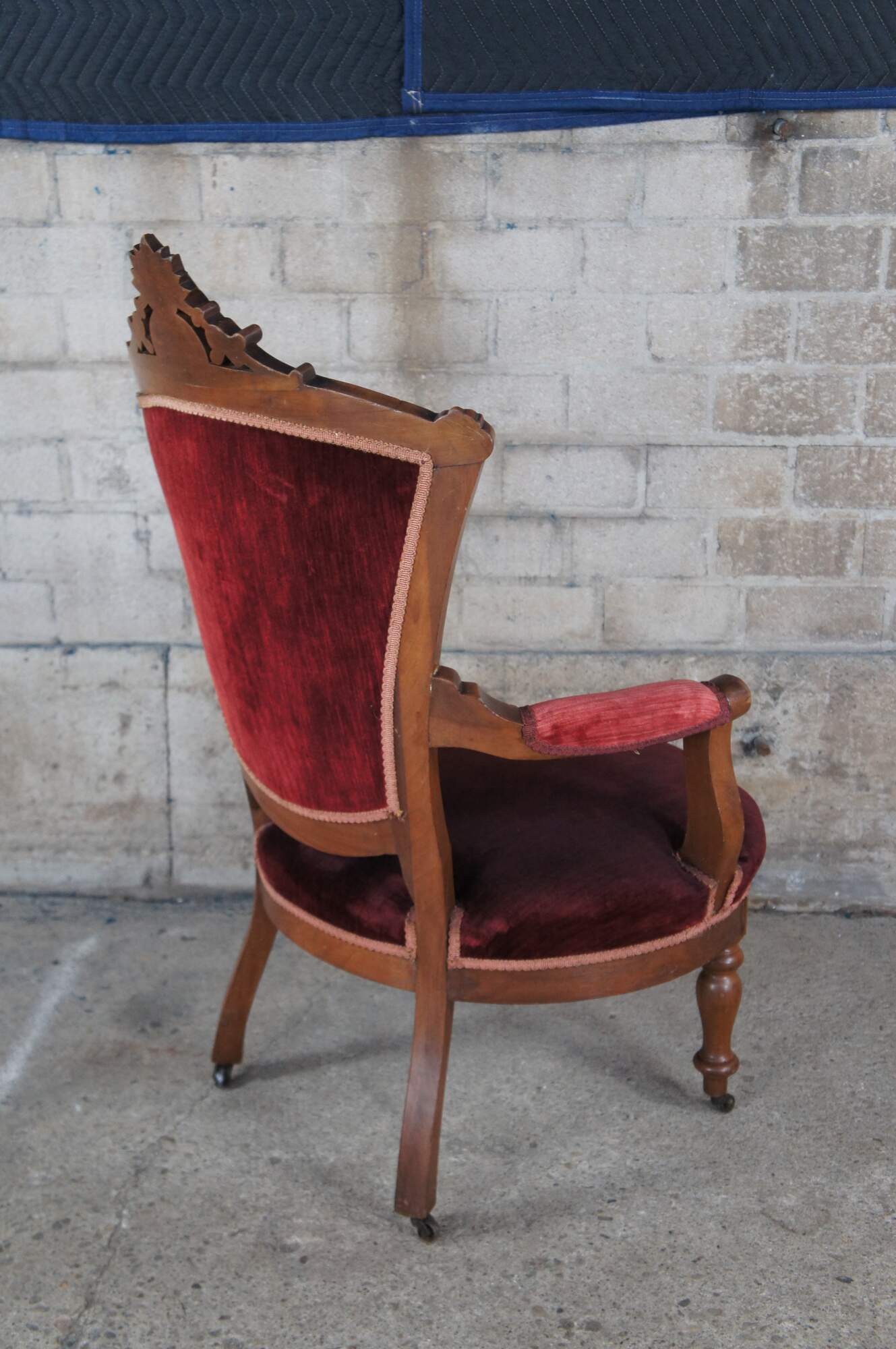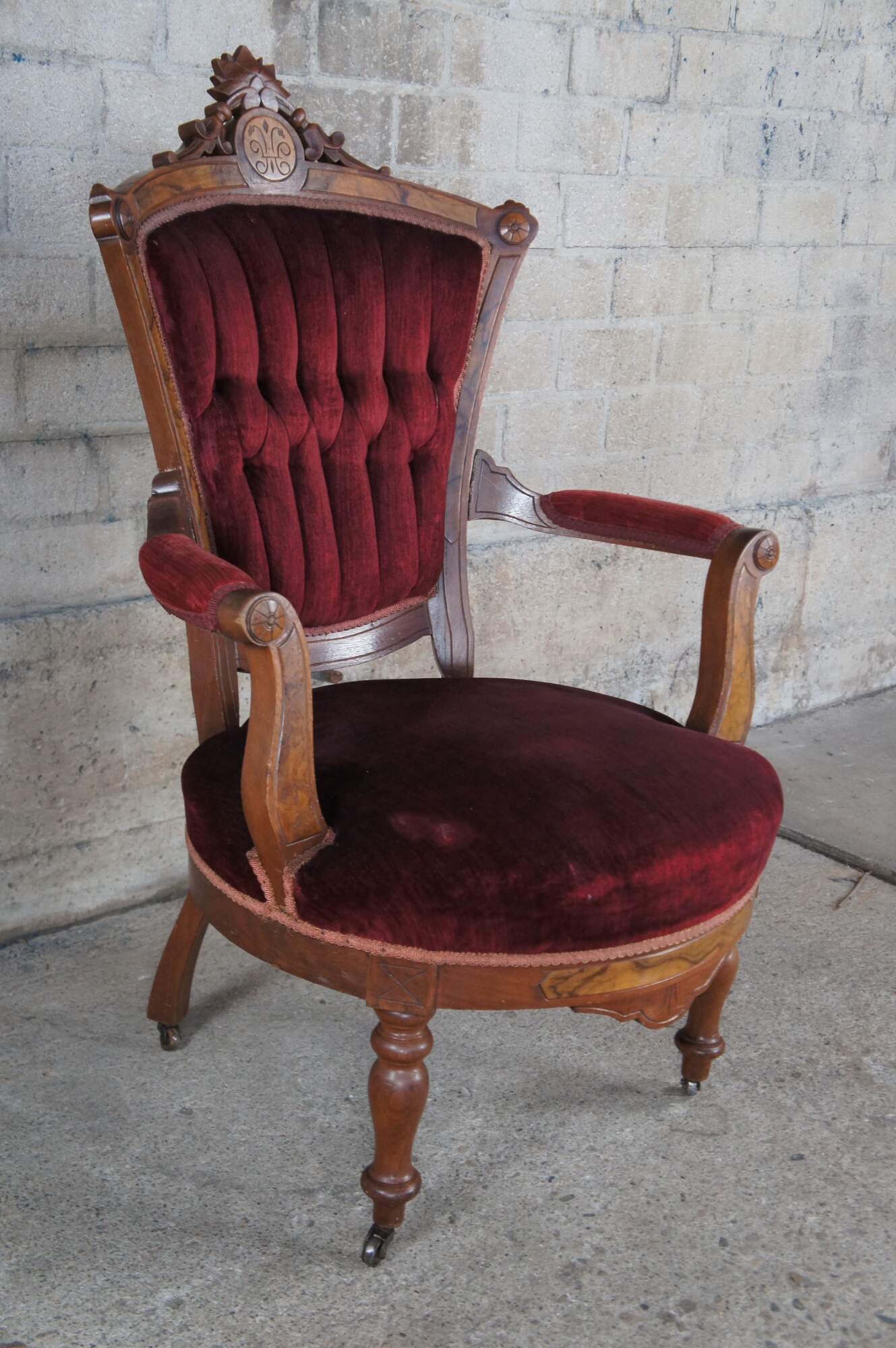 Antique Victorian parlor suite. Made of walnut featuring Eastlake styling with carved reticulated floral crowns and tufted velvet upholstery supported by turned legs on castors. Set includes settee bench seat / loveseat, two armchairs with padded arms, and two side chairs.