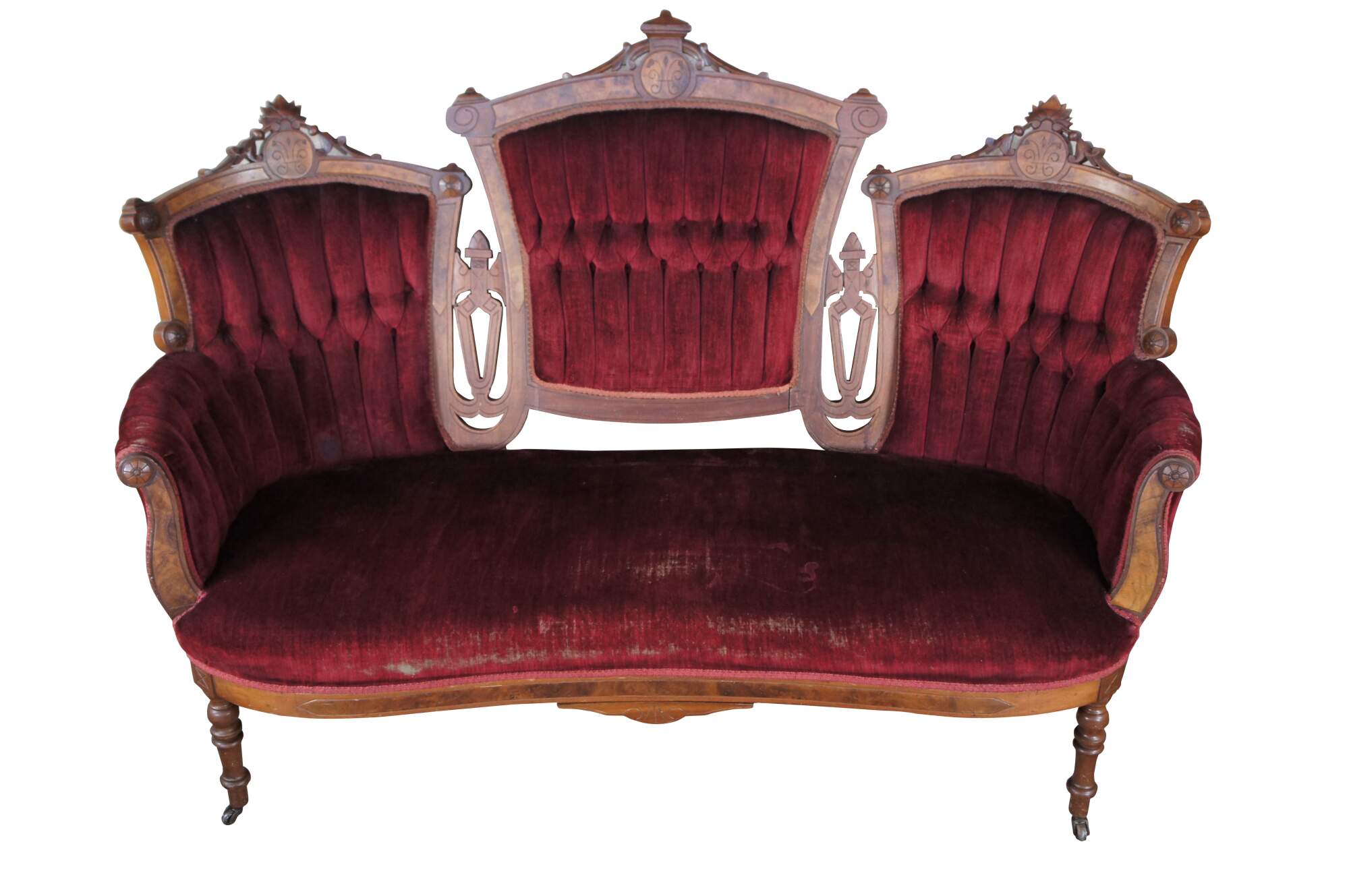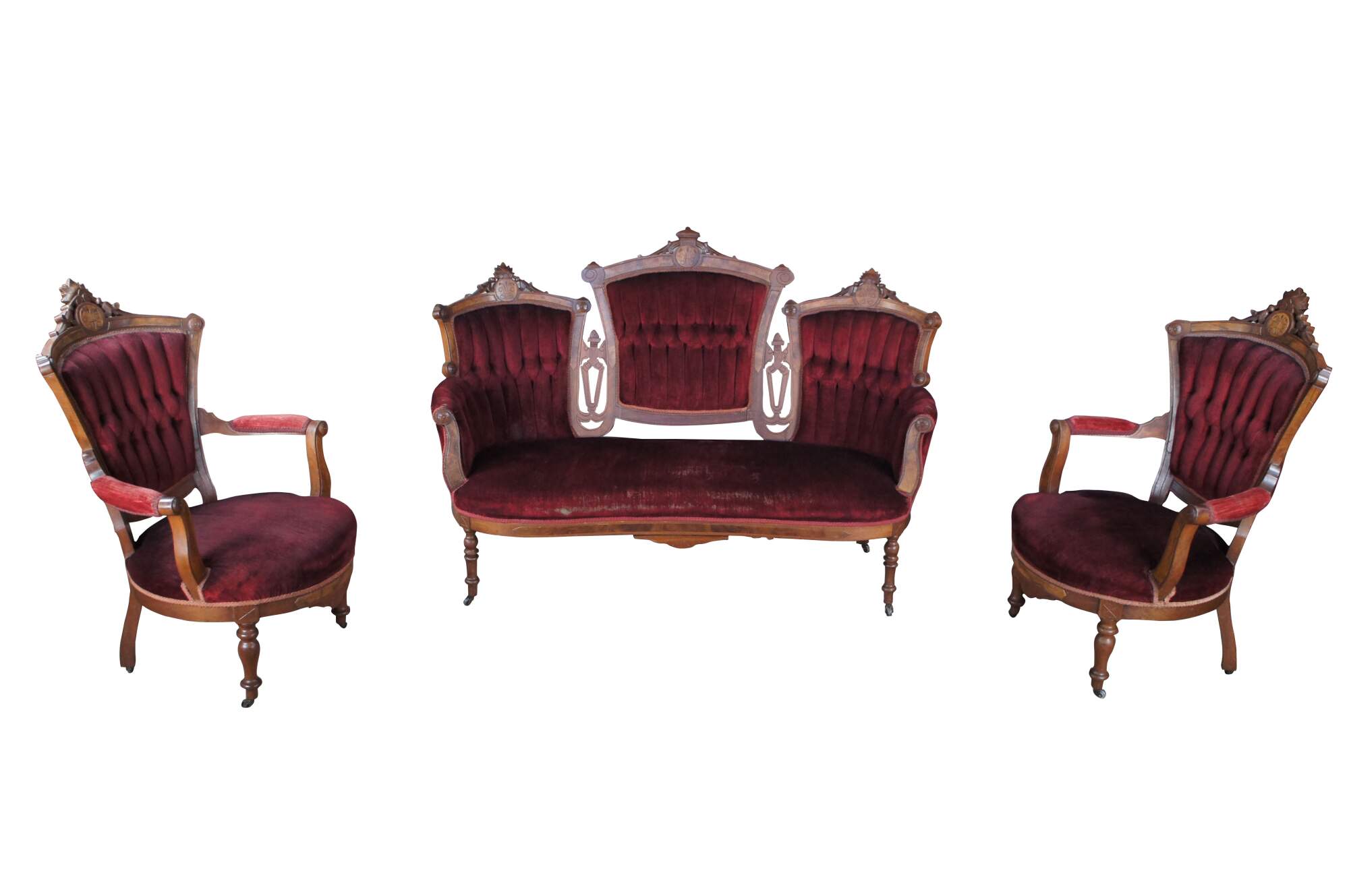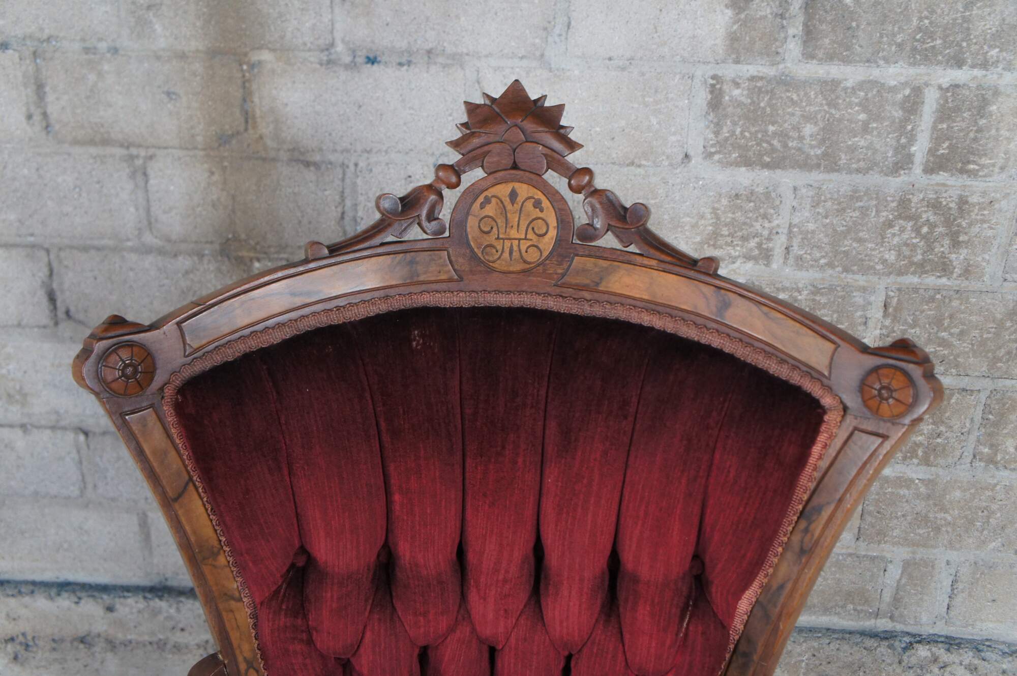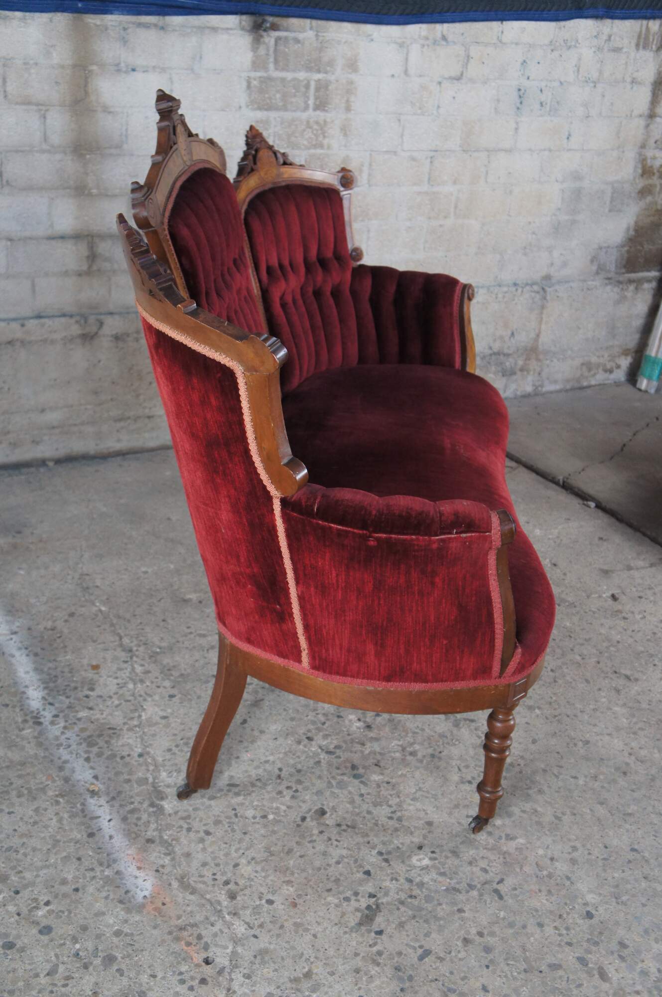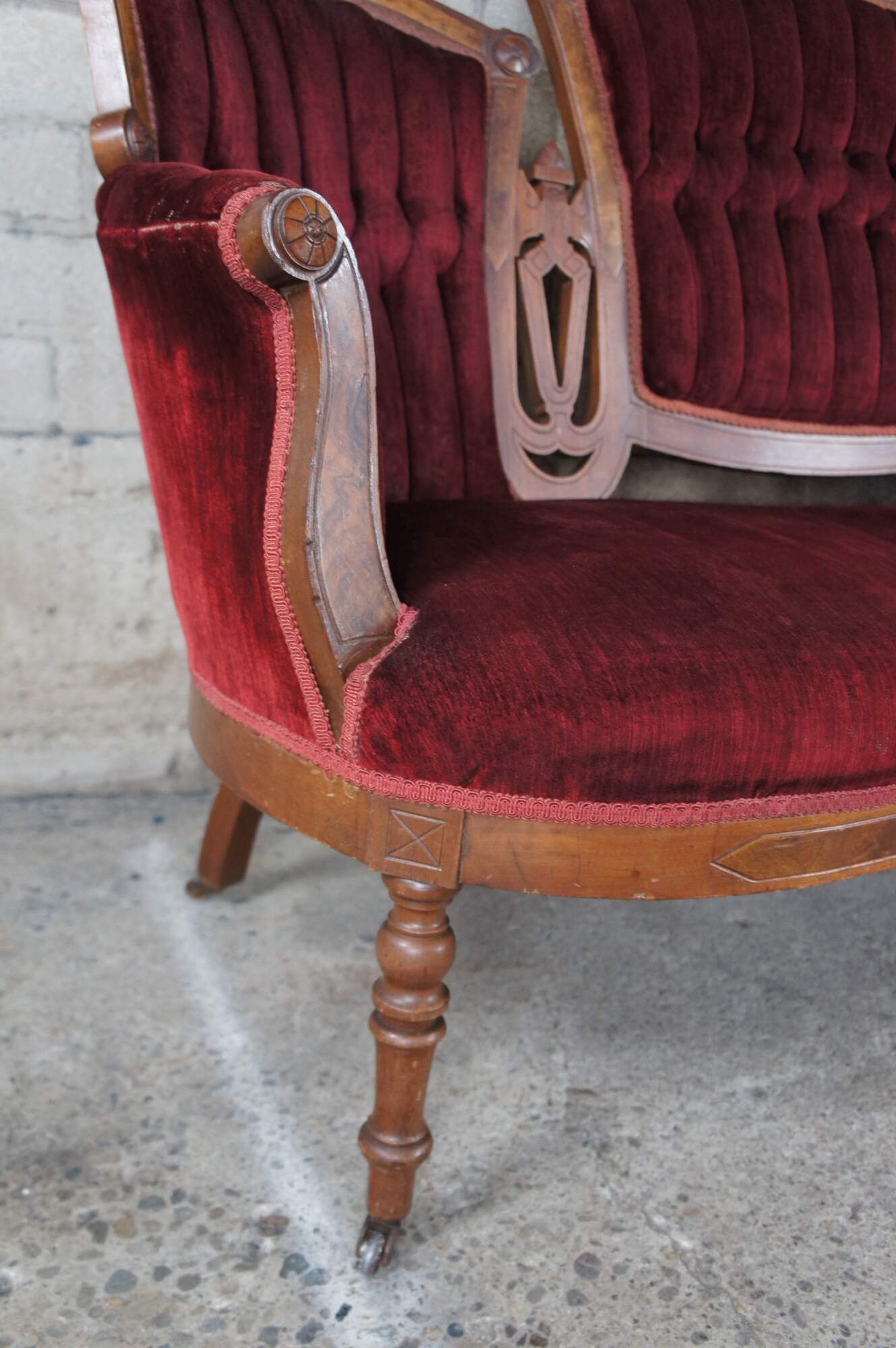 Antique Victorian parlor suite. Made of walnut featuring Eastlake styling with carved reticulated floral crowns and tufted velvet upholstery supported by turned legs on castors. Set includes settee bench seat / loveseat, two armchairs with padded arms, and two side chairs.