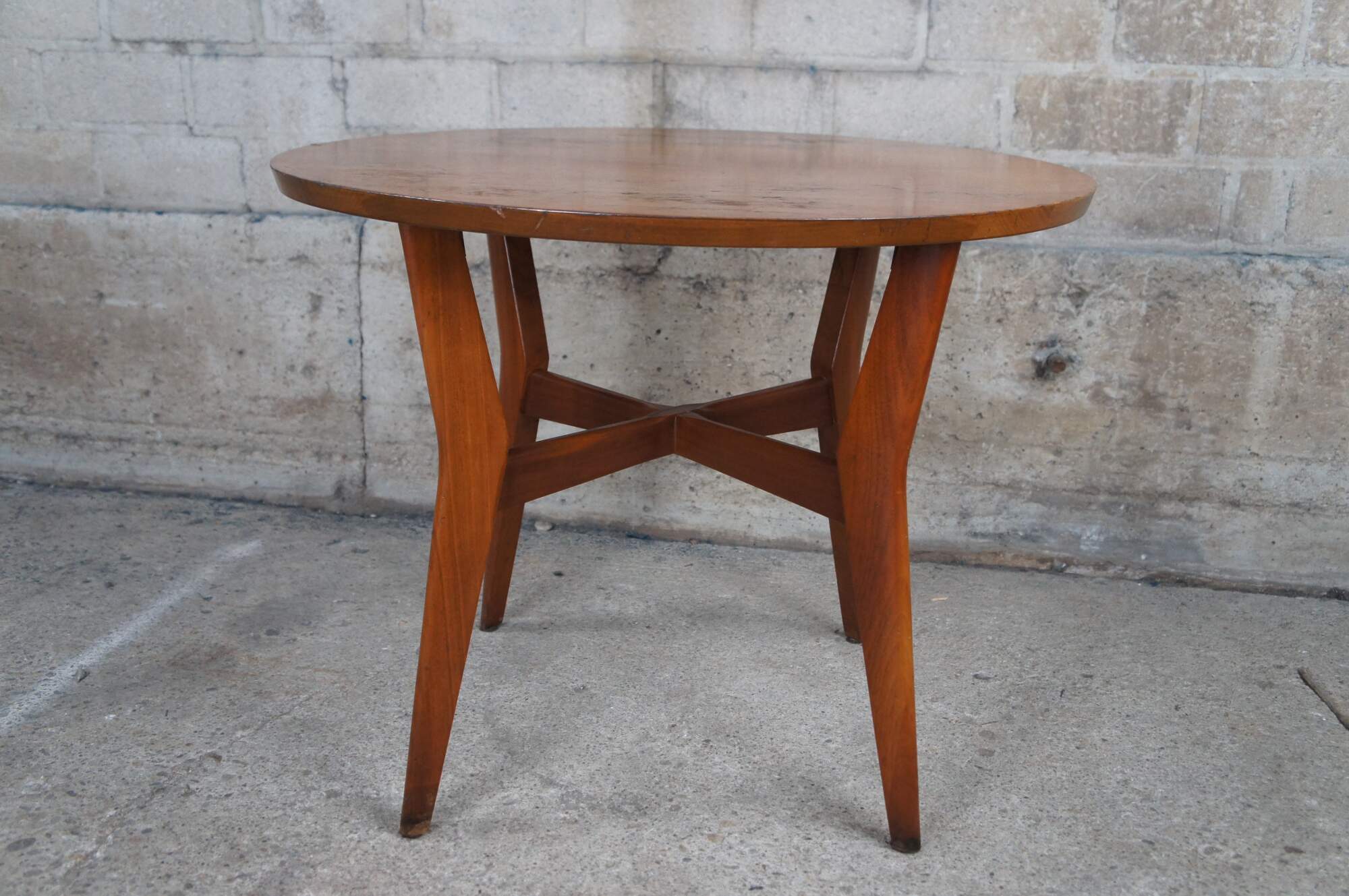 Mid Century Scandanavian style side table by Mersman. Features a round form crafted from walnut with contoured boomerang legs connected by an X stretcher.
