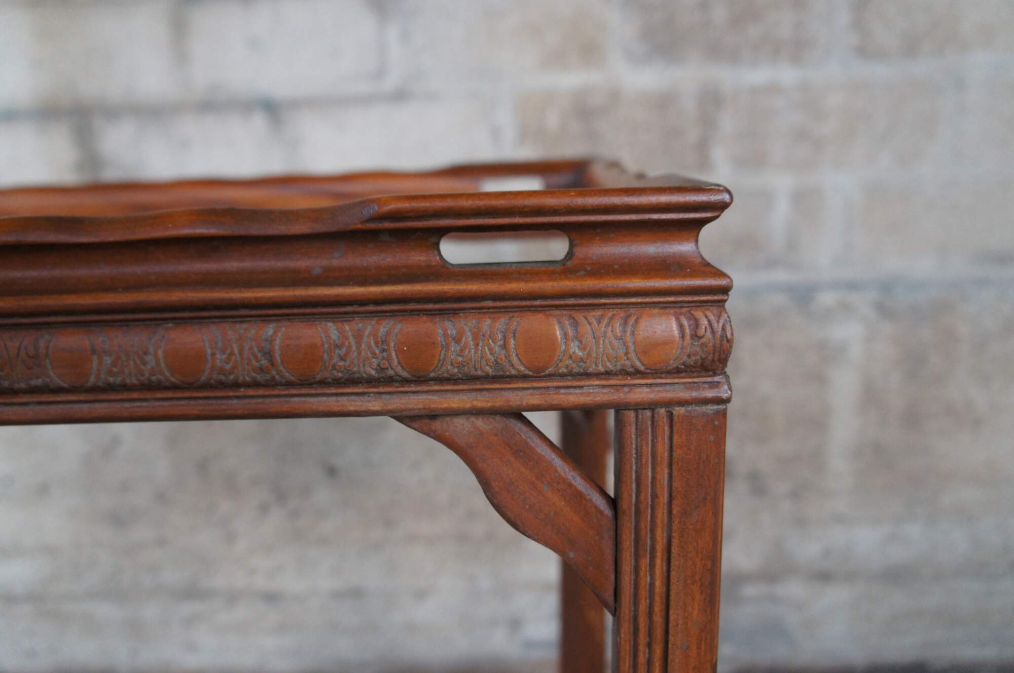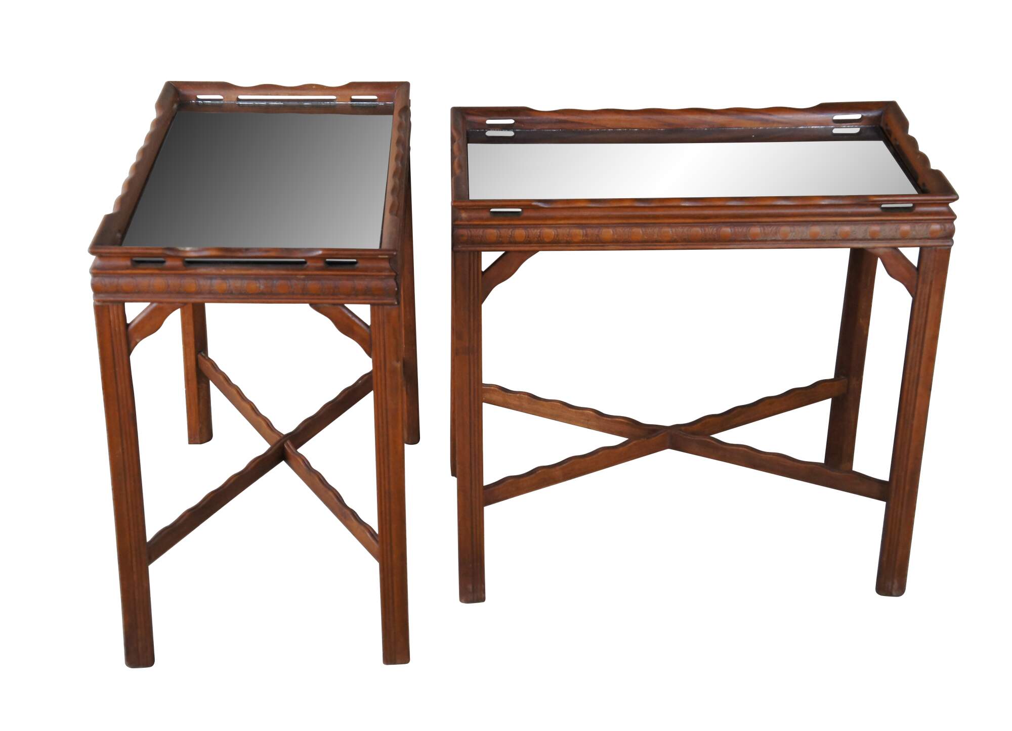 Pair of two George III / Chippendale style side tables. Made of mahogany featuring a reticulated gallery tray style top with inset glass, egg and dart molding, fluted legs and serpentine x stretcher.