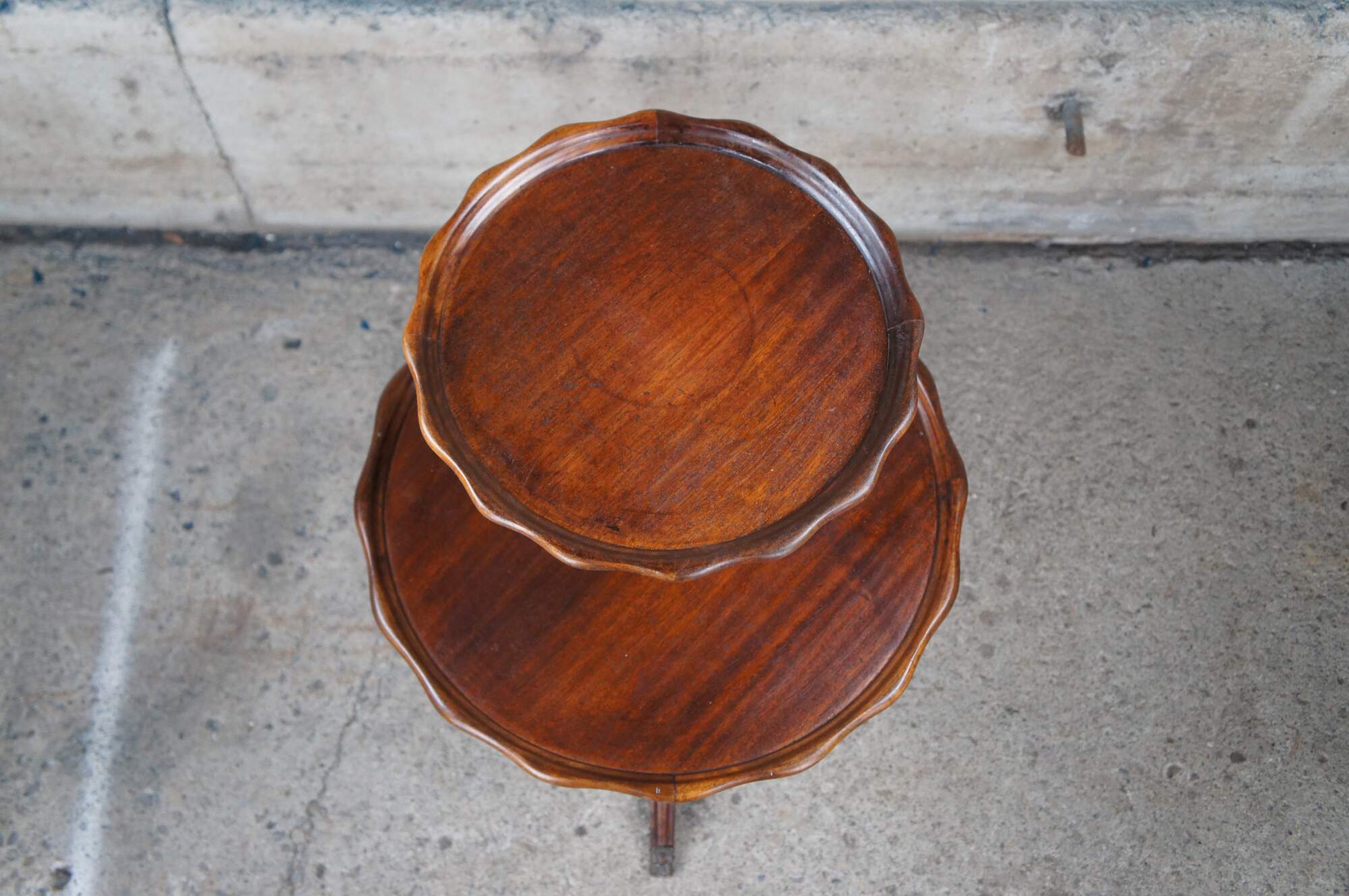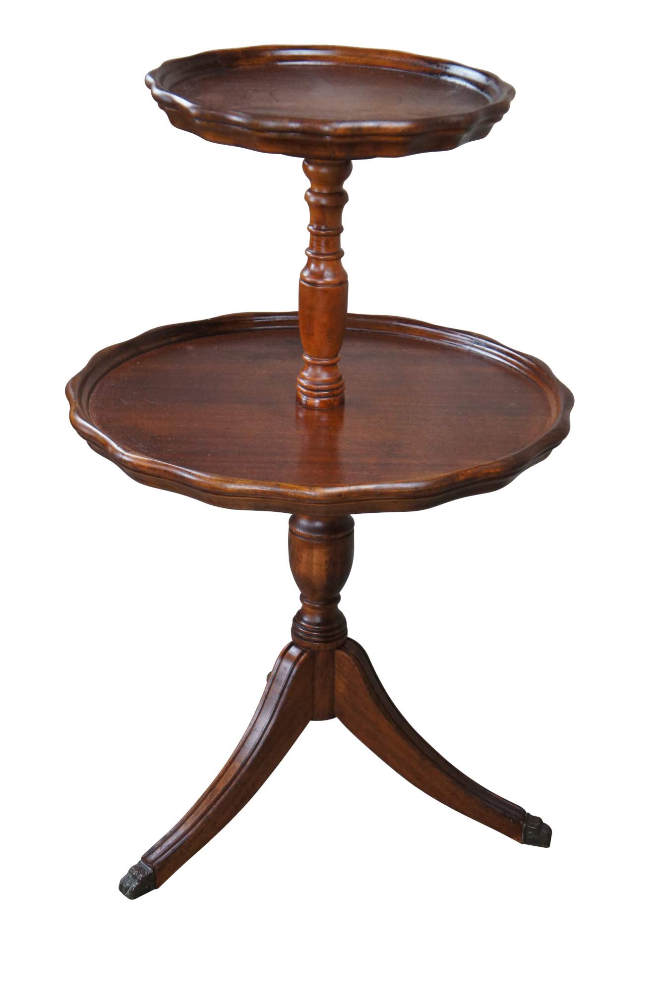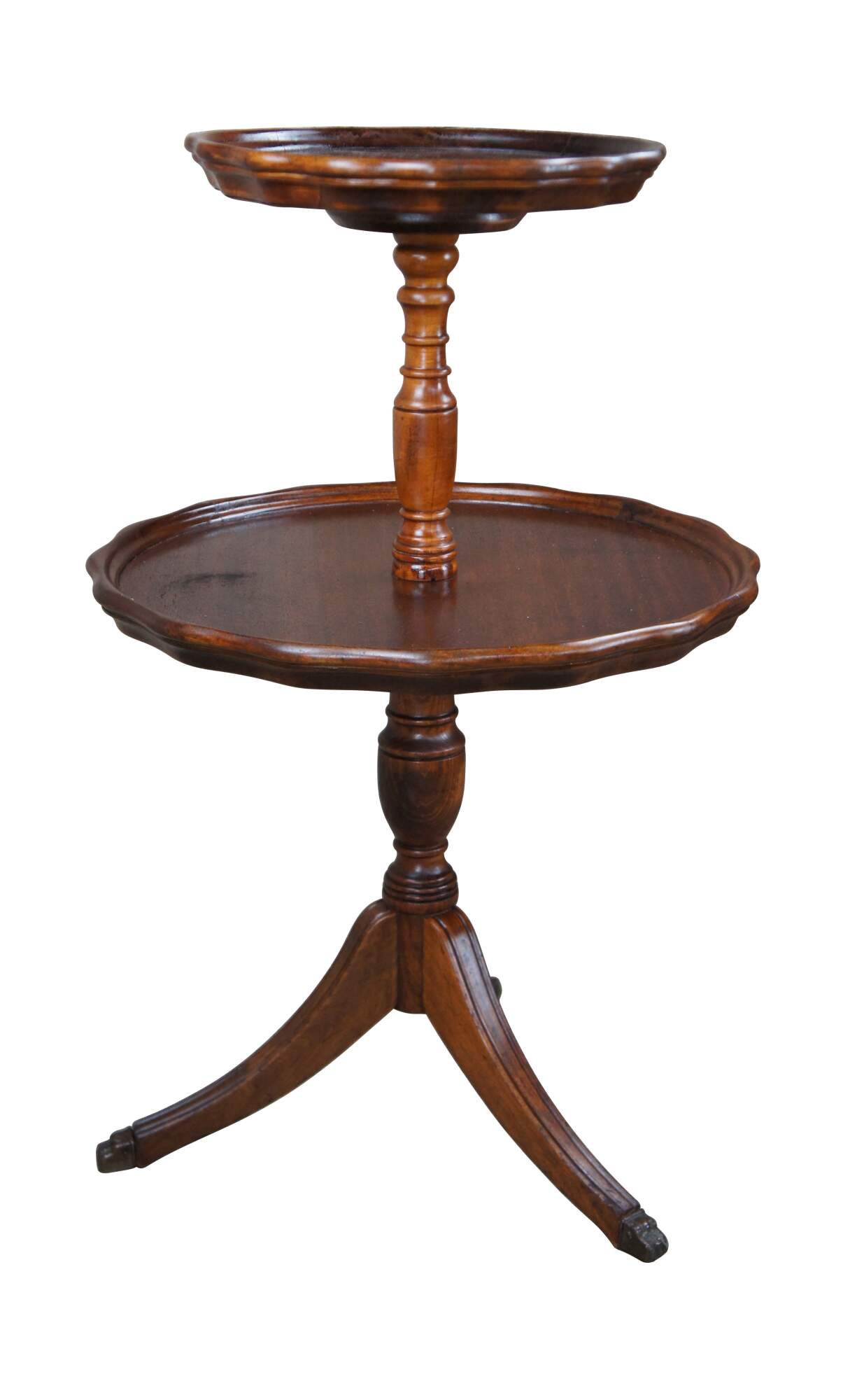 Vintage / Mid century two tier English Walnut dumbwaiter side table featuring serpentine pie crust edge with turned supports and Duncan Phyfe tripod style pedestal base with fluted and flared saber leggs and brass capped feet.