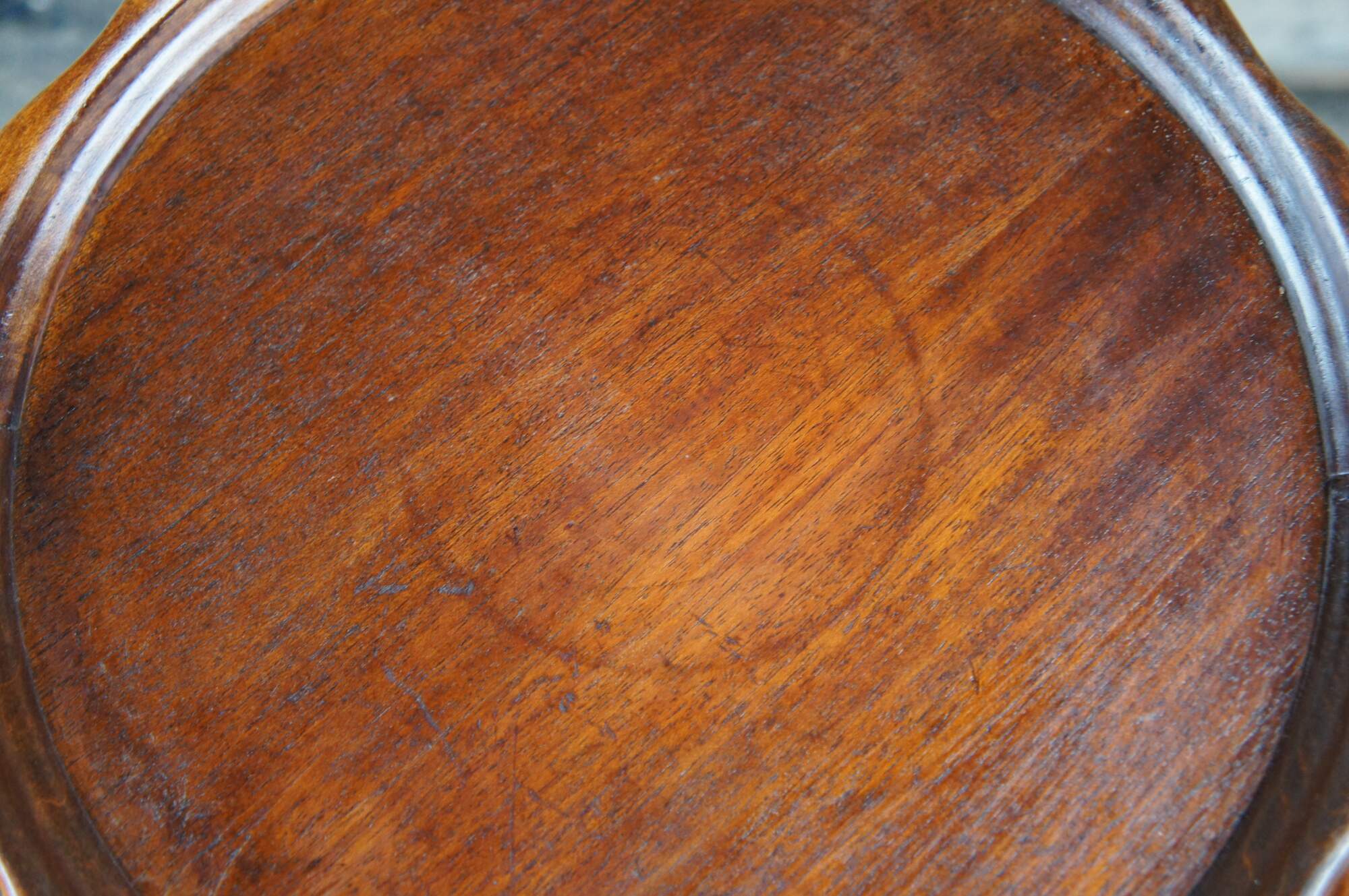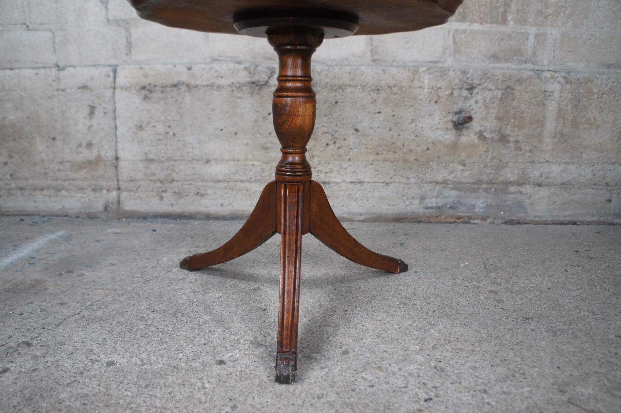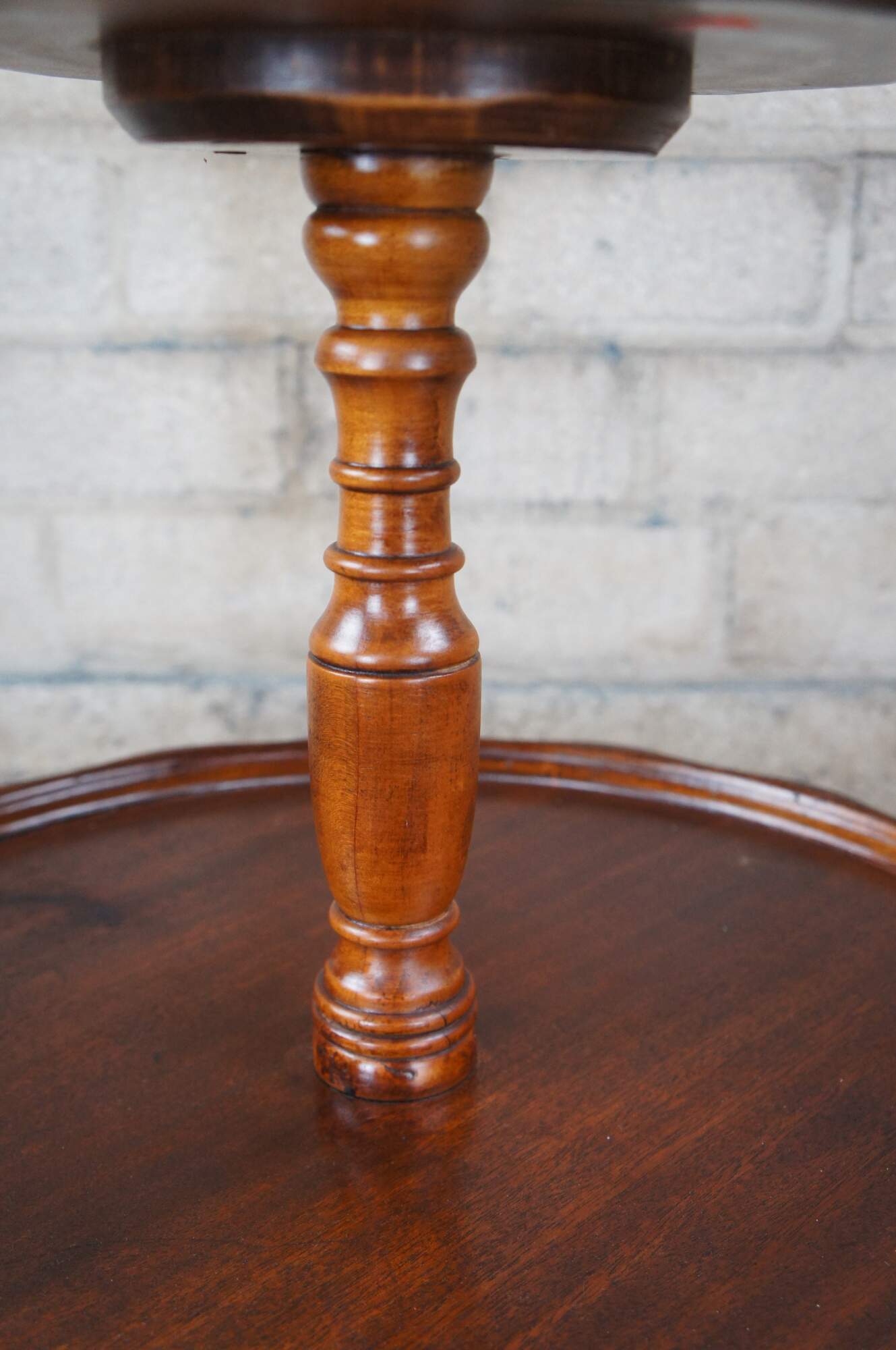 Vintage / Mid century two tier English Walnut dumbwaiter side table featuring serpentine pie crust edge with turned supports and Duncan Phyfe tripod style pedestal base with fluted and flared saber leggs and brass capped feet.