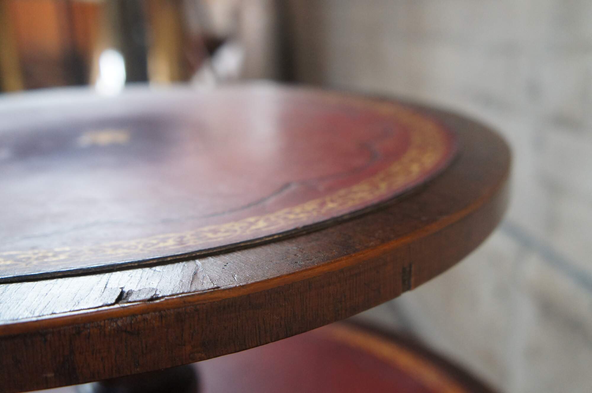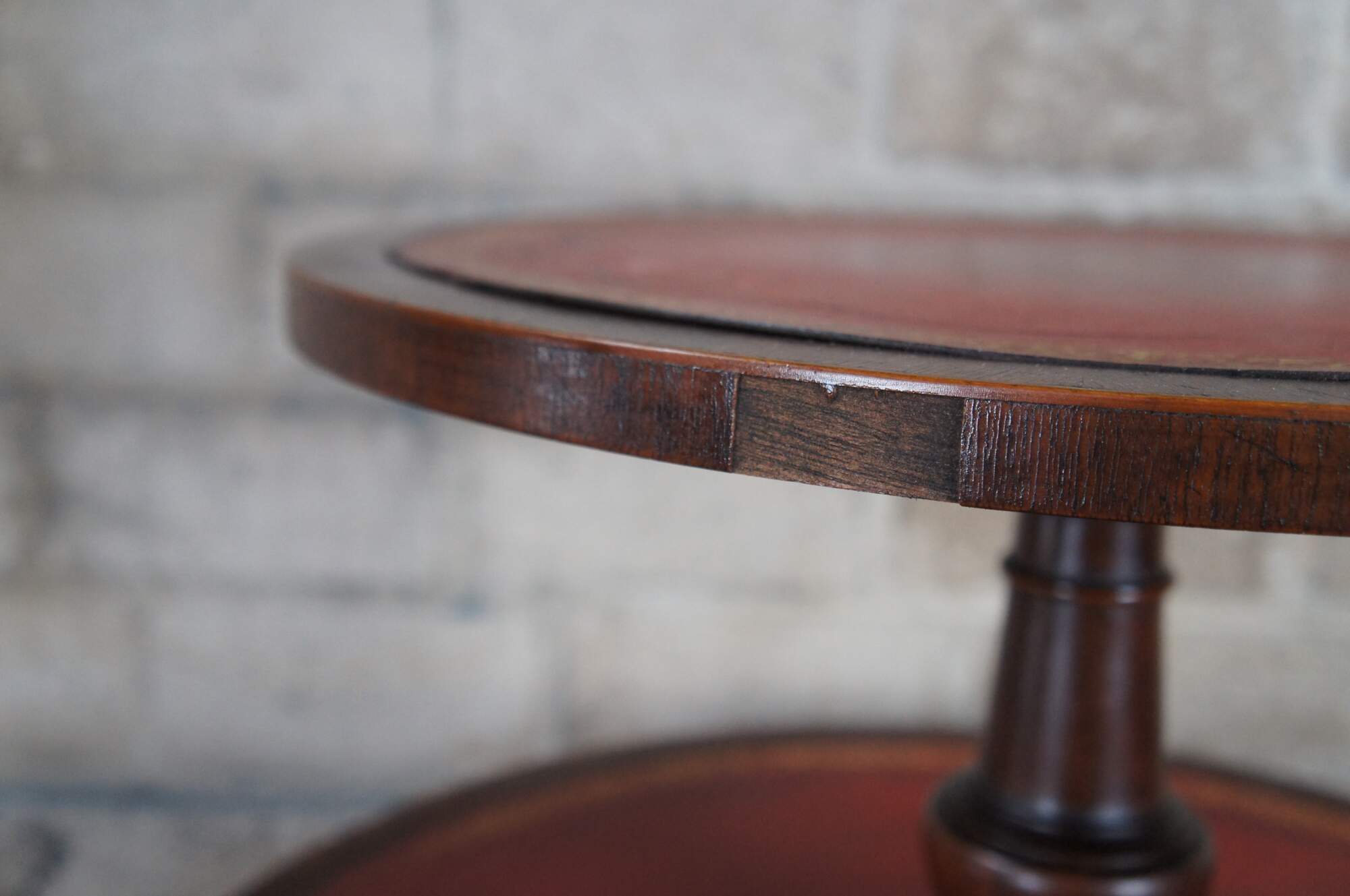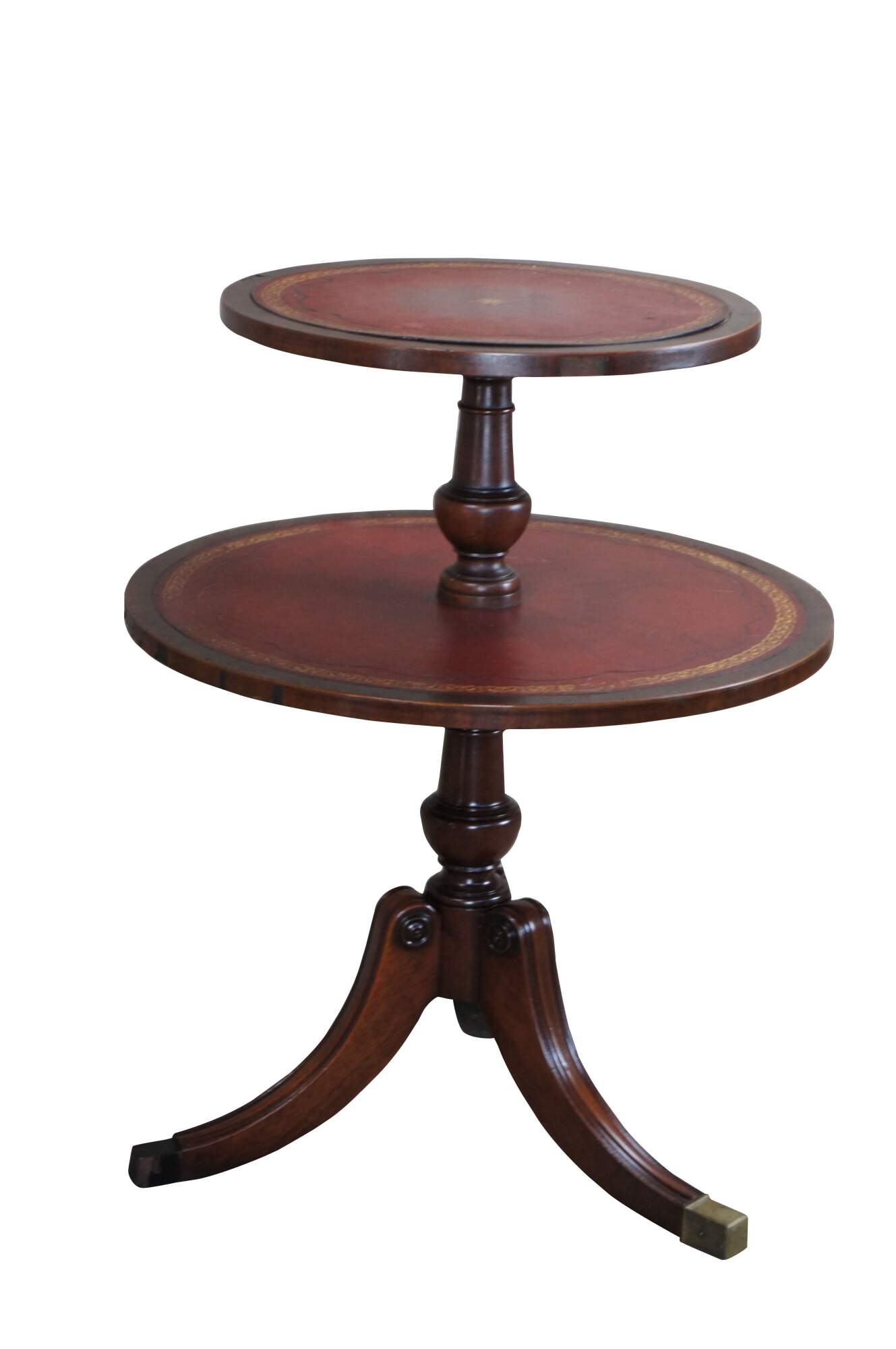 A quaint mid century Regency style dumbwaiter table. Made from mahogany with two tiered tooled red leather top. Features baluster turned supports and three downswept saber legs. Great for use to display collectibles, serve desserts or even a side / end table.
