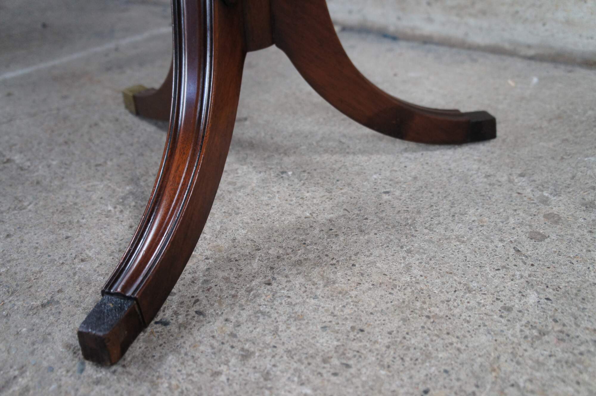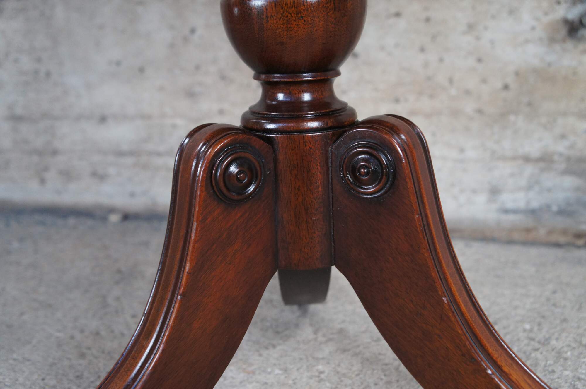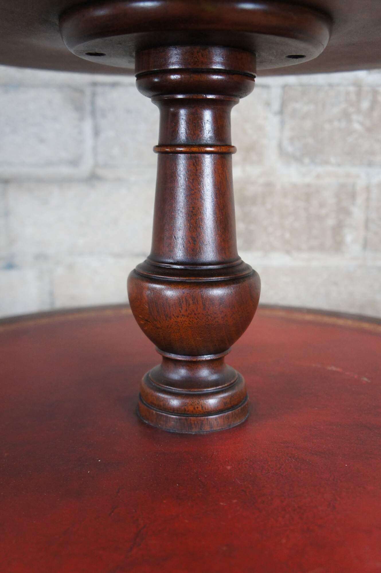 A quaint mid century Regency style dumbwaiter table. Made from mahogany with two tiered tooled red leather top. Features baluster turned supports and three downswept saber legs. Great for use to display collectibles, serve desserts or even a side / end table.