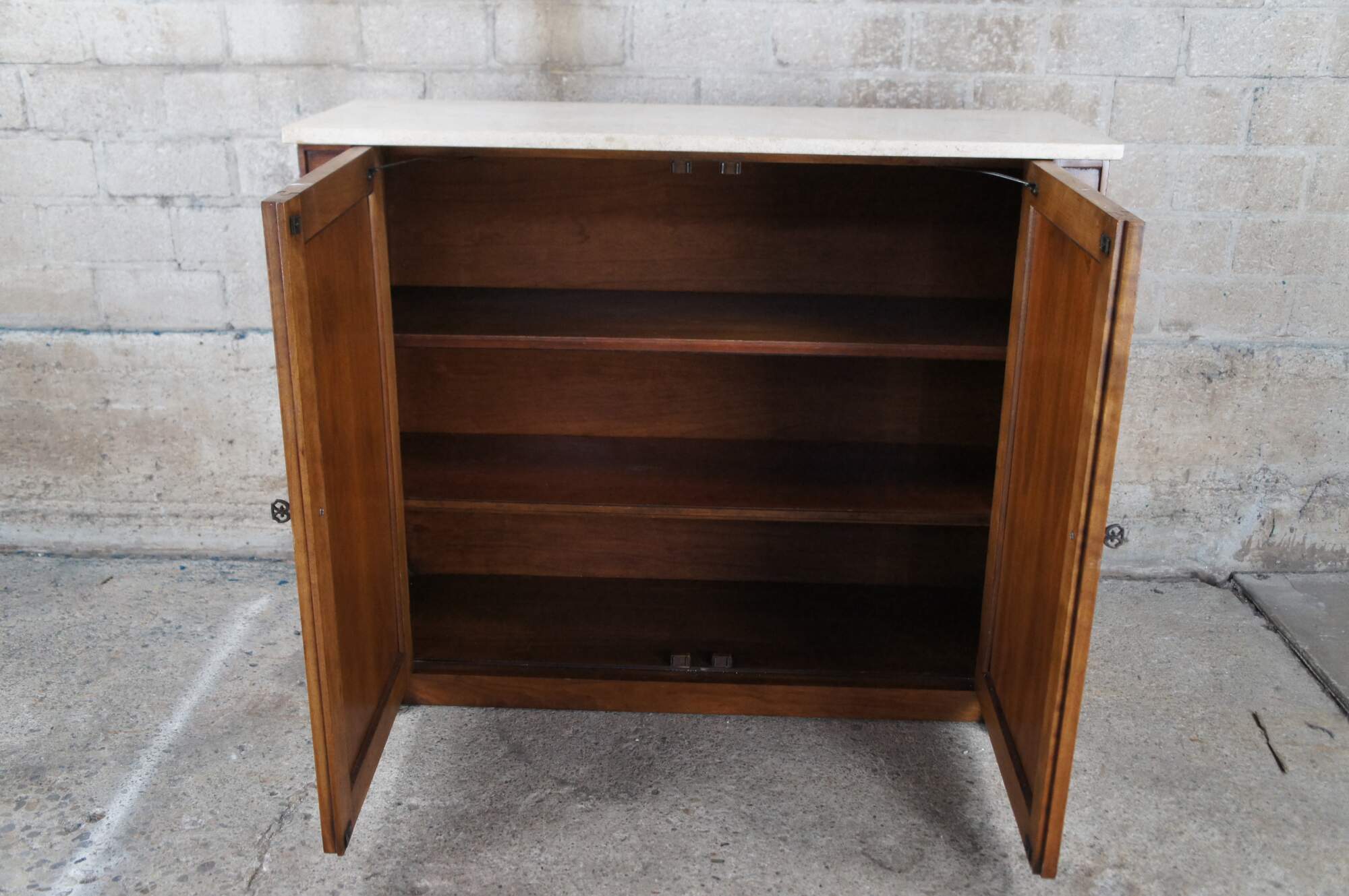 Mid century 1960s Drexel Heritage Palazzo collection Regency style bar cabinet / buffet / console / server / sideboard / credenza / book case / entry table. Made of walnut featuring rectangular form with formica top and painted doors that open to three storage shelves. 587-440.