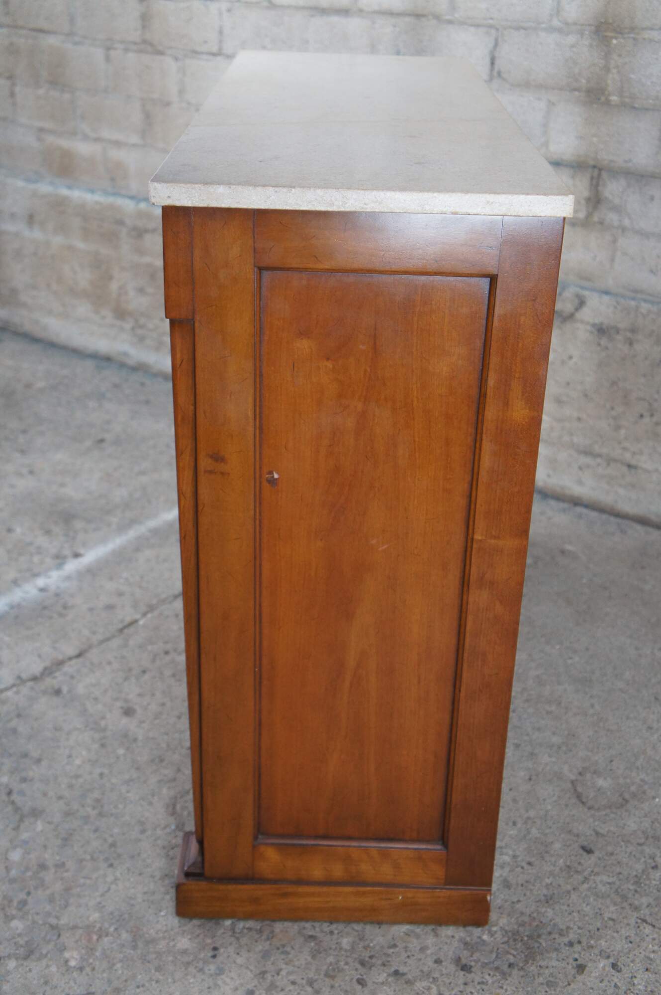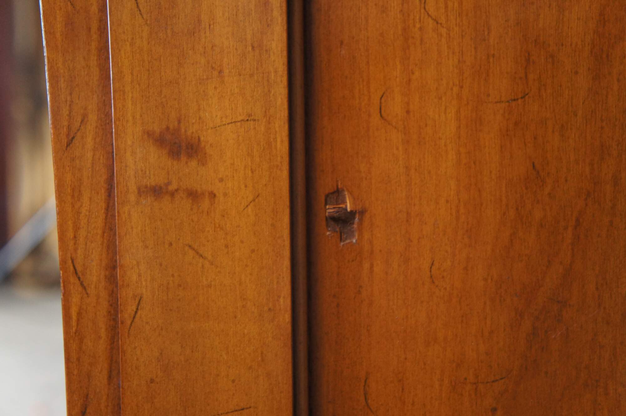 Fair condition, wear and distressing commensurate with age and use, marking / scuffing / fading, wood loss front left base, impact to right side, past repair to top.