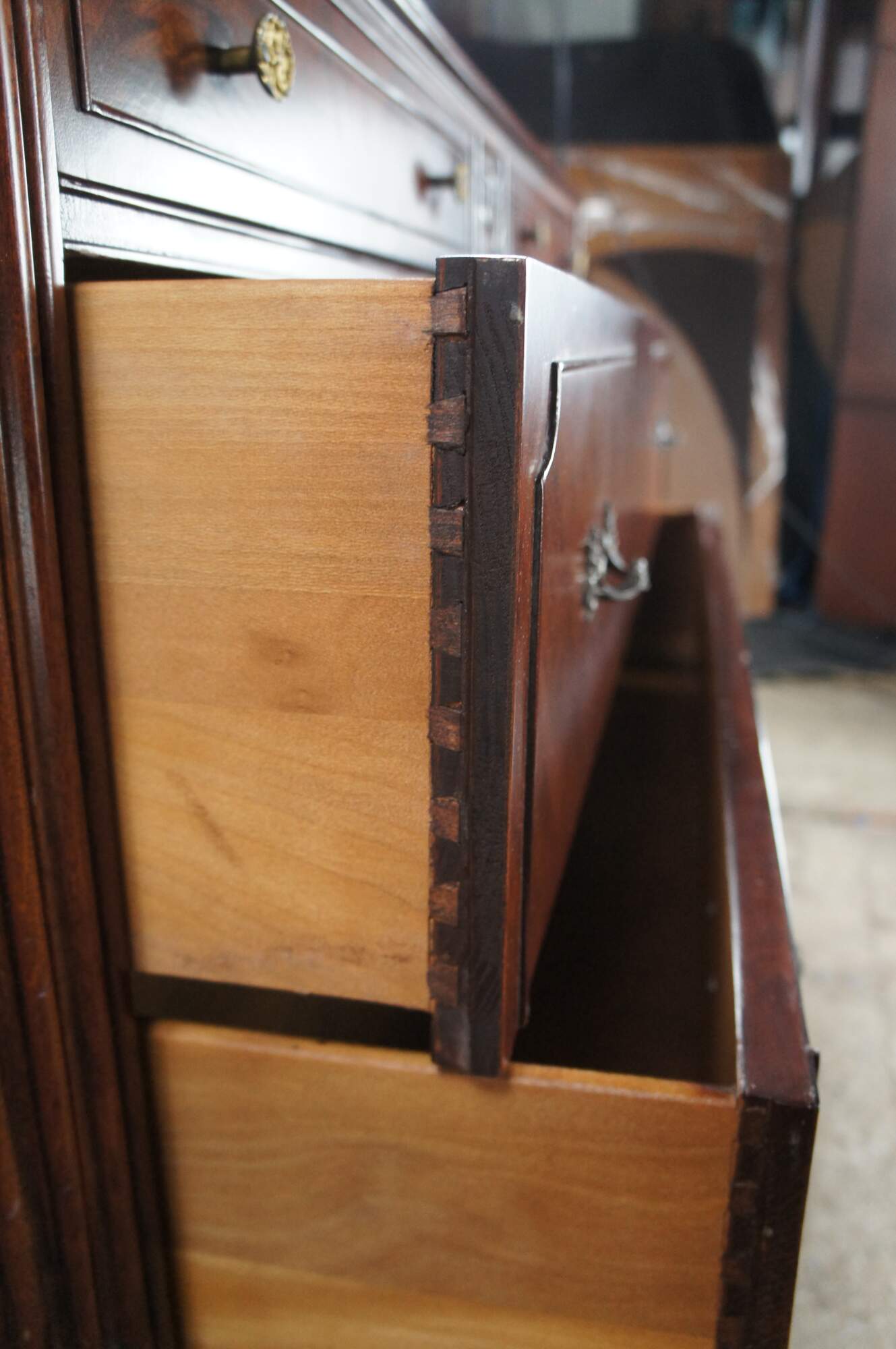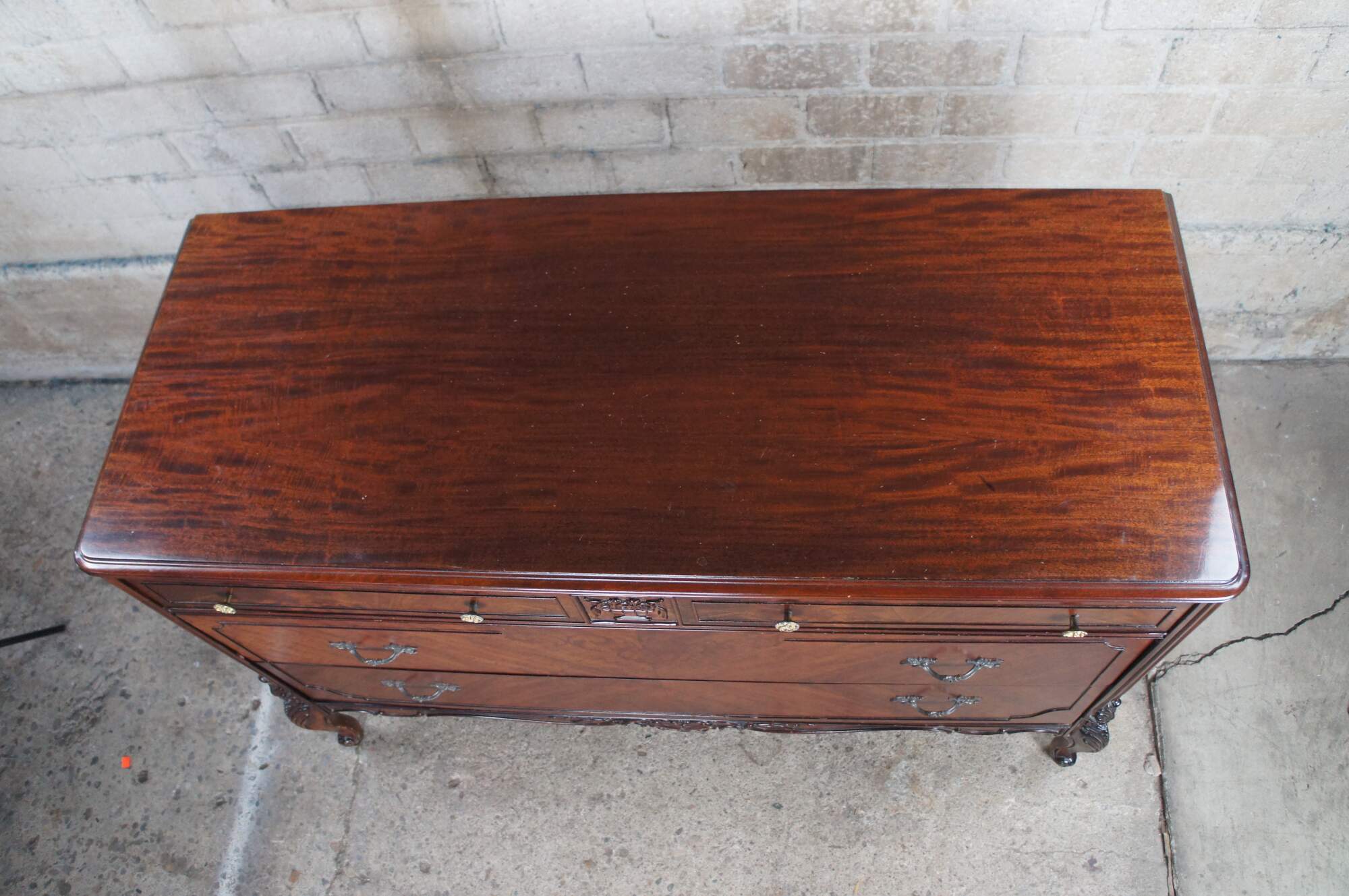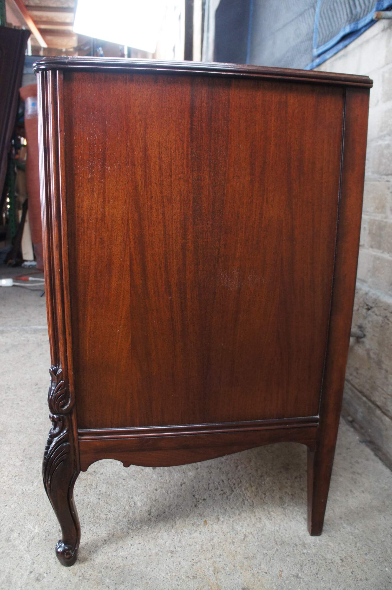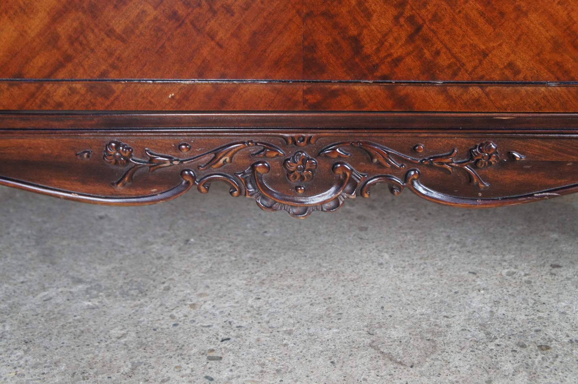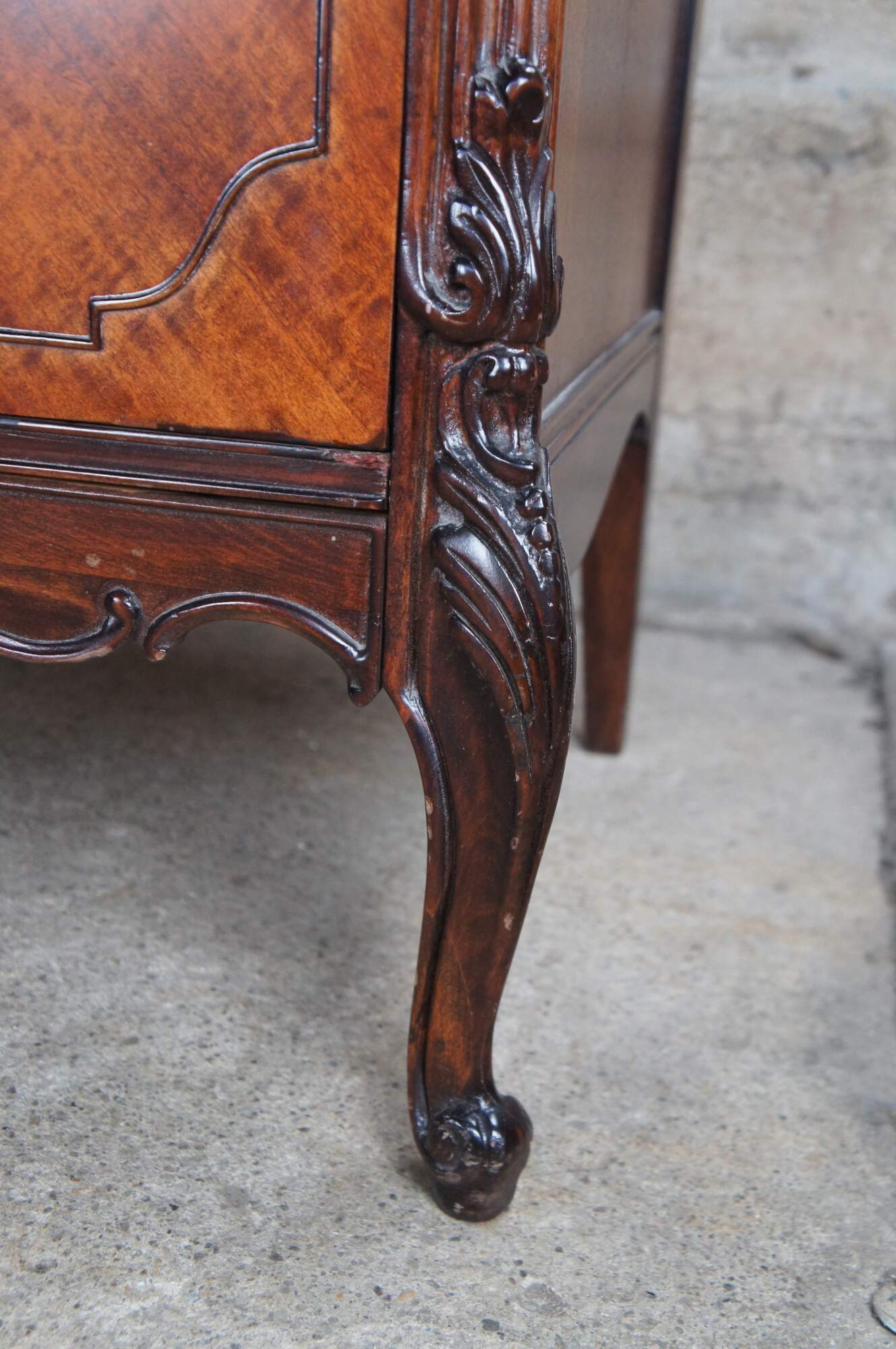 French Provincial Art Deco era Chest of Drawers, circa 1930s. Features a mahogany frame with matchbook burled veneer. The rectangular frame has one large streamline cornucopia carved drawer over two larger lower drawers. The middle drawer showcases marquetry inlay with acanthus scrolled and tulip designs. The outer stiles are reeded with acanthus carved corbel accents over French cabriole legs. Legs flank a serpentine foliate carved apron. Drawer pulls are made of brass.