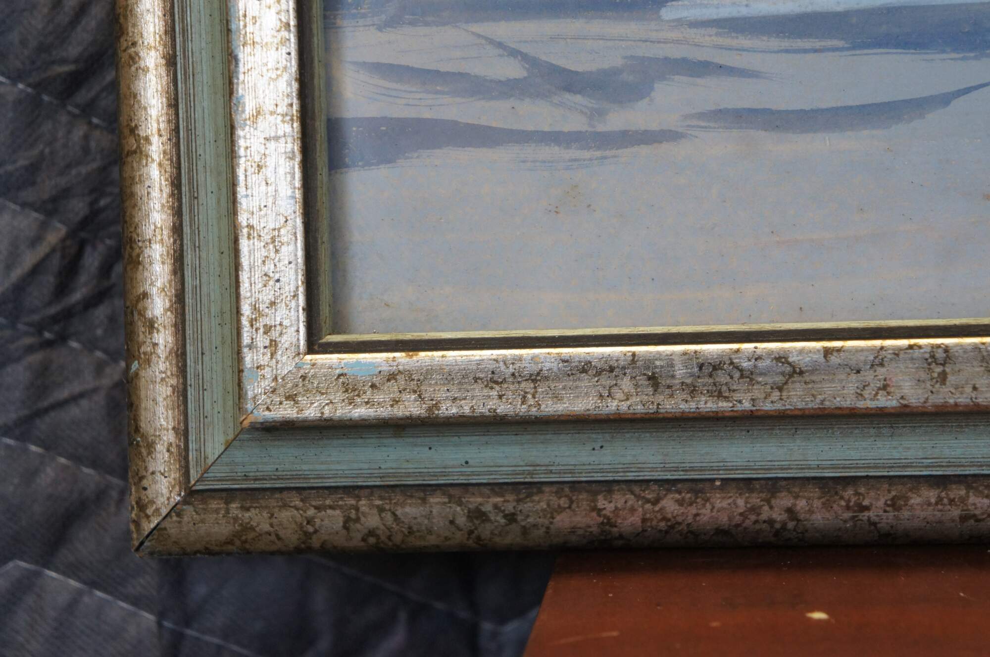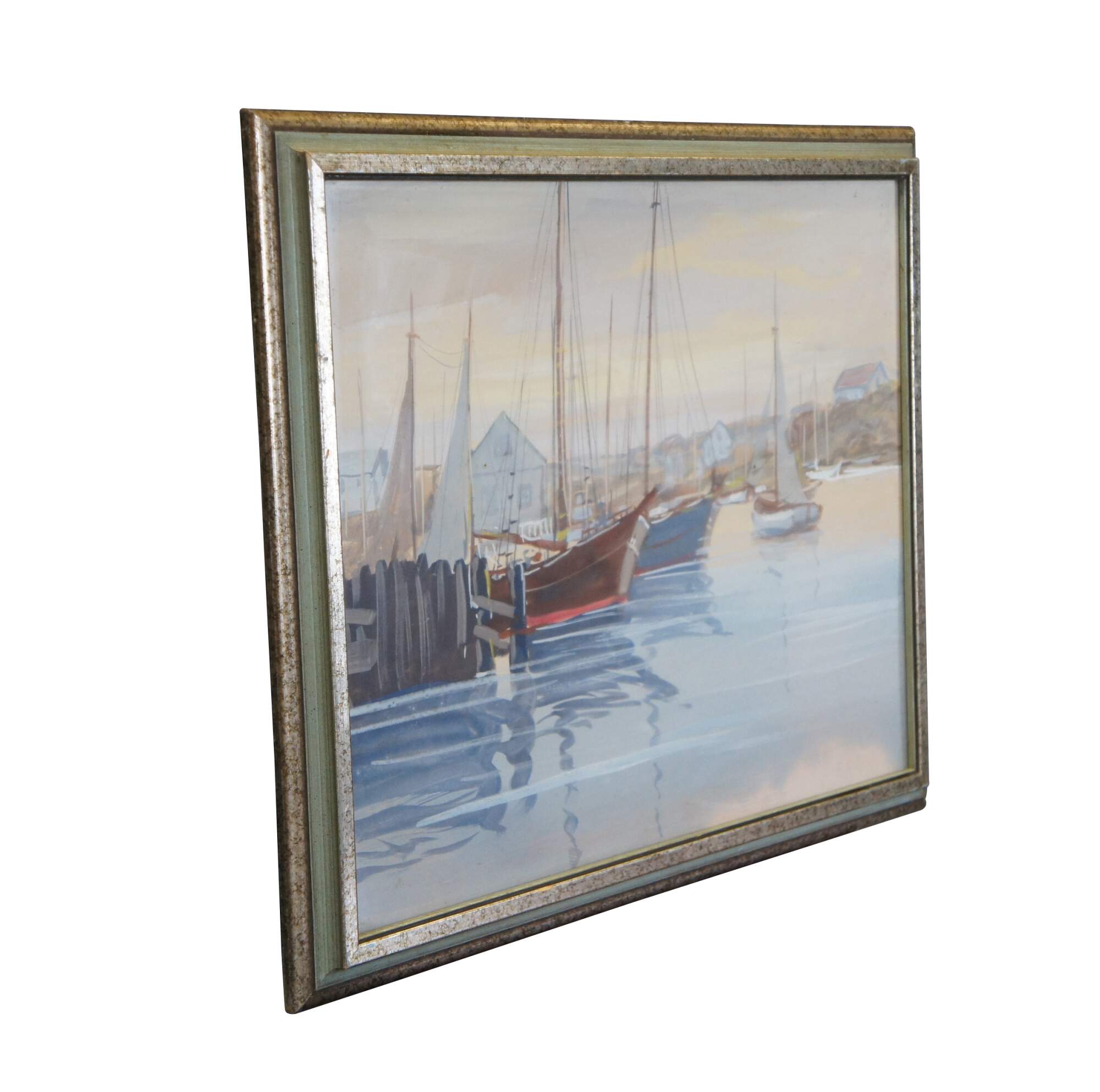 Vintage watercolor on paper nautical painting depicting a marina / harbour filled with boats. Faint signature in lower right corner - possibly F. Evans. Speckled giltwood frame with green painted bevel; no mat. Framed in 1976.