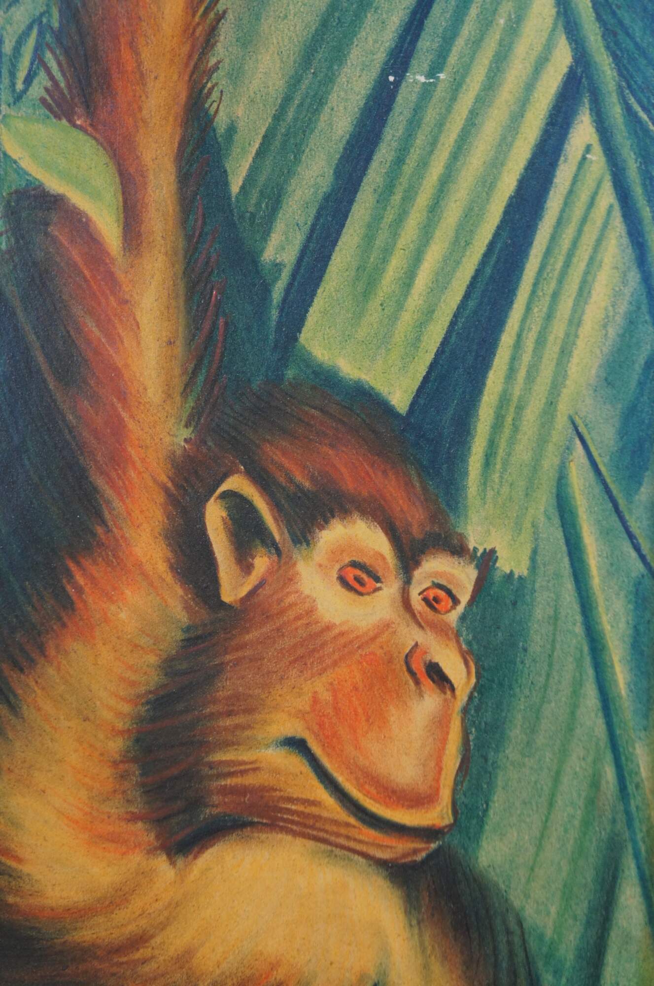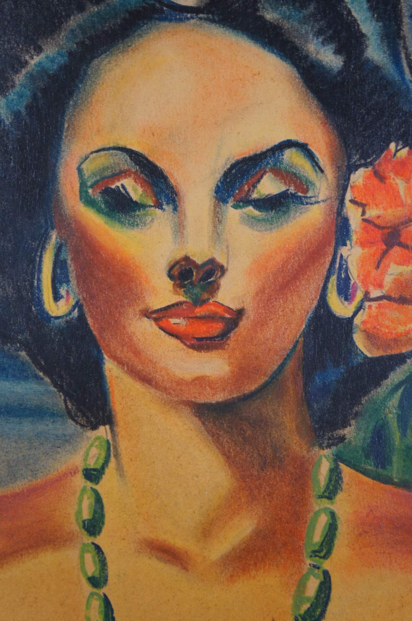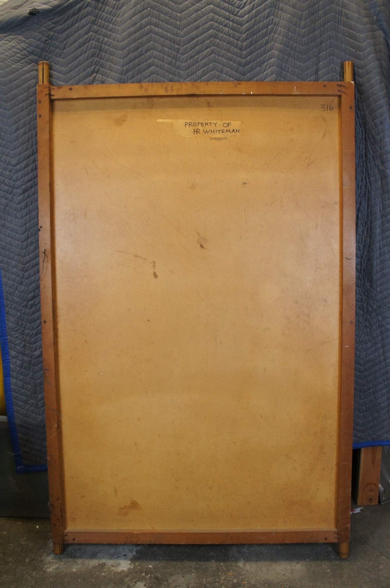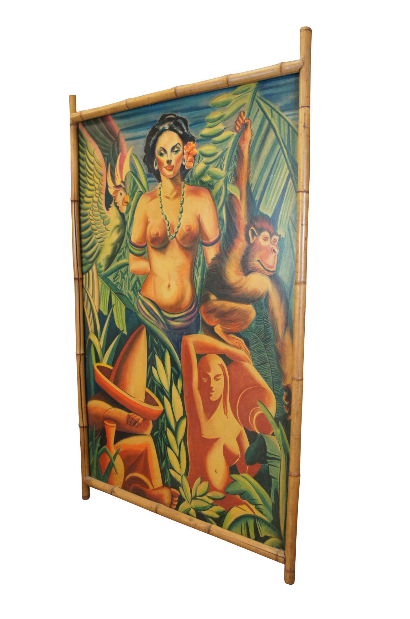 Immense mid 20th century pastel painting on board by Hilbert R. Whiteman, depicting a tropical fantasy scene featuring a topless brunette woman surrounded by terracotta sculptures, lush foliage, a parrot, and monkey. Signed in lower right corner. Bamboo pole frame. Marked/stamped "Property of HR Whiteman - HR Whiteman Art Studio" on reverse.