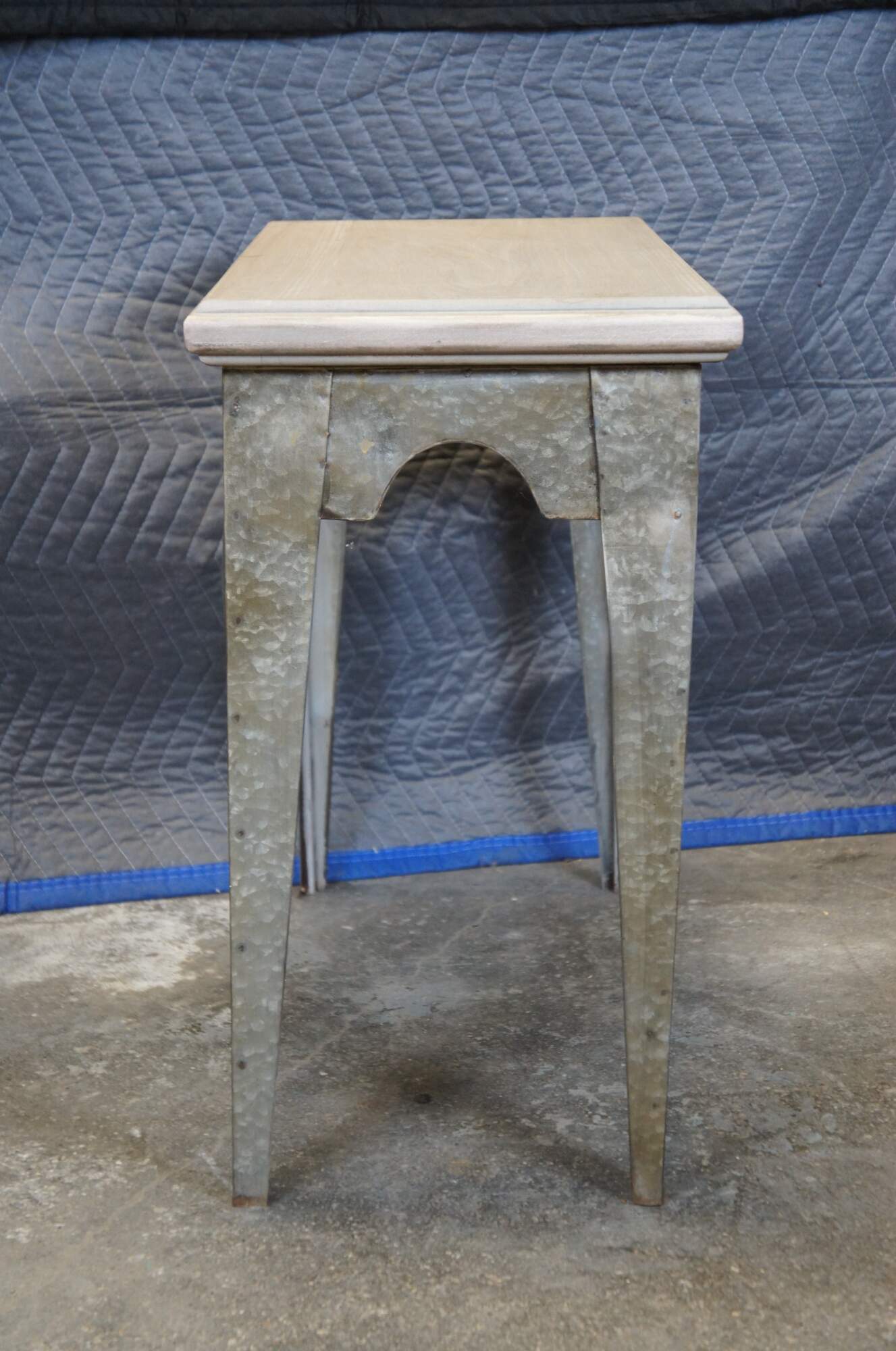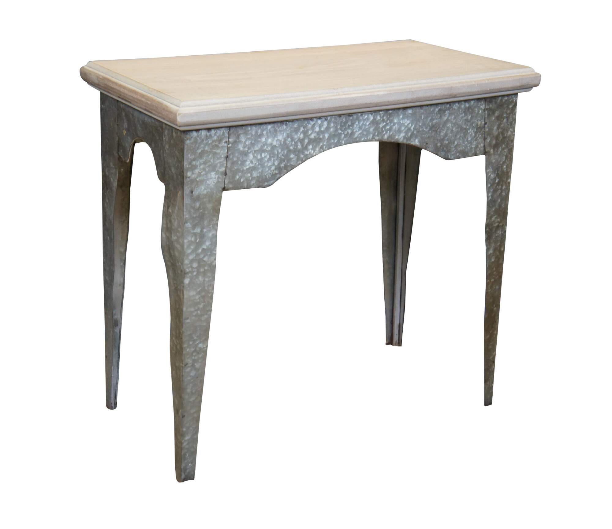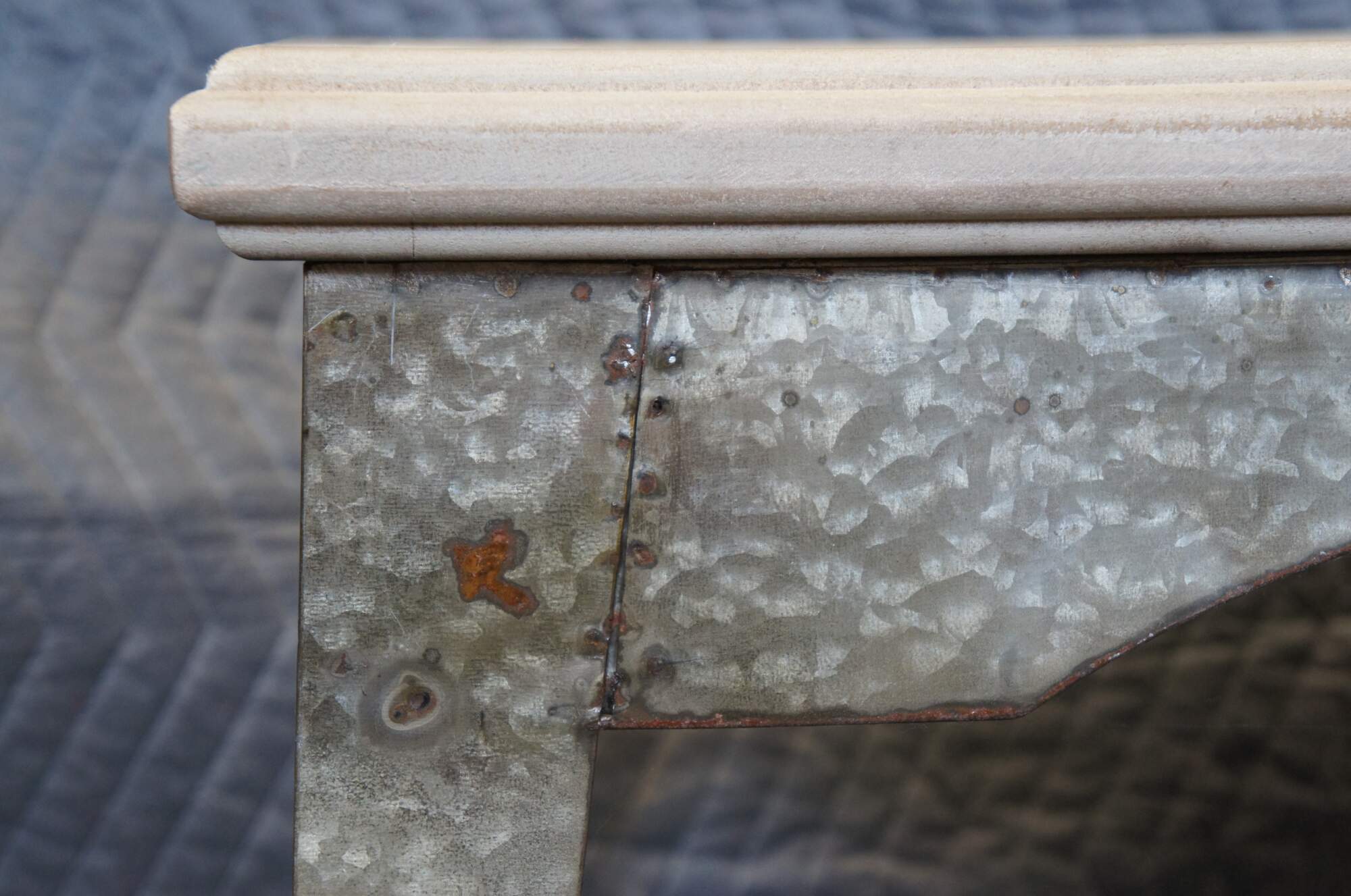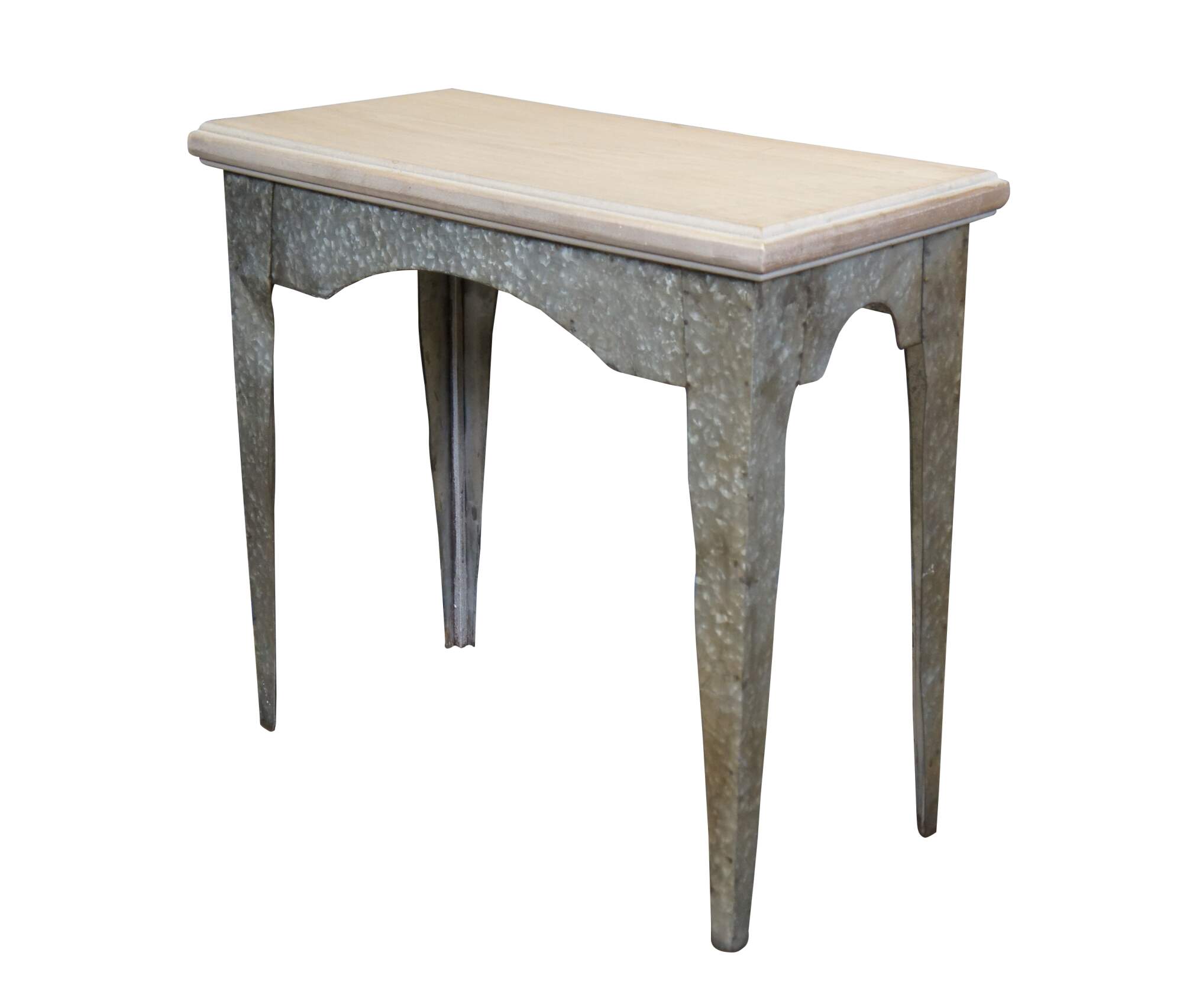 Late 20th century petite sized console / accent table featuring a light galvanized metal base with a pale washed wooden top. Item No: 19220-L. Distrubuted by A&H Imports Inc. Made in China.