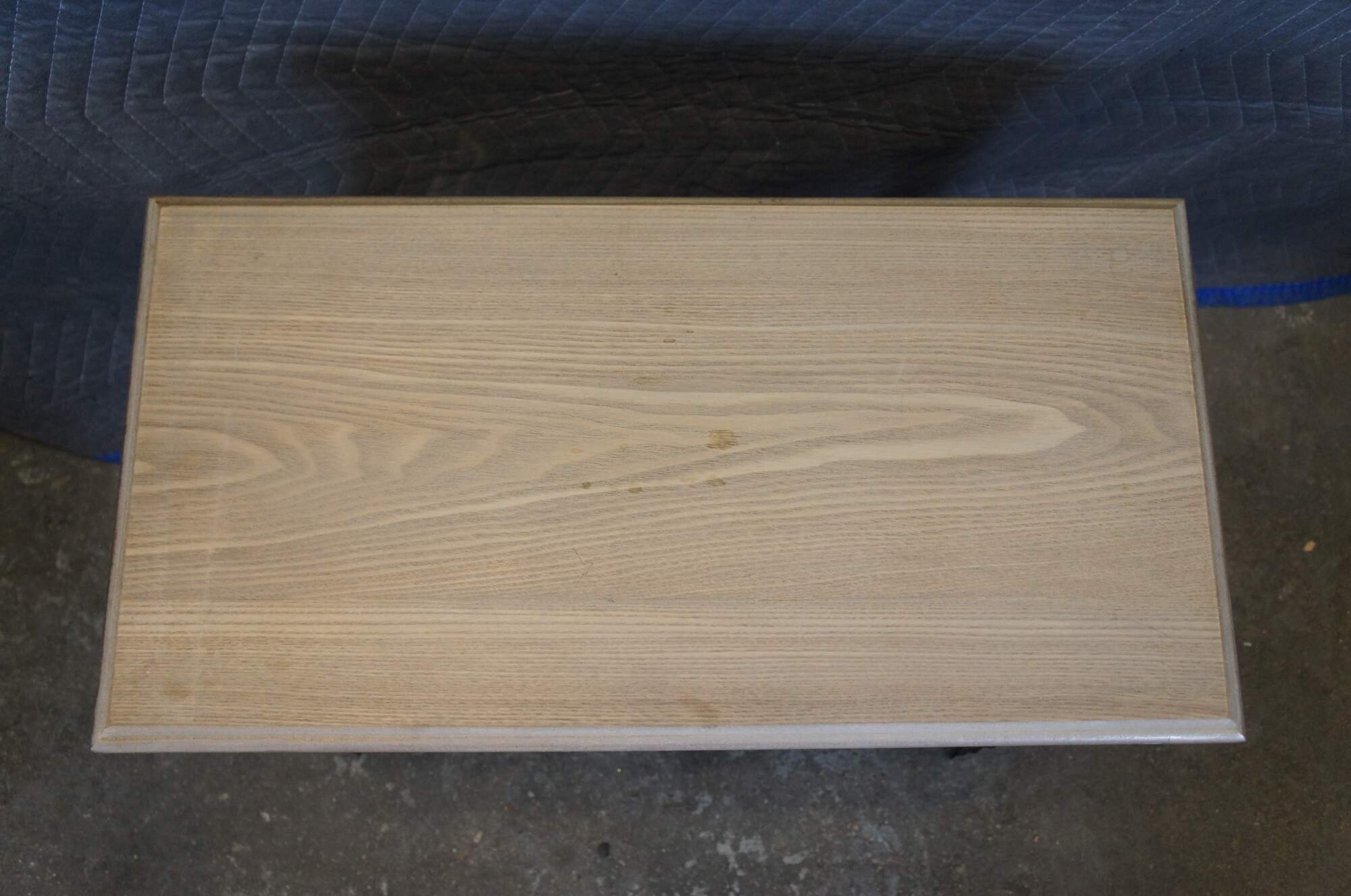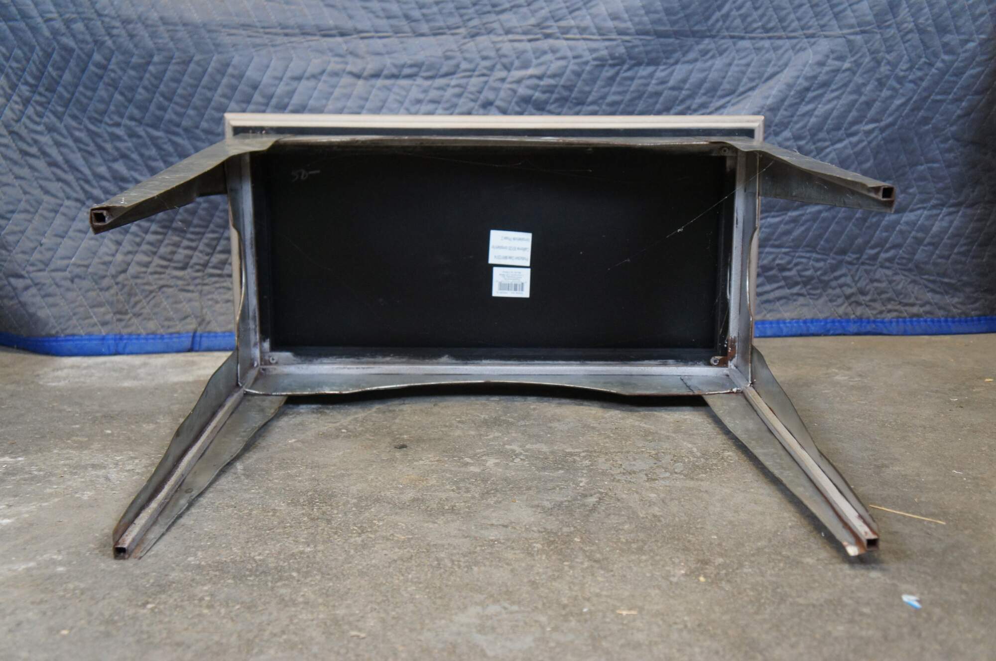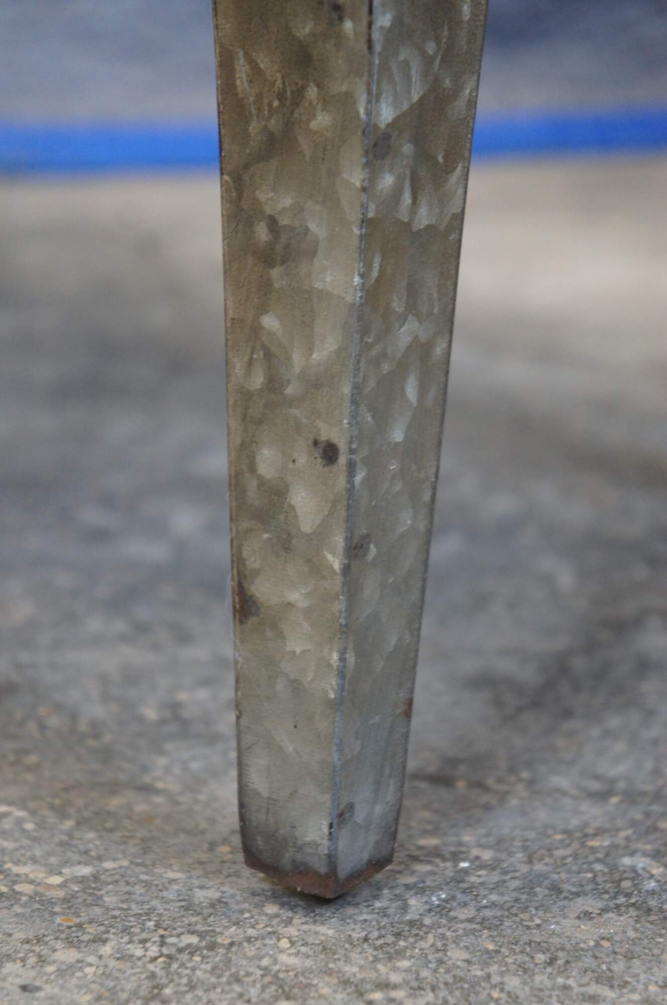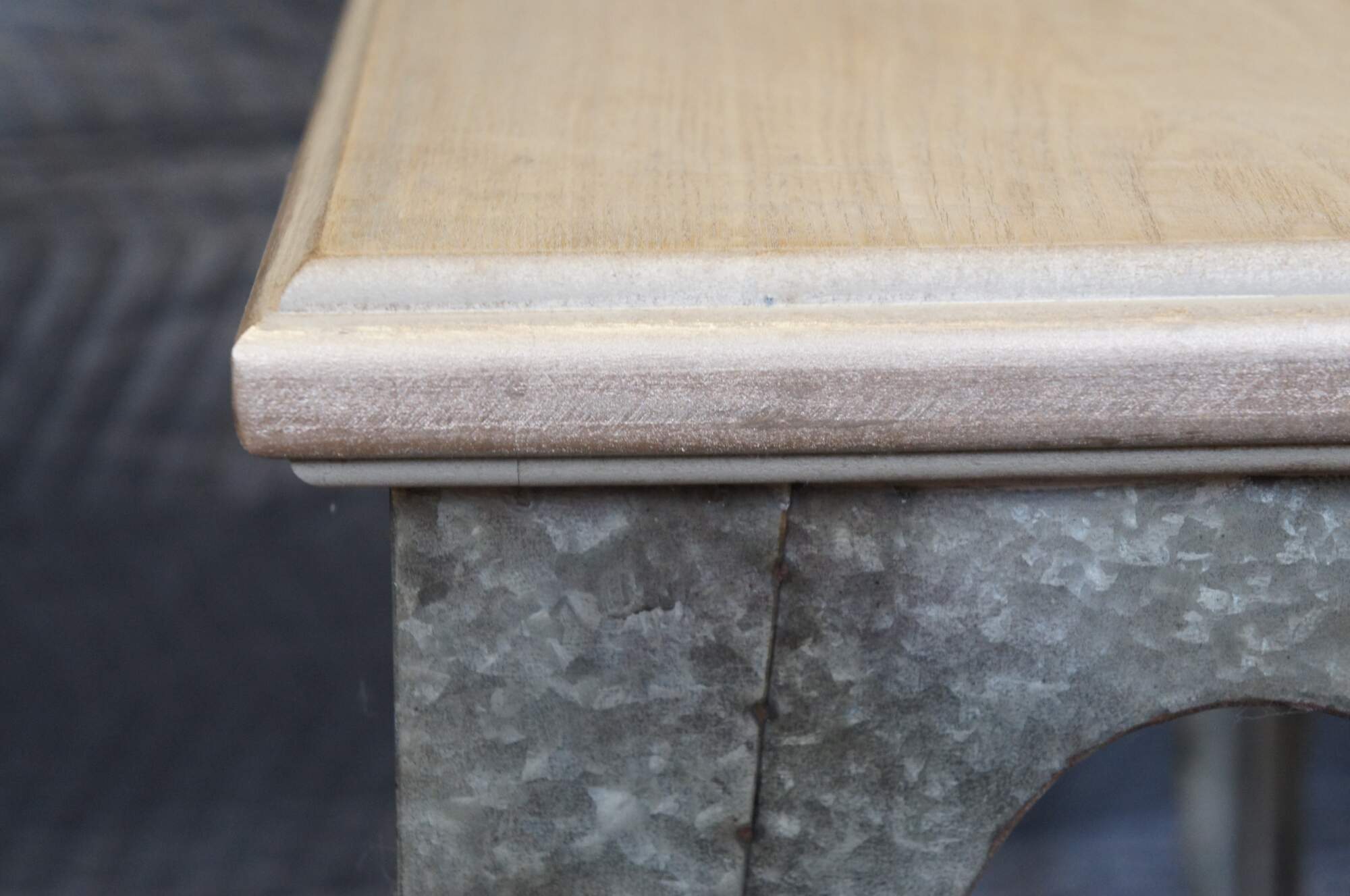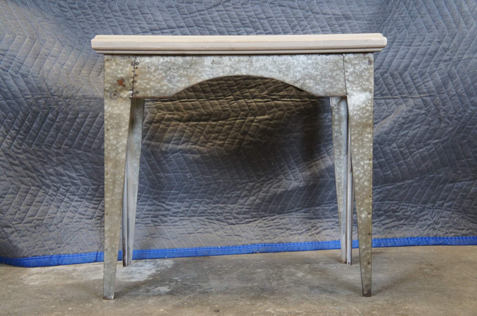 Late 20th century petite sized console / accent table featuring a light galvanized metal base with a pale washed wooden top. Item No: 19220-L. Distrubuted by A&H Imports Inc. Made in China.