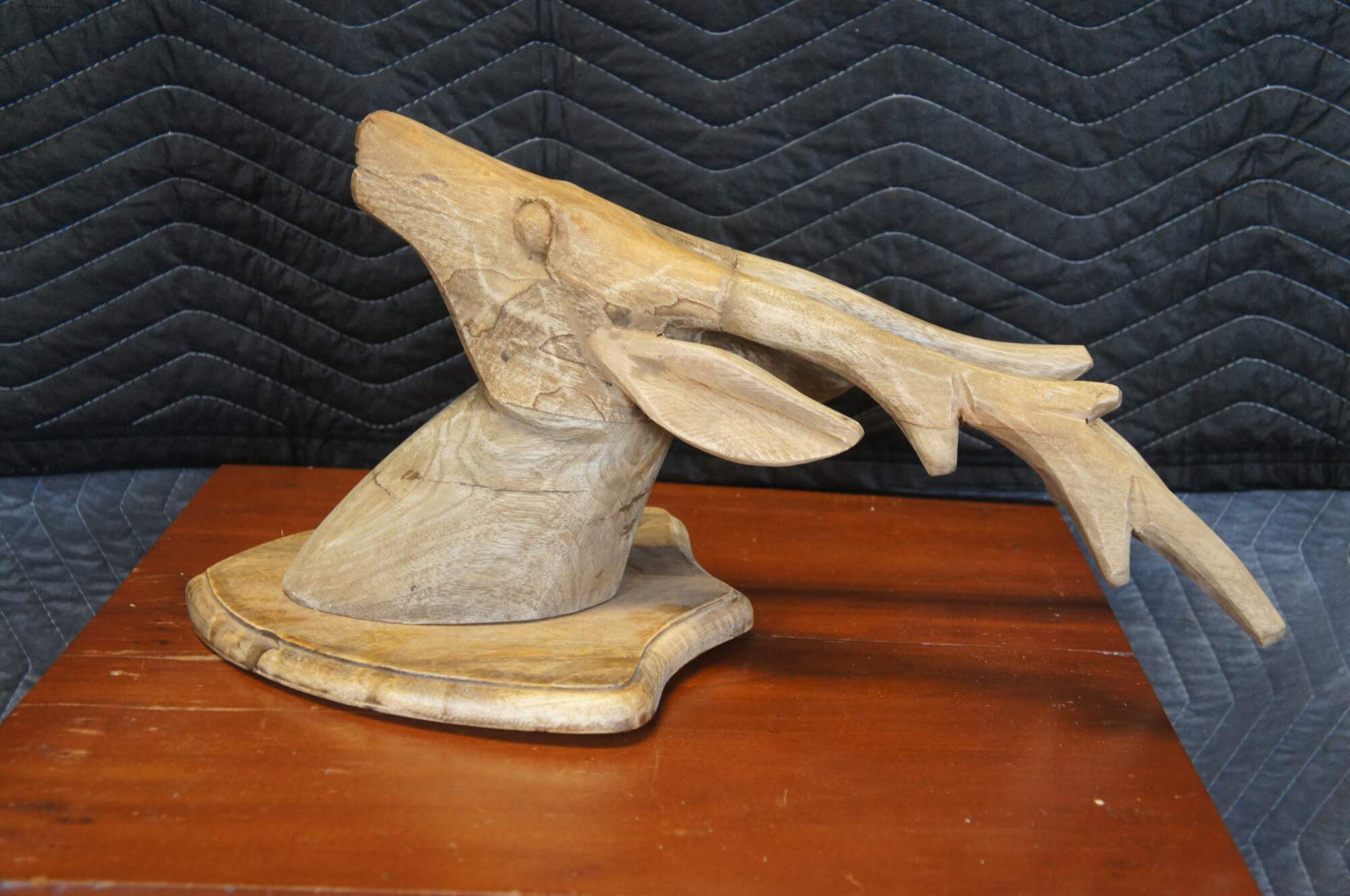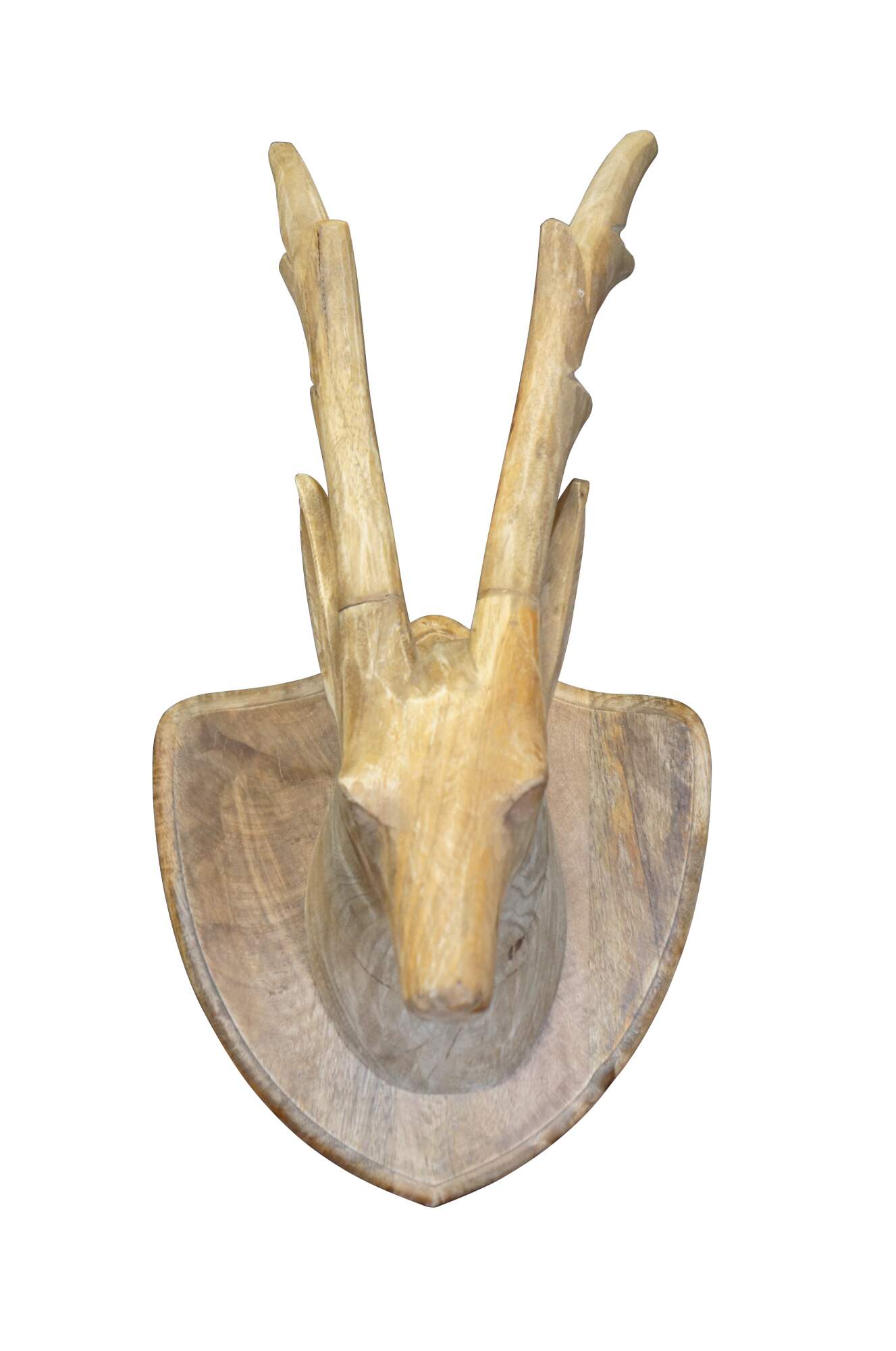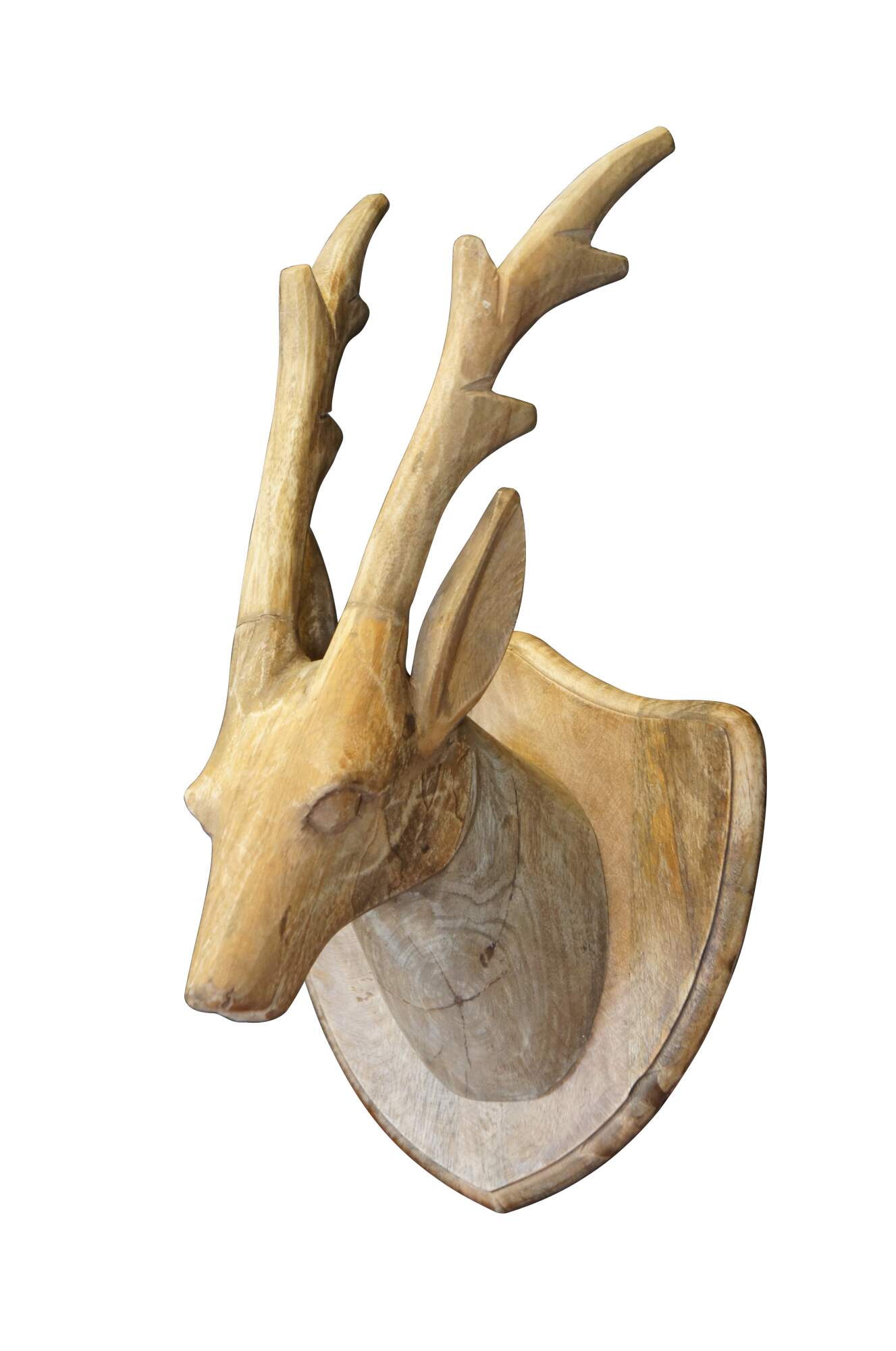 Late 20th century plain hardwood carved country / farmhouse / rustic deer / antleop head with slender four point antlers, set on a shield shaped wall hanging plaque.