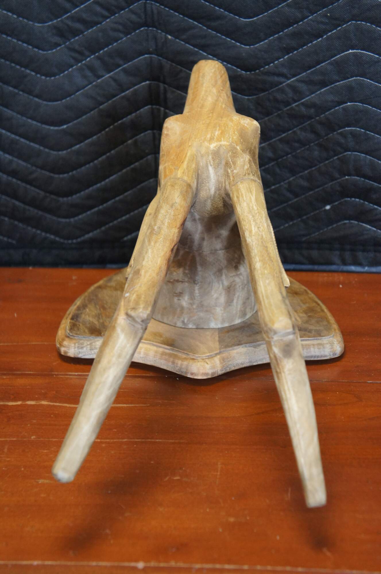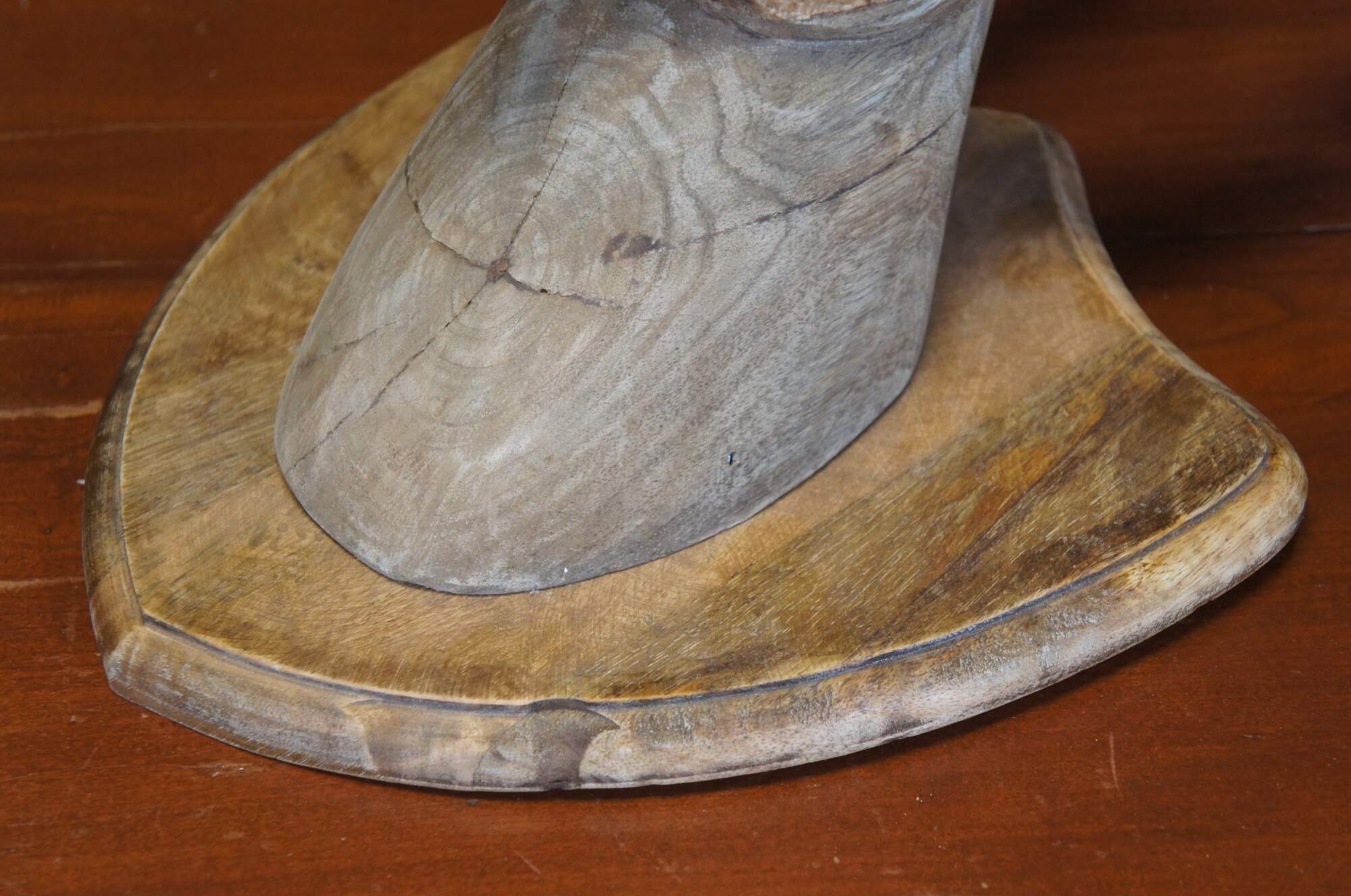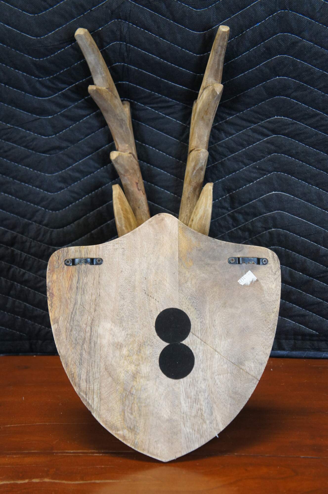 Late 20th century plain hardwood carved country / farmhouse / rustic deer / antleop head with slender four point antlers, set on a shield shaped wall hanging plaque.