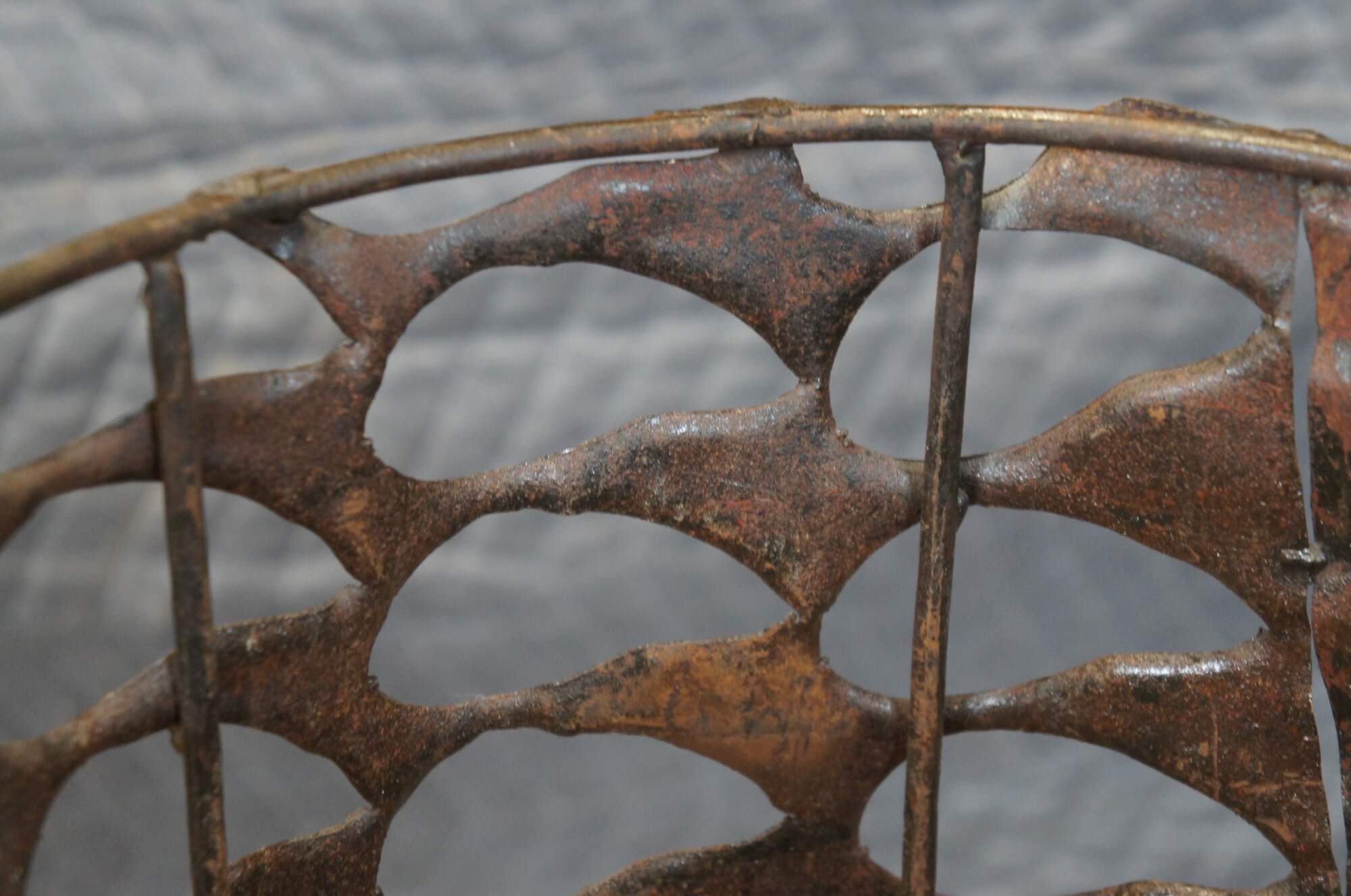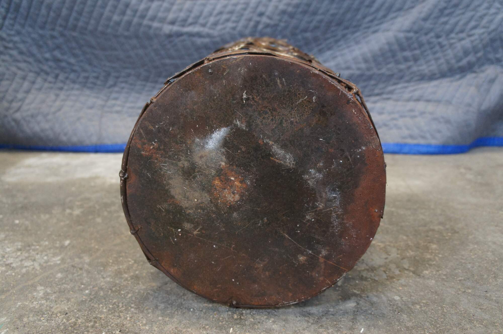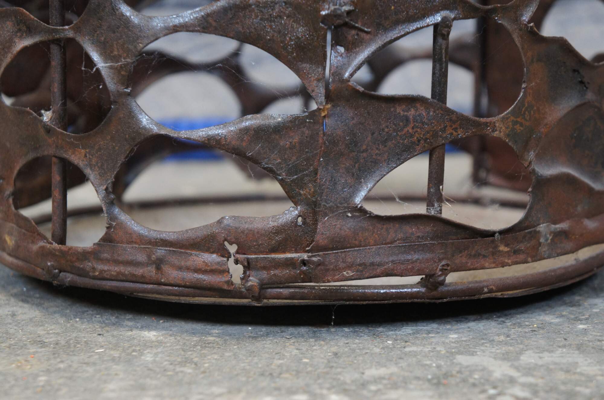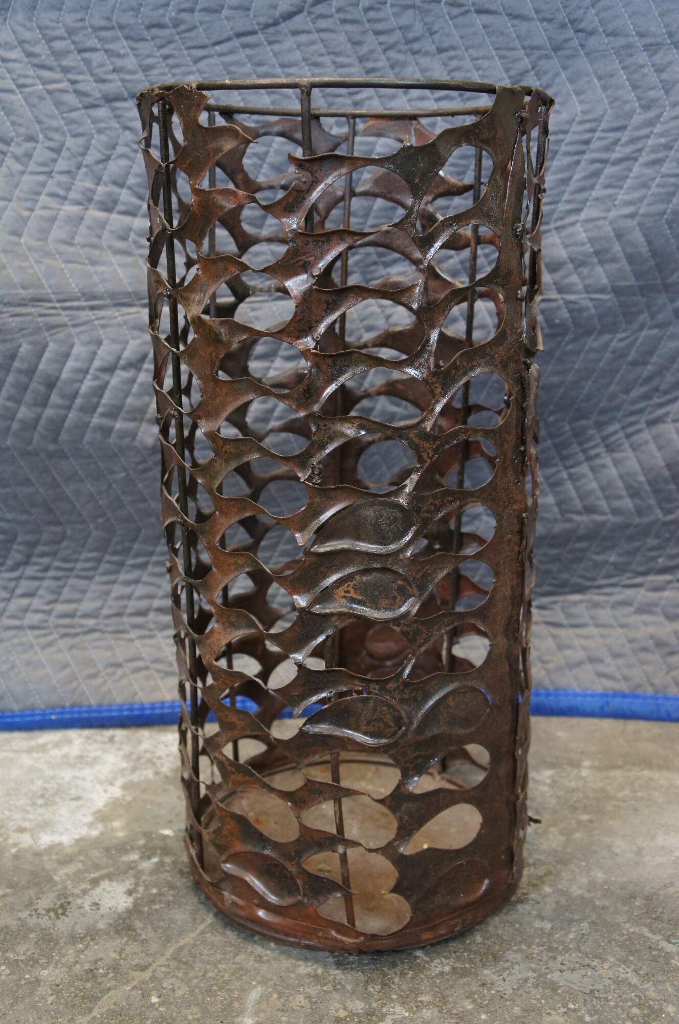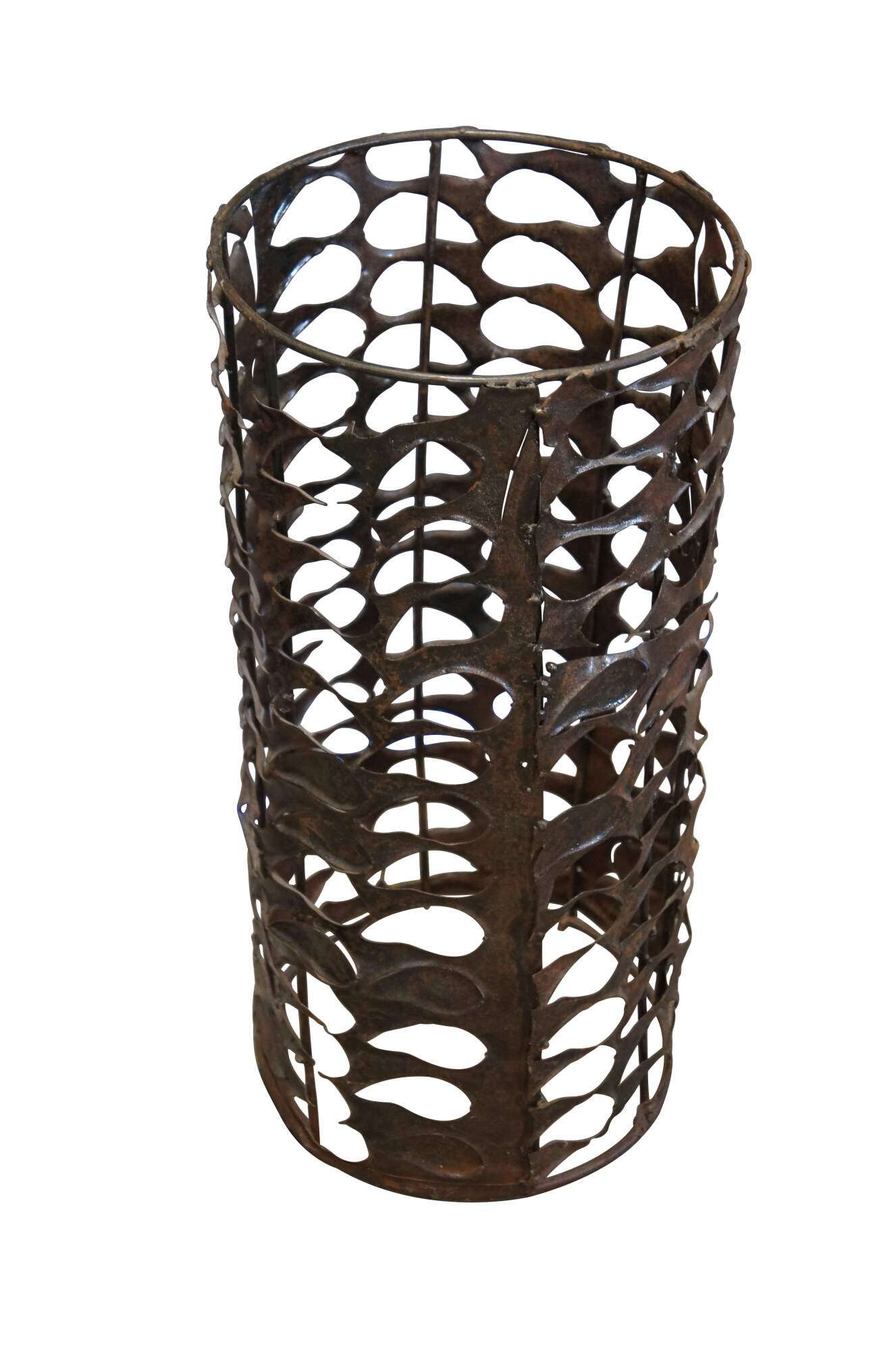 Late 20th century sculptural / brutalist apple sorting style vessel, cylindrical in form made of artistically rusted iron pierced with rows of leaf shapes around a solid base. Could be used as a floor vase to display dried / artificial flower arrangements / foliage or as an umbrella / cane stand / trash can.