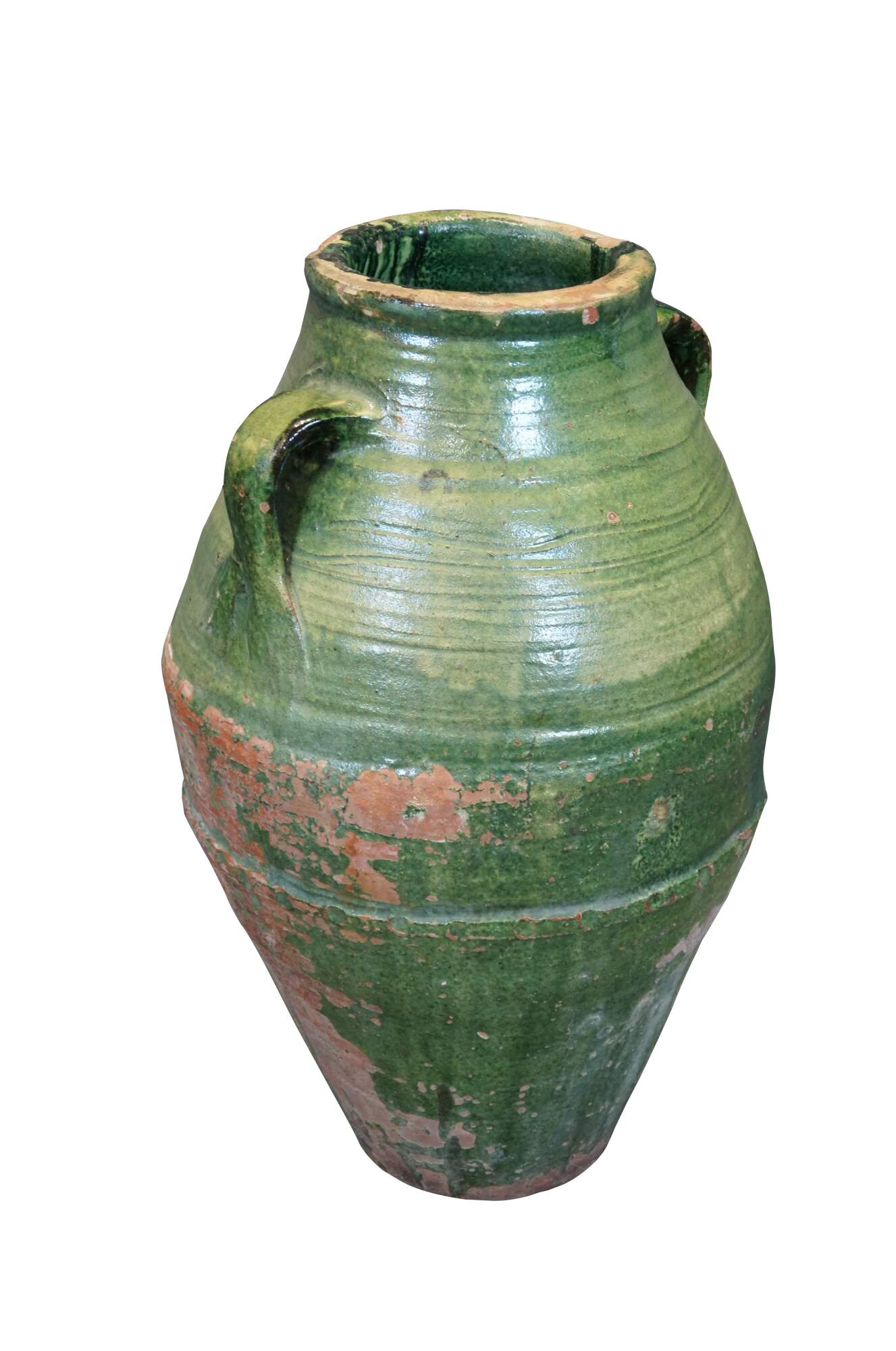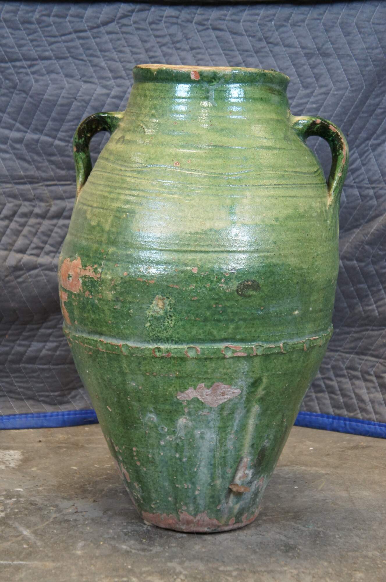 Antique French terra cotta olive jar / floor vase - almond shaped form with wide middle and tapered top / base, two handles, decorative spotted / thumbprint band around middle, finished in a green glaze.