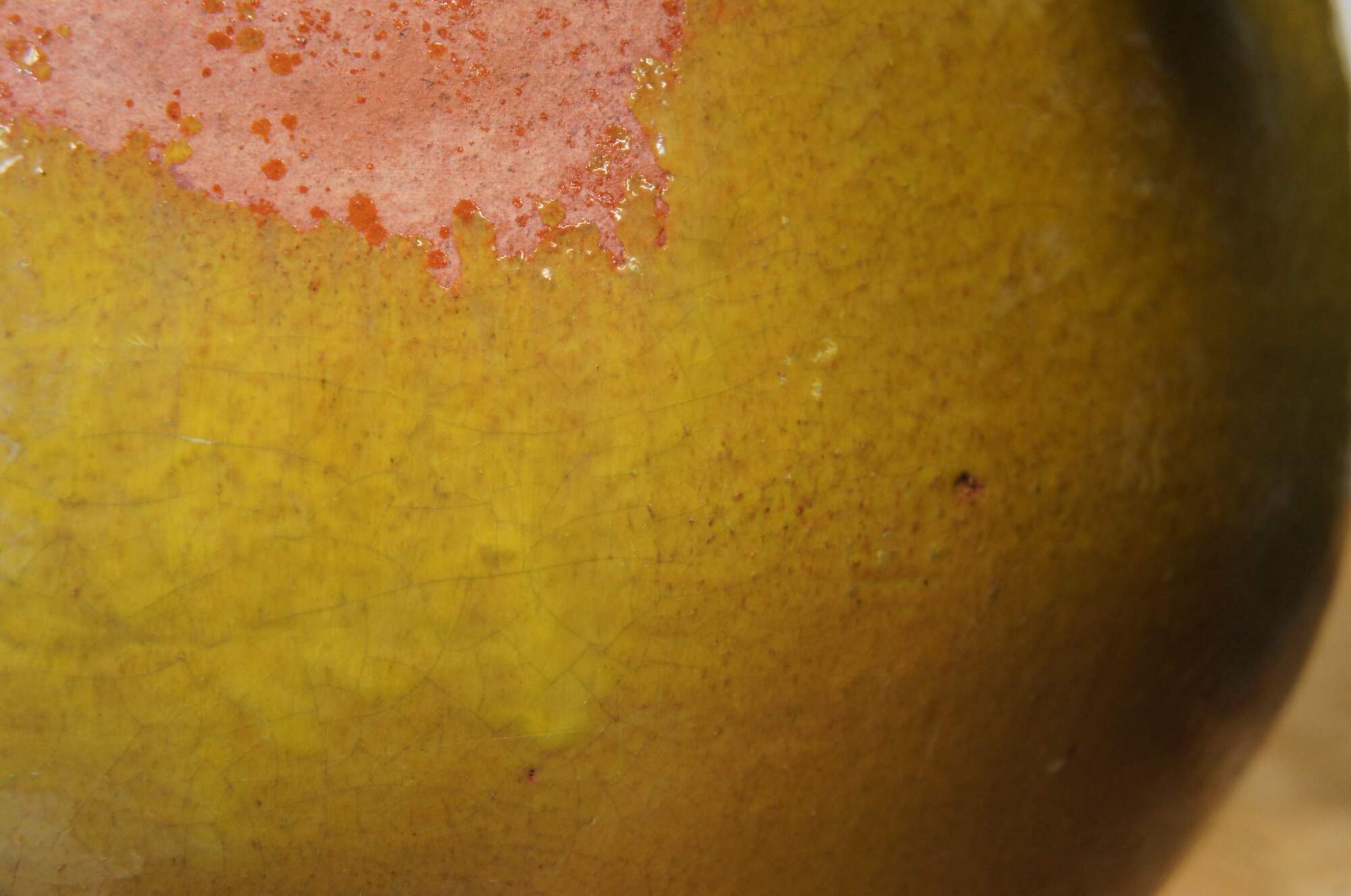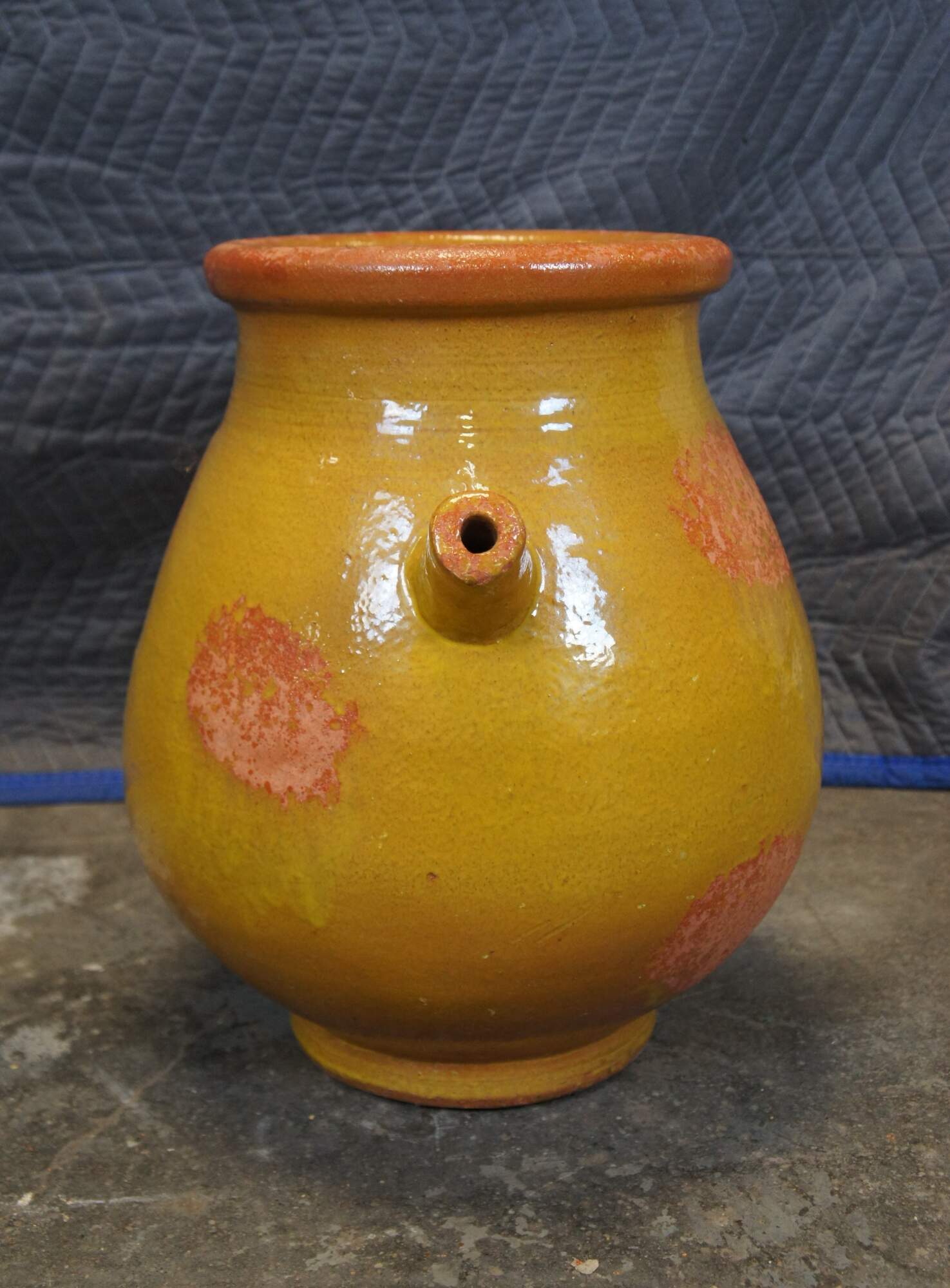 Antique French handcrafted terra cotta olive oil jar / water jug featuring a round shape with footed base, molded rim, large handle, narrow spout, finished in a yellow glaze with orange accents.