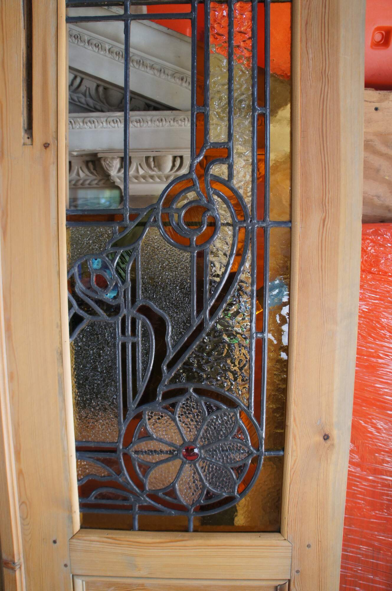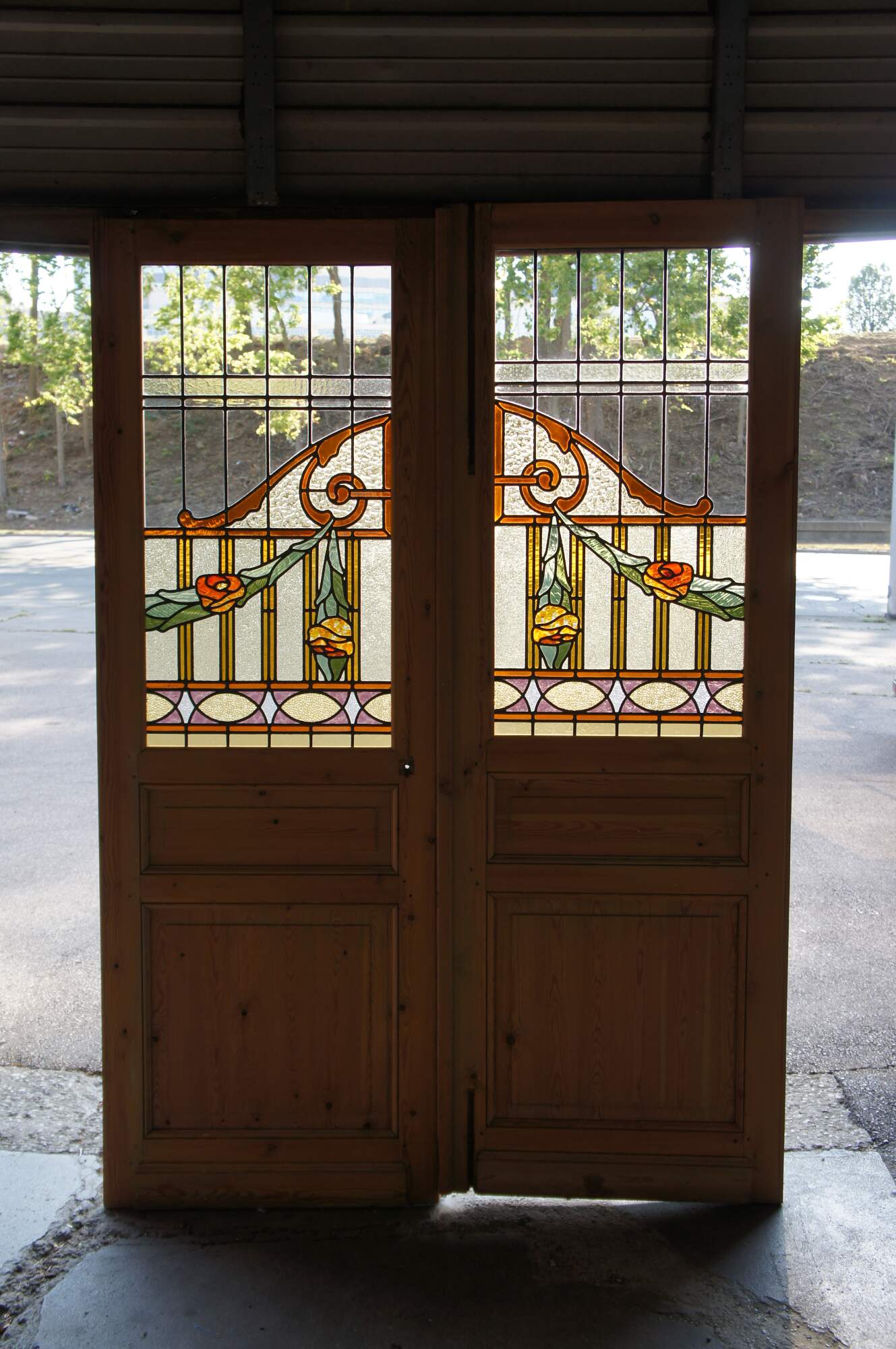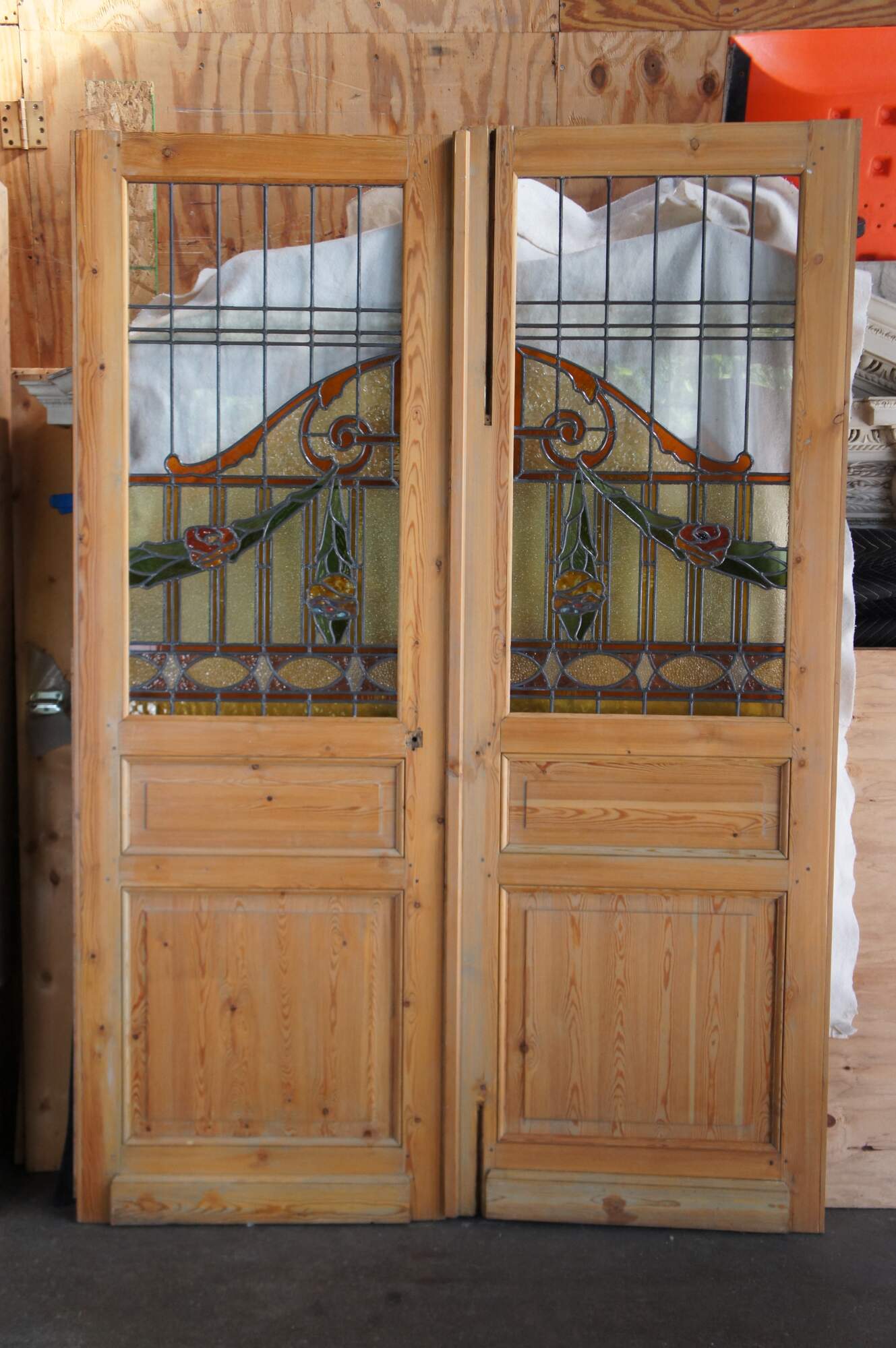 A rare and impressive set of antique half glazed architectural salvaged French double doors and sidelites. Features a solid pine frame with arched, scrolled and neoclassical ribboned stained and leaded glass. Includes pebbled, textured and clear glass with colors of amber (root beer), green and fuchsia. This set would make for a remarkable entryway, library or study.