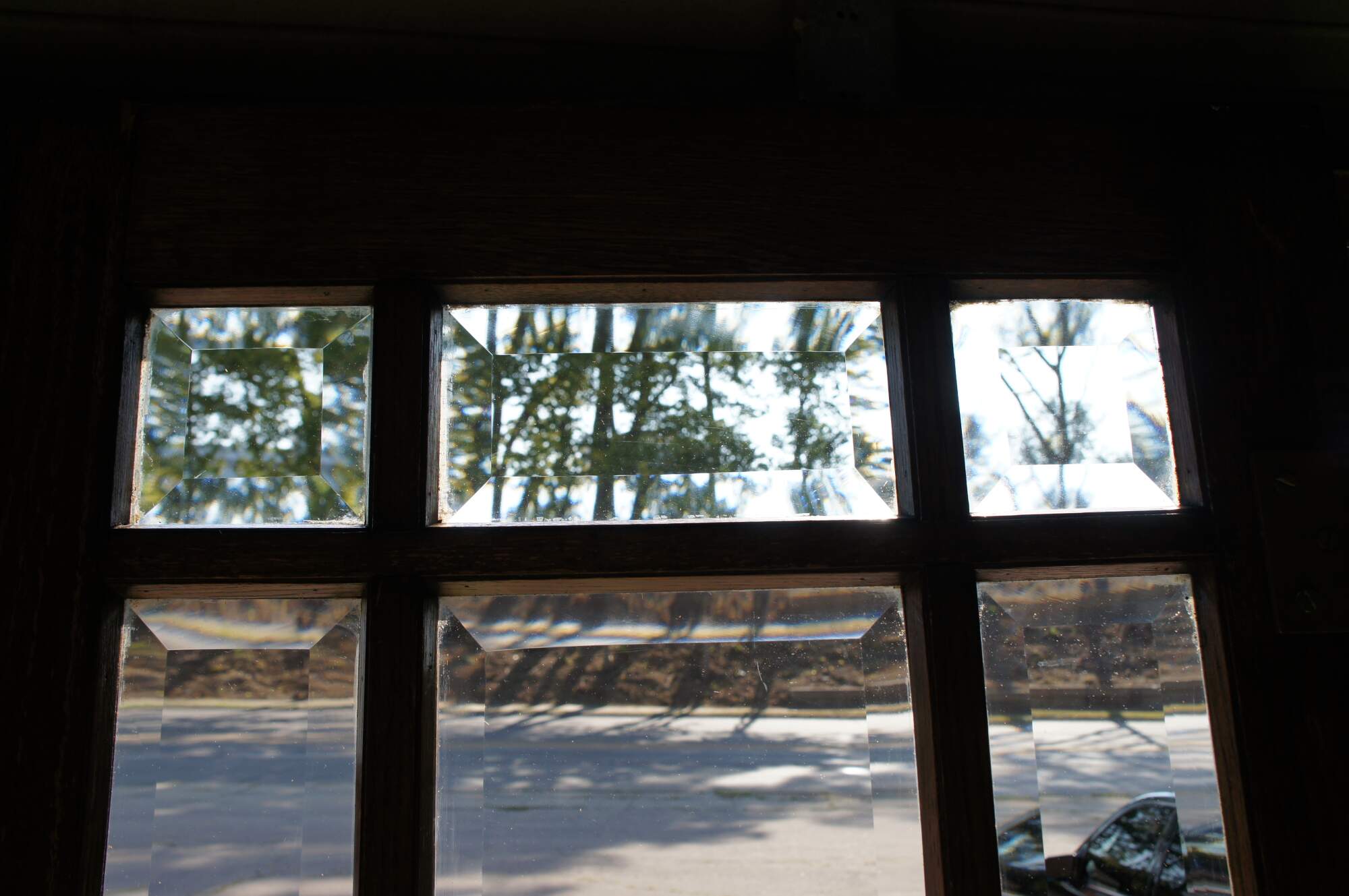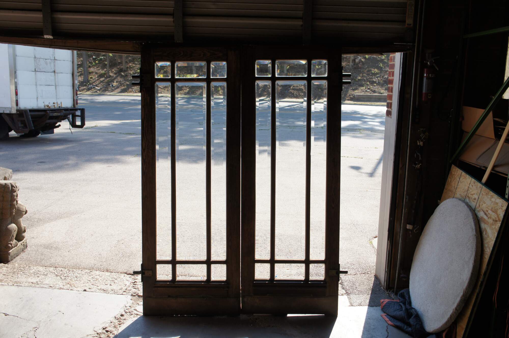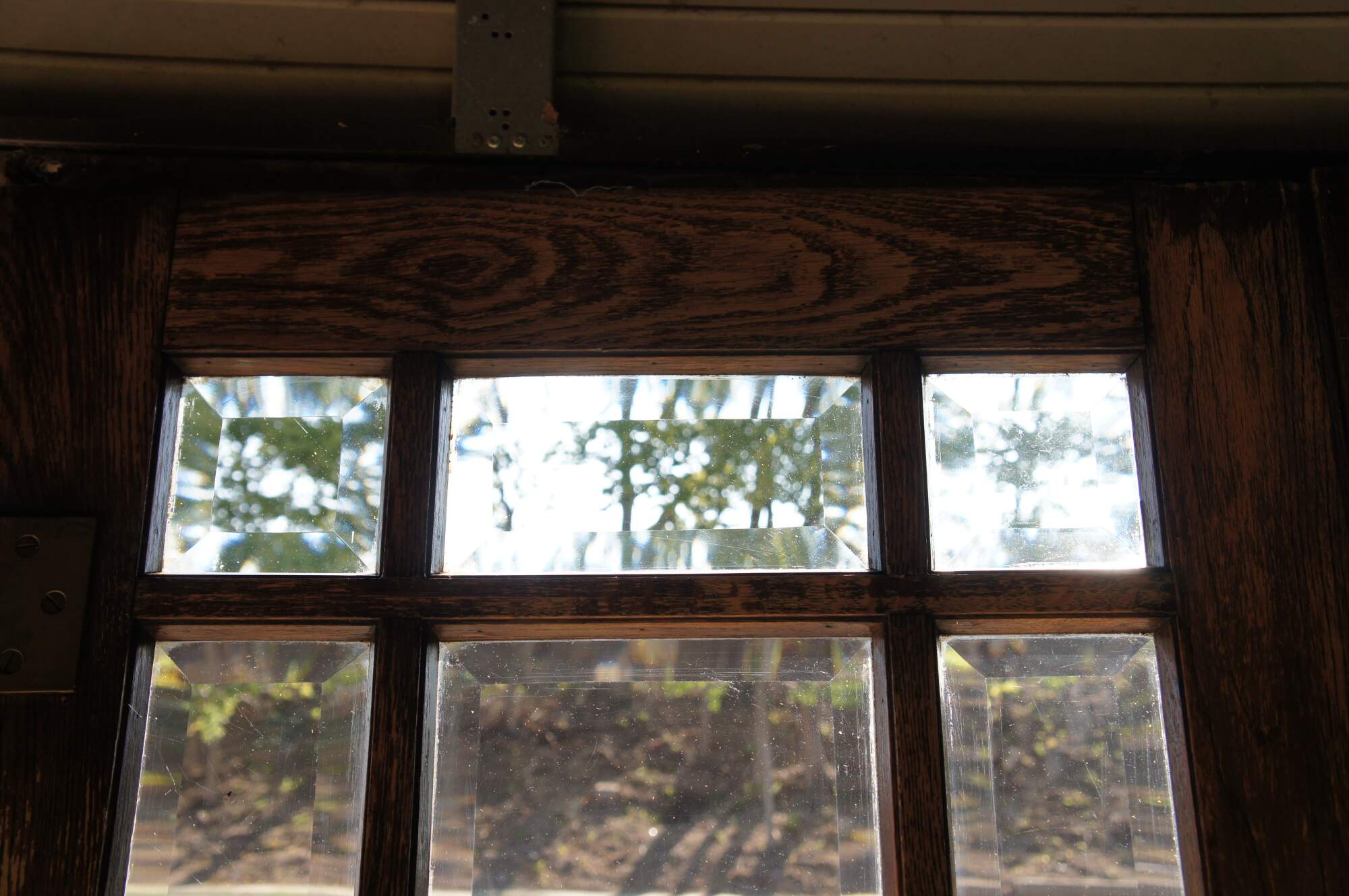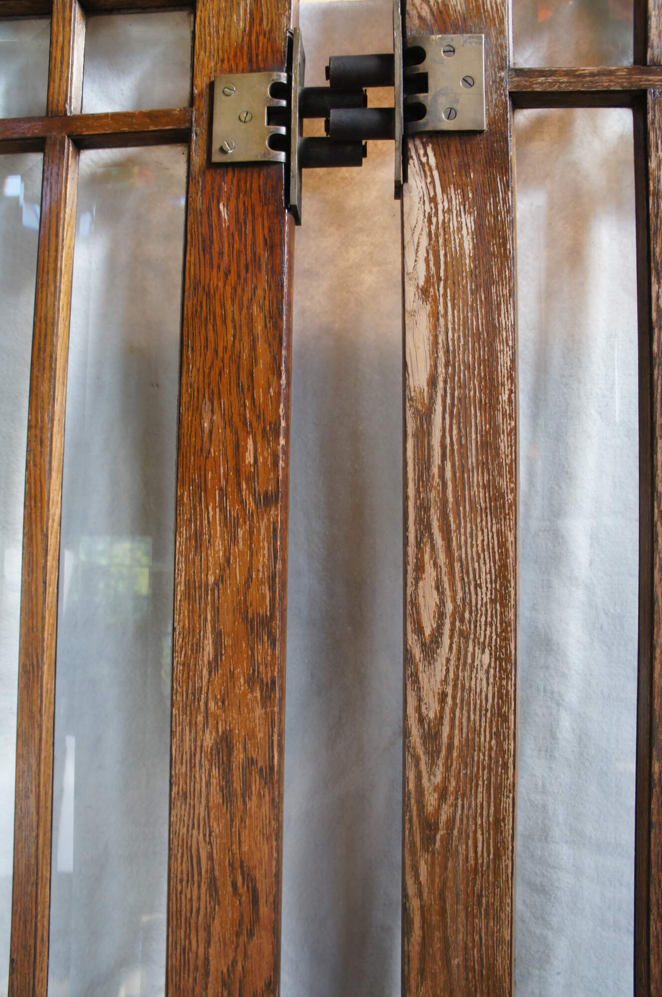 Pair of Mid Century French Saloon Swinging / Pivot Double Doors. Feature an oak frame with Prairie style lattice shaped center and beveled glass panels. The door is accented with brass mounted kickplates and Hawgood Systems Spring Hinges.