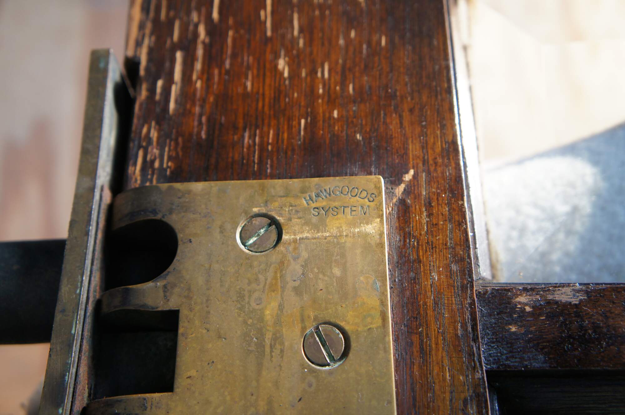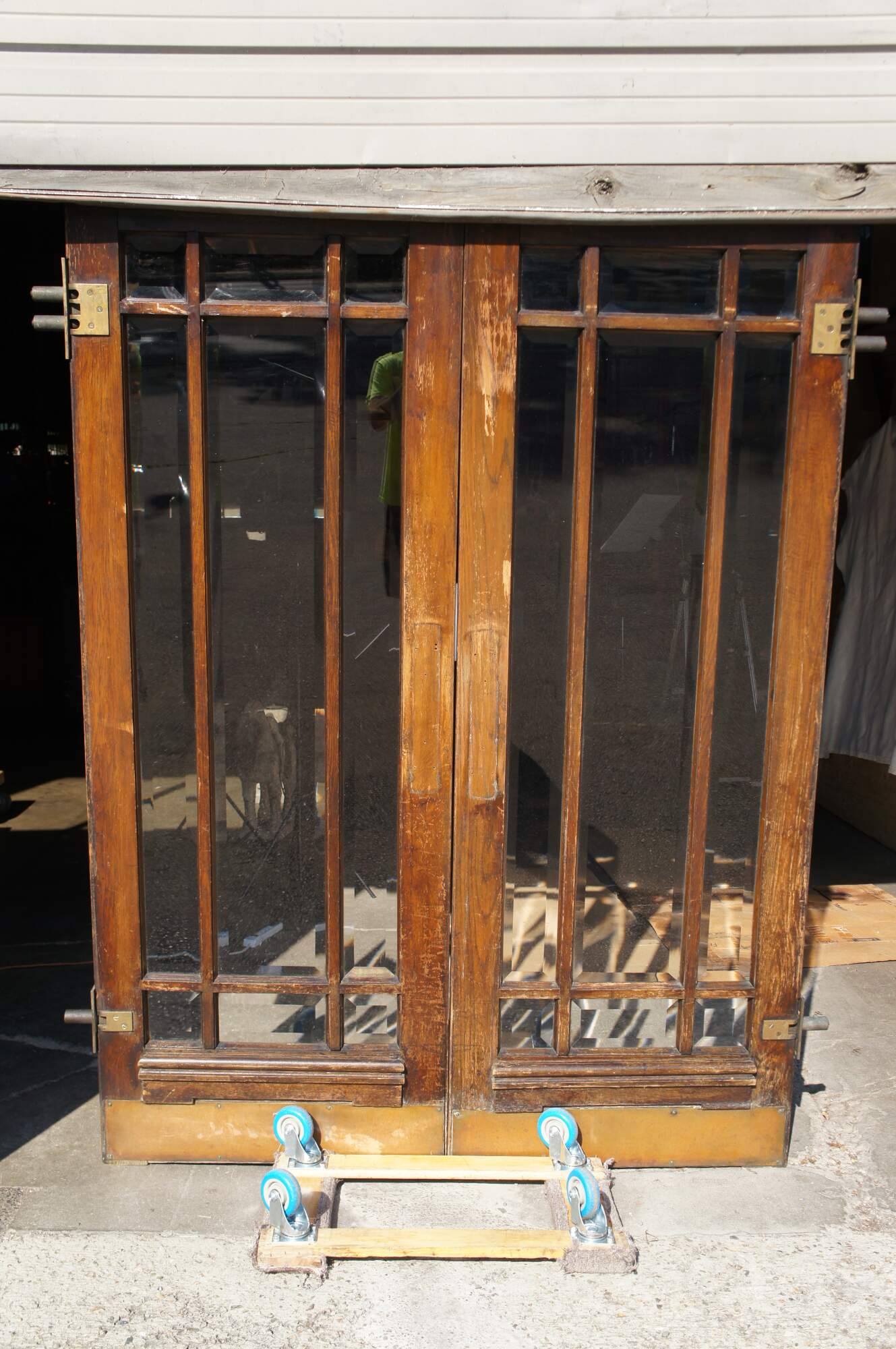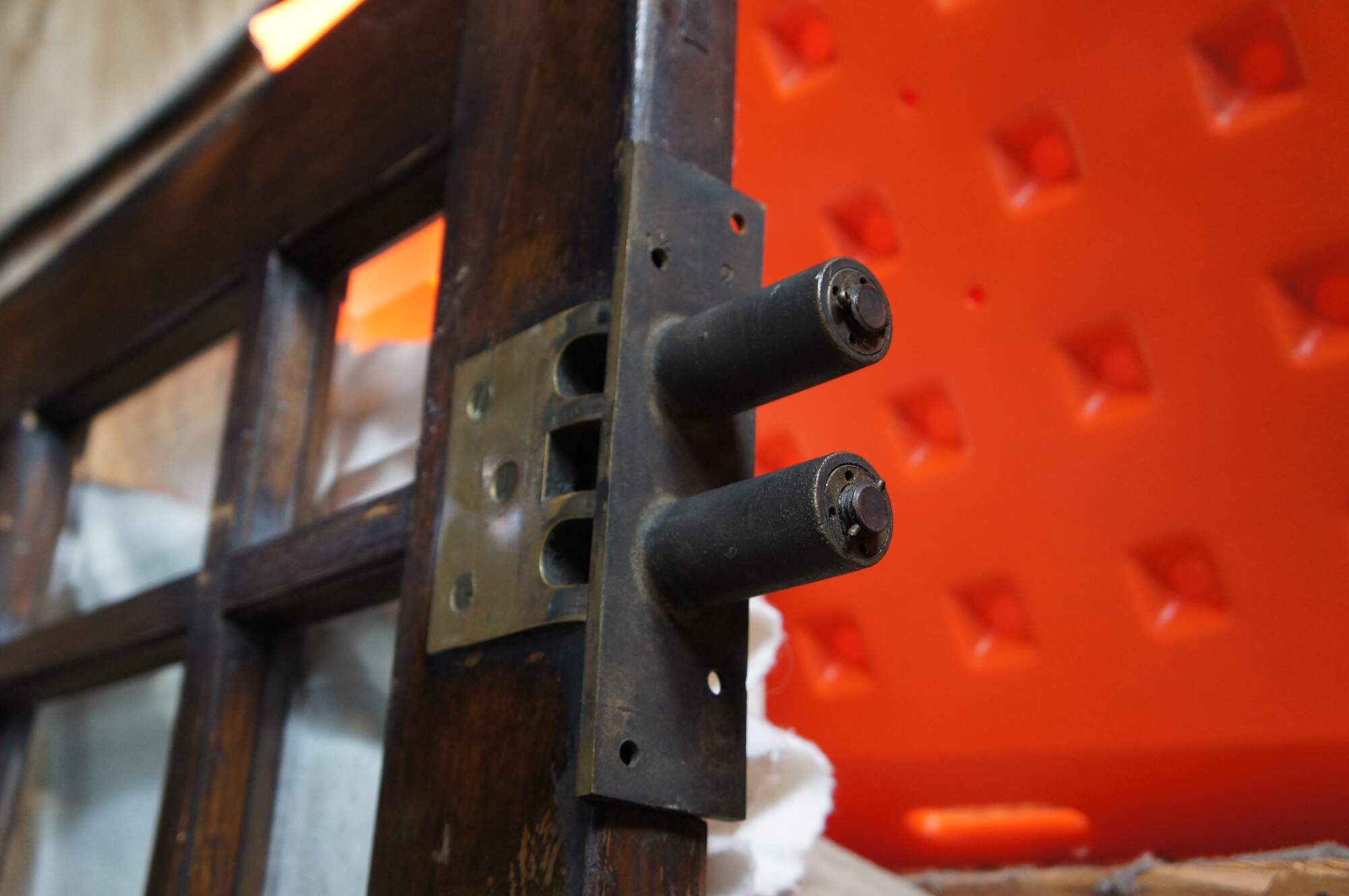 Good Condition; Age and use related wear. Finish loss, marking and scuffing. The doors used to have brass plates along the sides to push opened and closed.