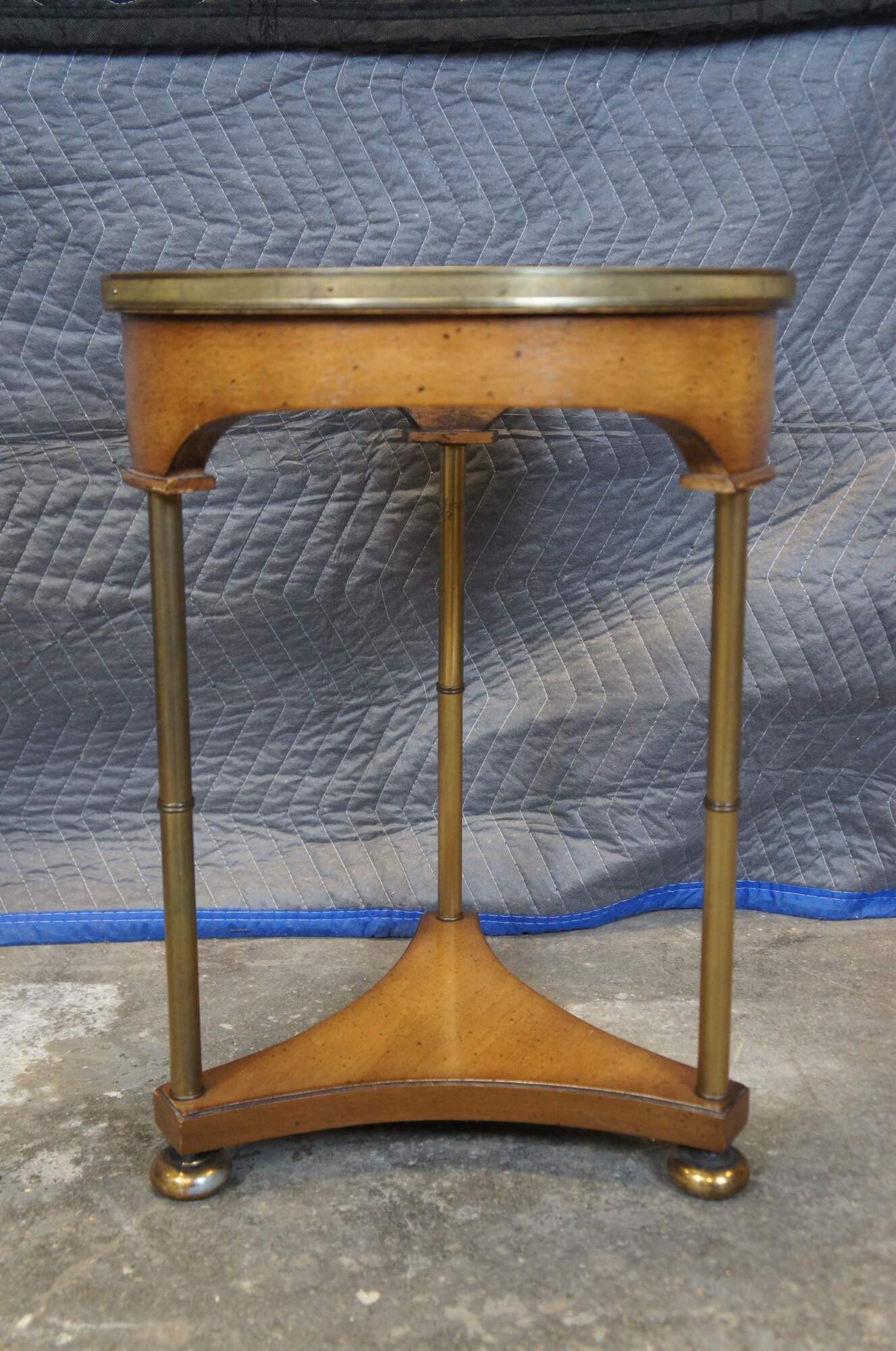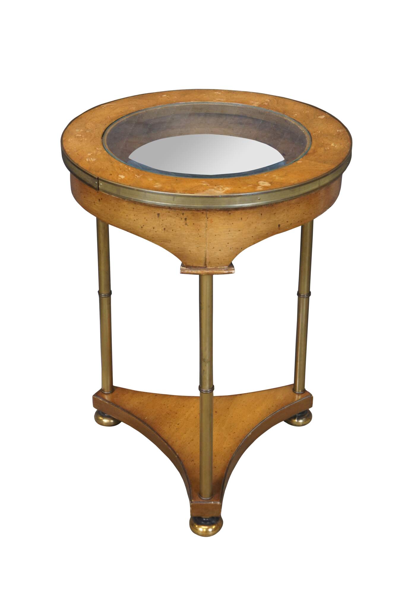 Late 20th century French Empire / Biedermeier / Somno / Bouillotte style gueridon / occasional two tier table. Round form with inset glass top and brass band around the edge, supported on three brass lags leading down to curved triangular base and brass bun feet. Attributed to Bernhard Rohne for Mastercraft.