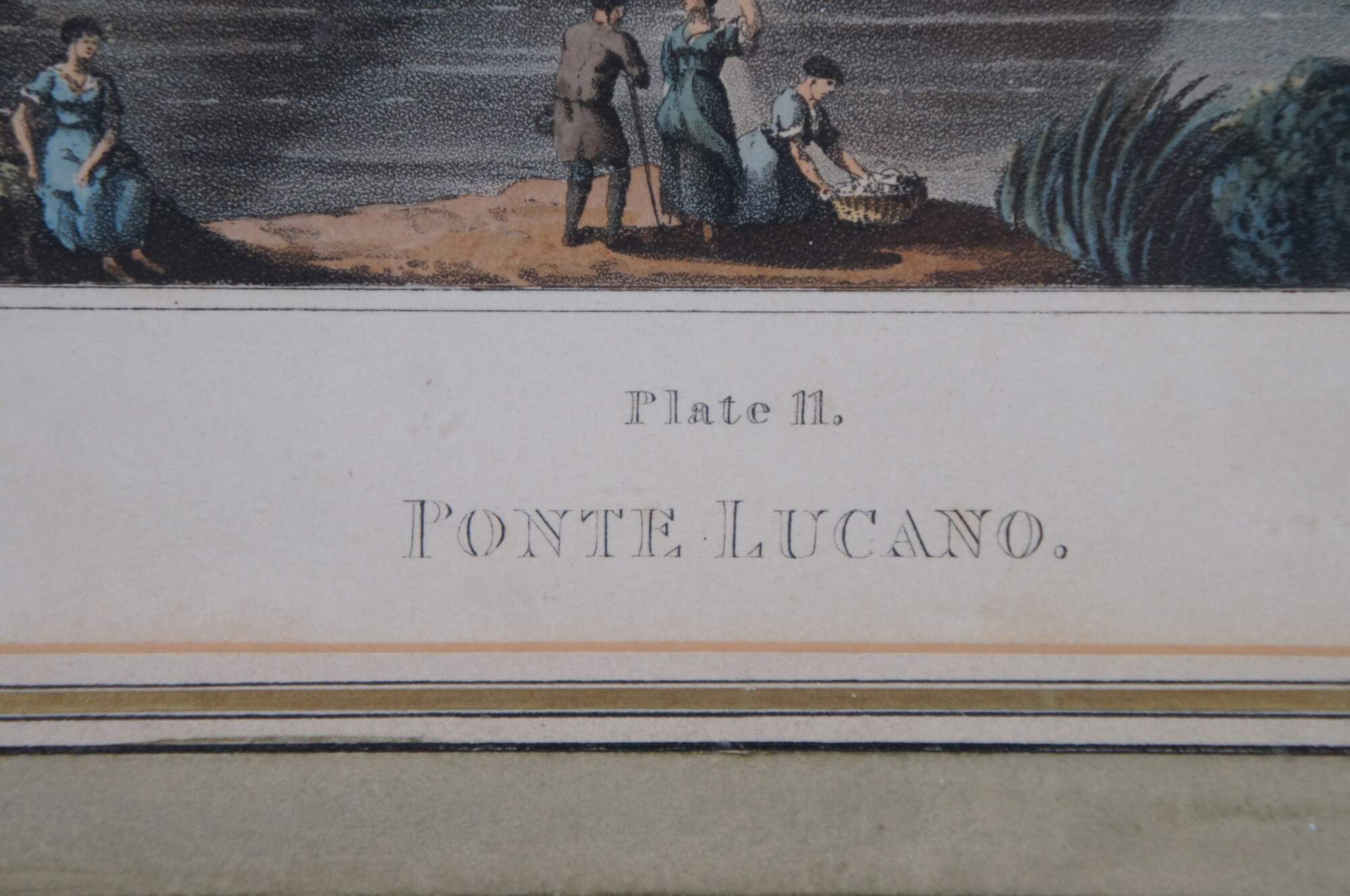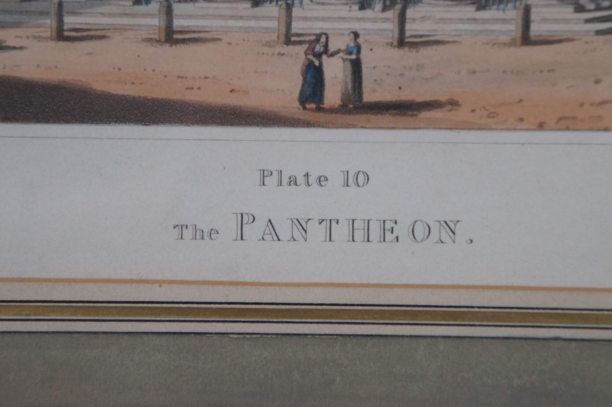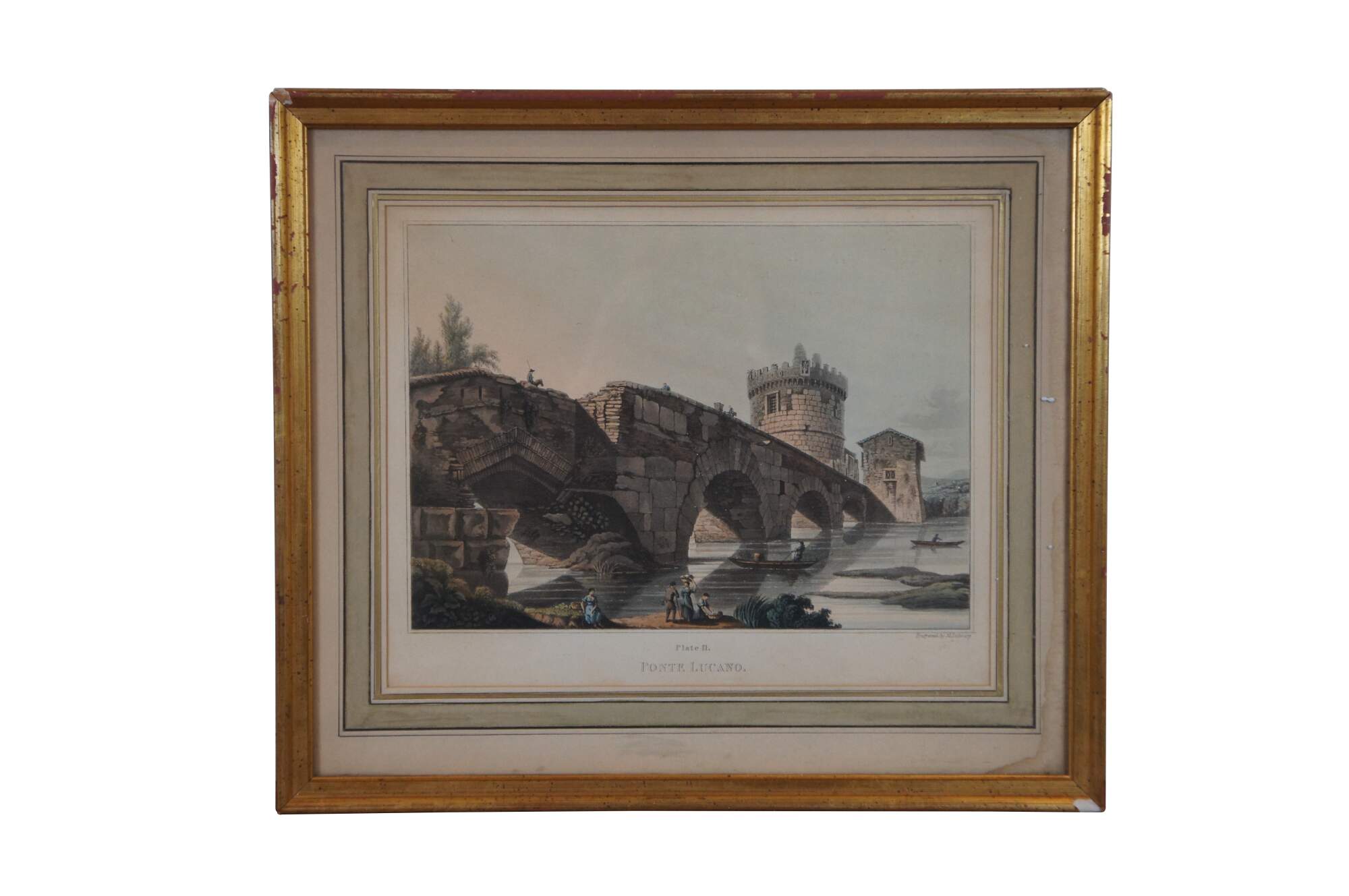 Pair of antique architectural Grecian / Roman aquatint engravings - "Plate 10 - The Pantheon" and "Plate 11 - Ponte Lucano" engraved by Matthew Dubourg, extracted from the book "Views of the Remains of Ancient Buildings in Rome and its Vicinity," first published in 1820. Beveled gilt frame; layered green and white mat with painted borders.