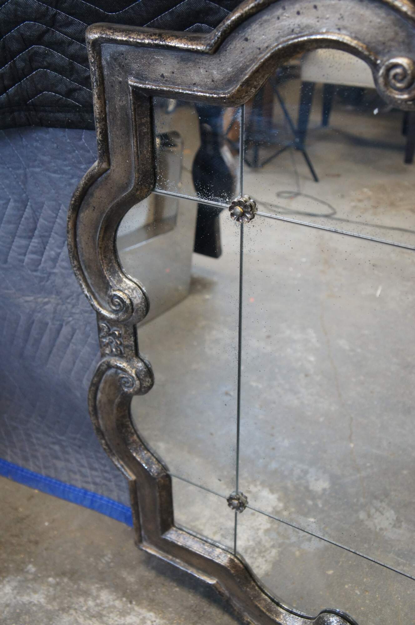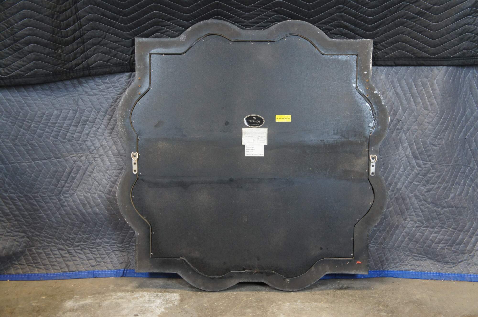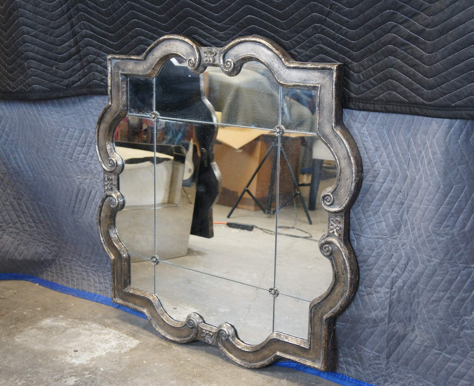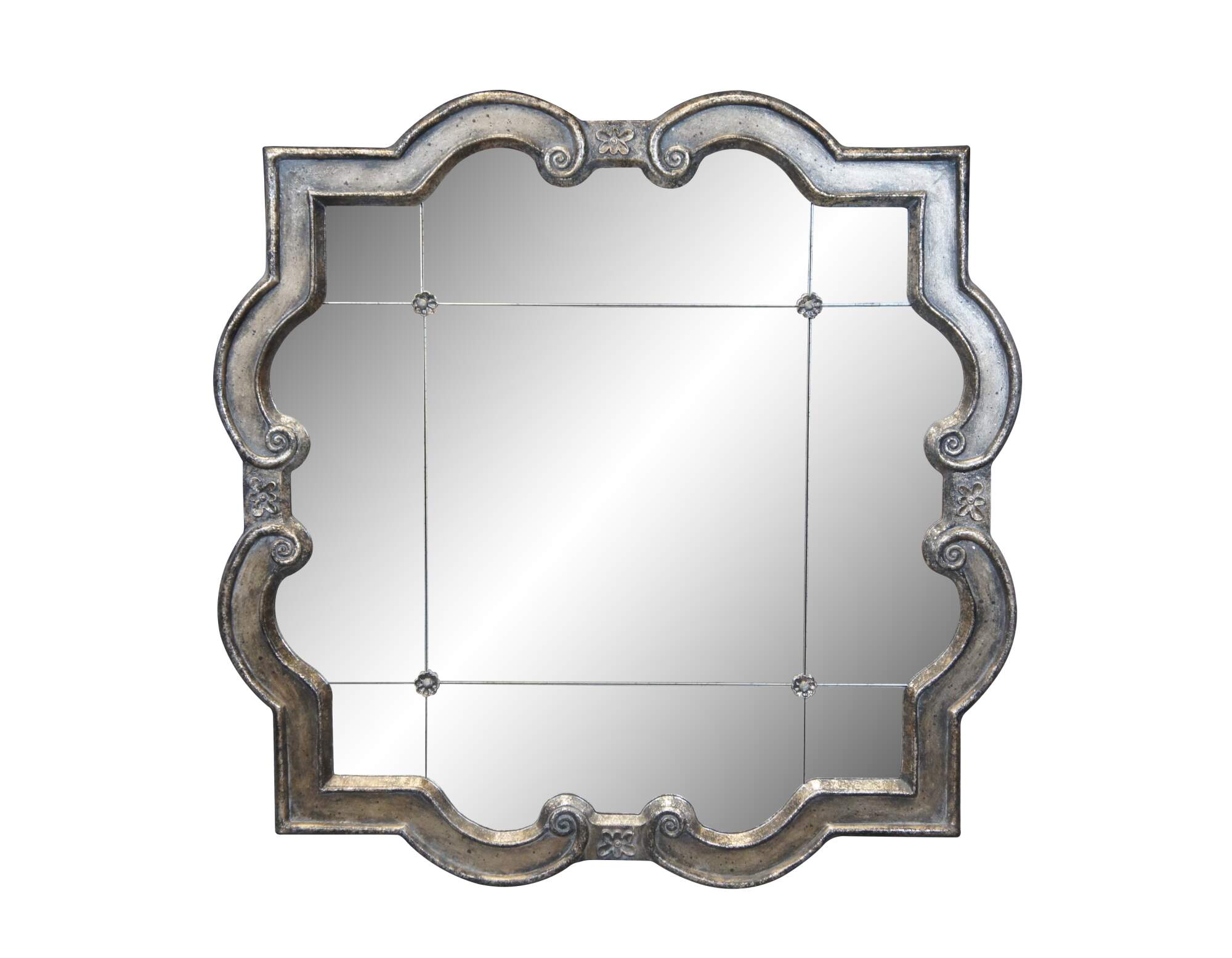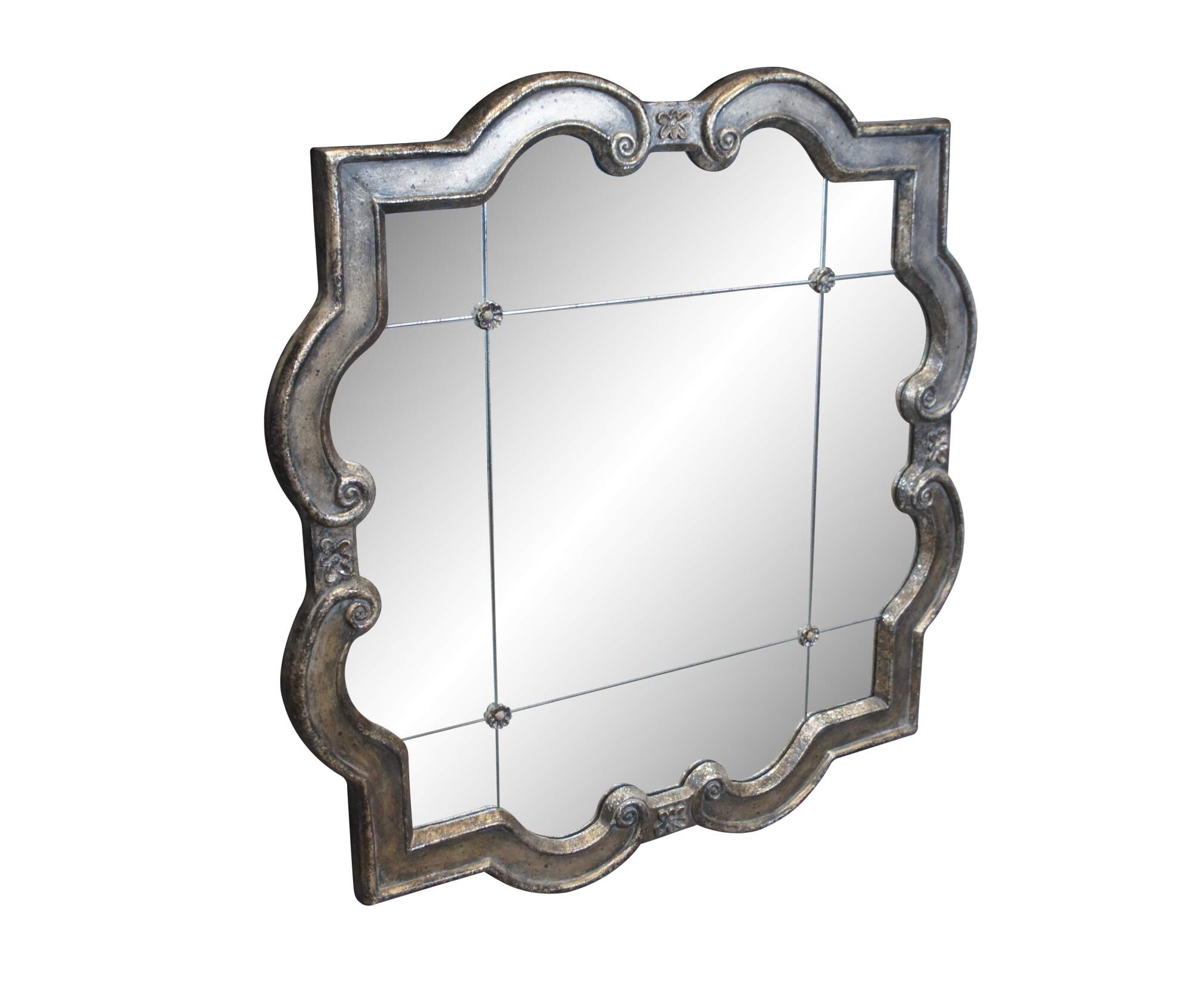Pair of Uttermost model number 12597 P Prisca quatrefoil wall mirrors. Features a paneled architectural design studded with four rosettes and simulated silver loss, framed in antique silver gilt with scrollwork and floral details. Discontinued design.