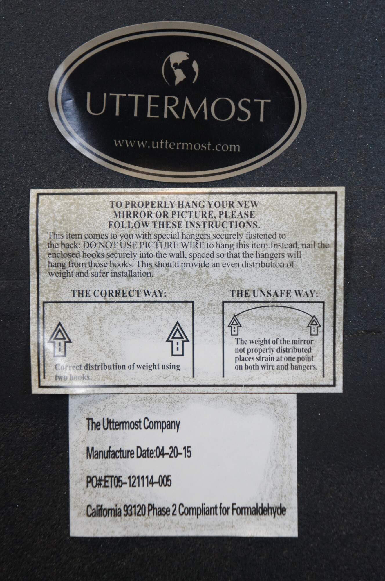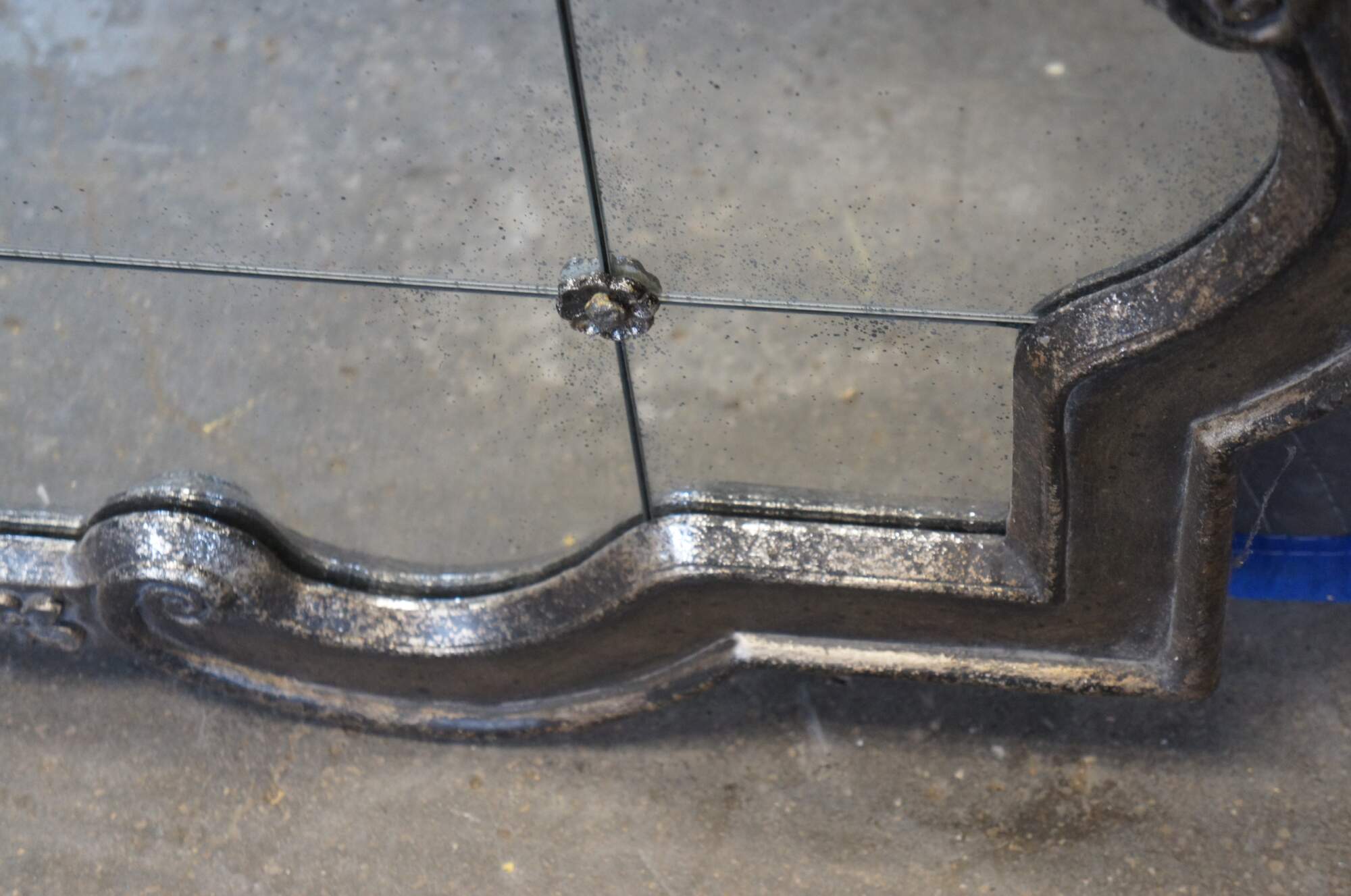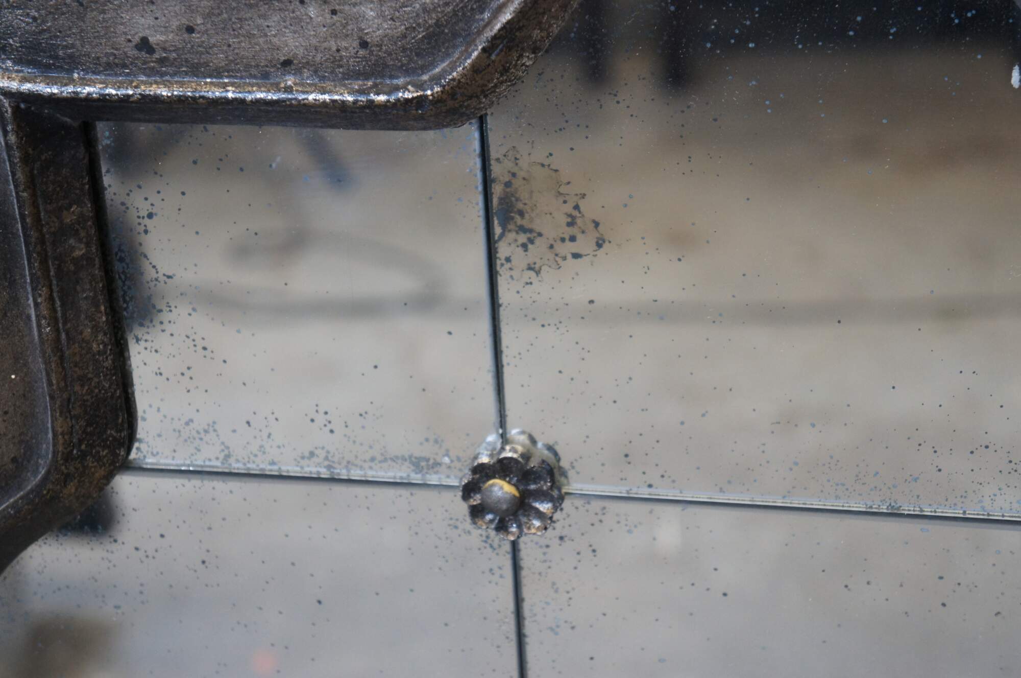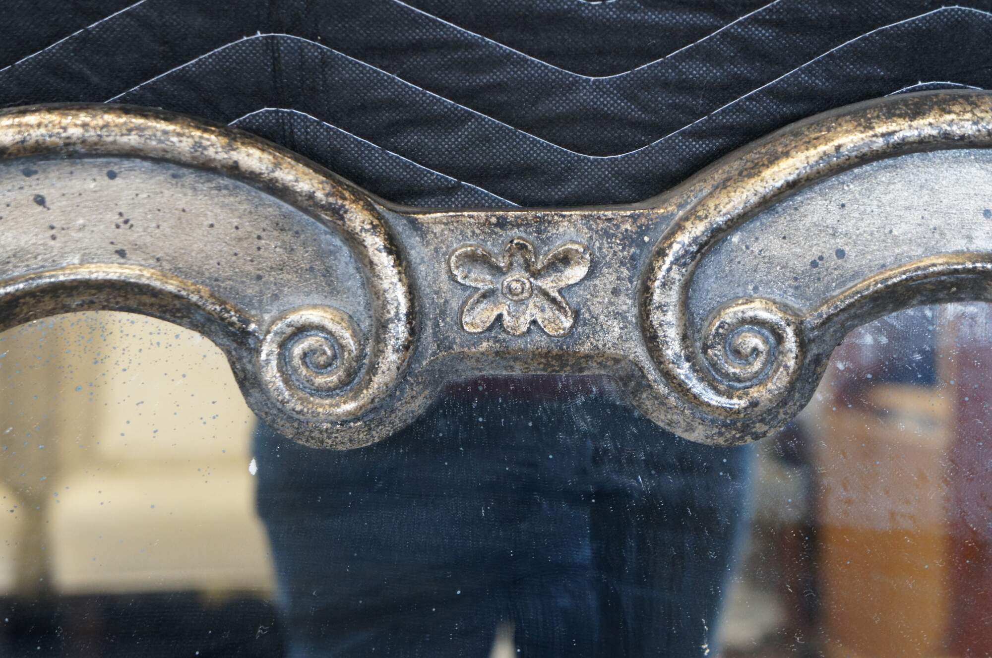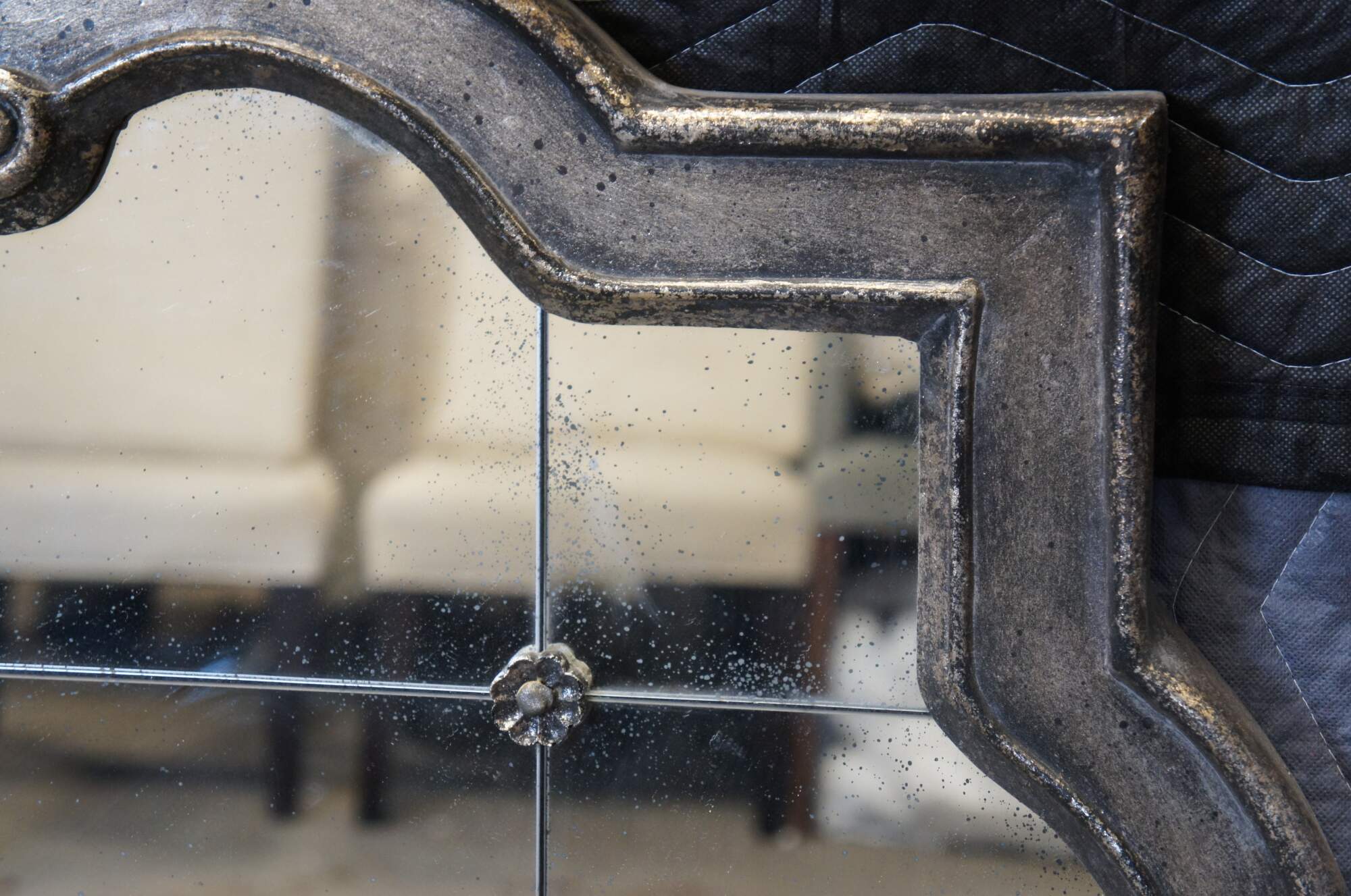 Pair of Uttermost model number 12597 P Prisca quatrefoil wall mirrors. Features a paneled architectural design studded with four rosettes and simulated silver loss, framed in antique silver gilt with scrollwork and floral details. Discontinued design.